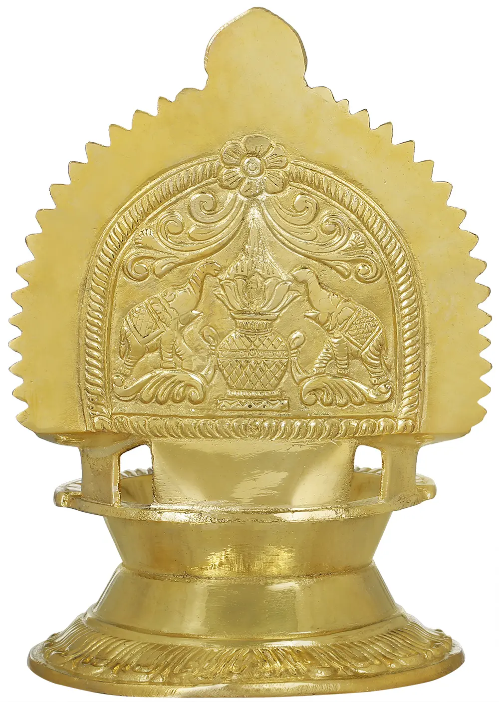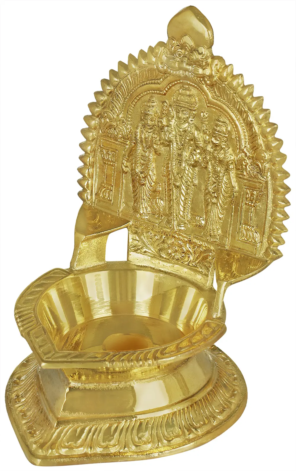 Crafted from high-quality brass, this lamp showcases the traditional metalworking techniques passed down through generations in South India. The lustrous finish of the brass enhances the intricate carvings and the divine aura of the figures. Each detail, from the facial expressions to the divine attributes held by the deities, is rendered with meticulous care, reflecting the skill and devotion of the artisans. This lamp is not merely a decorative item; it is a piece of cultural heritage, connecting you to the spiritual and artistic legacy of one of India's most vibrant regions. Its presence can transform your home into a sanctuary of peace and devotion, radiating divine energy and aesthetic beauty.