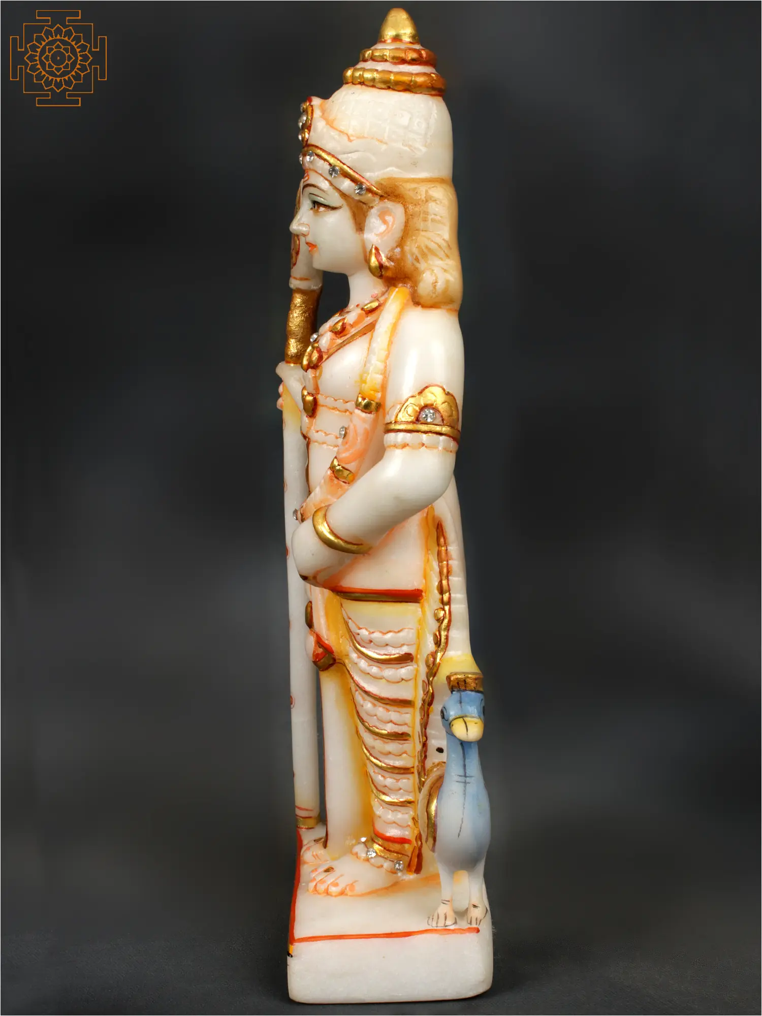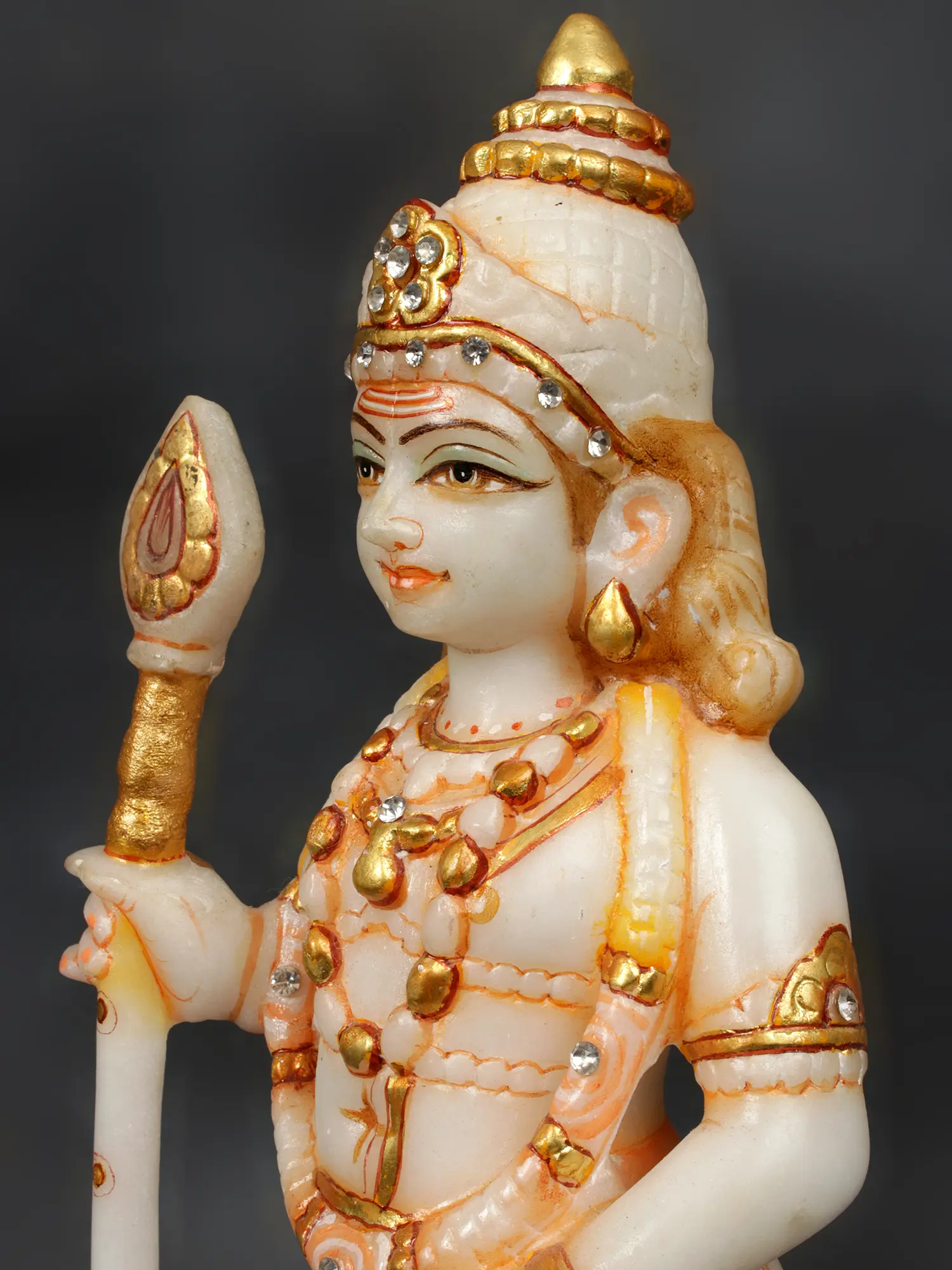 This exquisite white marble statue captures the divine presence of Kartikeya, also known as Murugan Swami, the revered Hindu god of war and victory. Carved with meticulous detail, the statue radiates an aura of power, grace, and unwavering resolve. Kartikeya, son of Lord Shiva and Goddess Parvati, is a prominent deity in South India, celebrated for his courage and his role in vanquishing the demon Surapadman. He is often depicted as a youthful and handsome warrior, leading the celestial armies against the forces of evil. The sculptor has masterfully rendered the deity in a posture of authority, holding his divine weapon, the Vel, a spear symbolizing spiritual knowledge and destructive power. The serene yet determined expression on Kartikeya's face speaks volumes of his divine attributes. Adorned with intricate jewelry, including necklaces and armbands, and dressed in ornate attire, the statue showcases the deity's royal lineage and divine splendor. The white marble, chosen for its purity and luminosity, enhances the sacredness and timeless beauty of the sculpture.