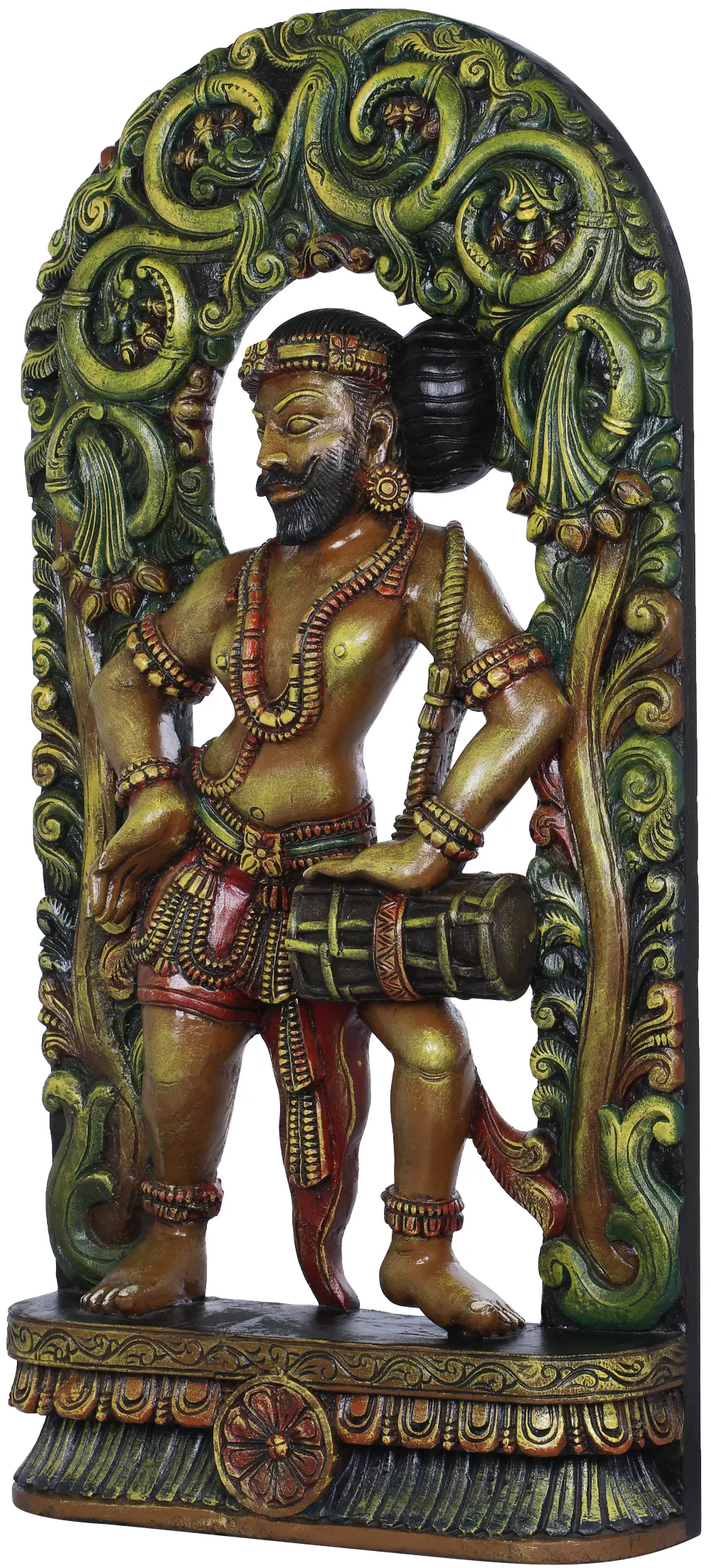 Sculpted from a solid block of wood and finished in an earthy colour palette. The Khajuraho musician is standing on a pedestal of inverted and elongated lotus petals. A statement flower motif on the midline of the same. The aureole surrounding the figure is a thickly curving panel of luscious green vine, the colour palette of which comprises seductive shades and tints of green and gold. The same is interspersed with richly coloured fruit and flowers. It is symbolic of the plenitude of the evergreen forests of the region where this sculpture has been made.