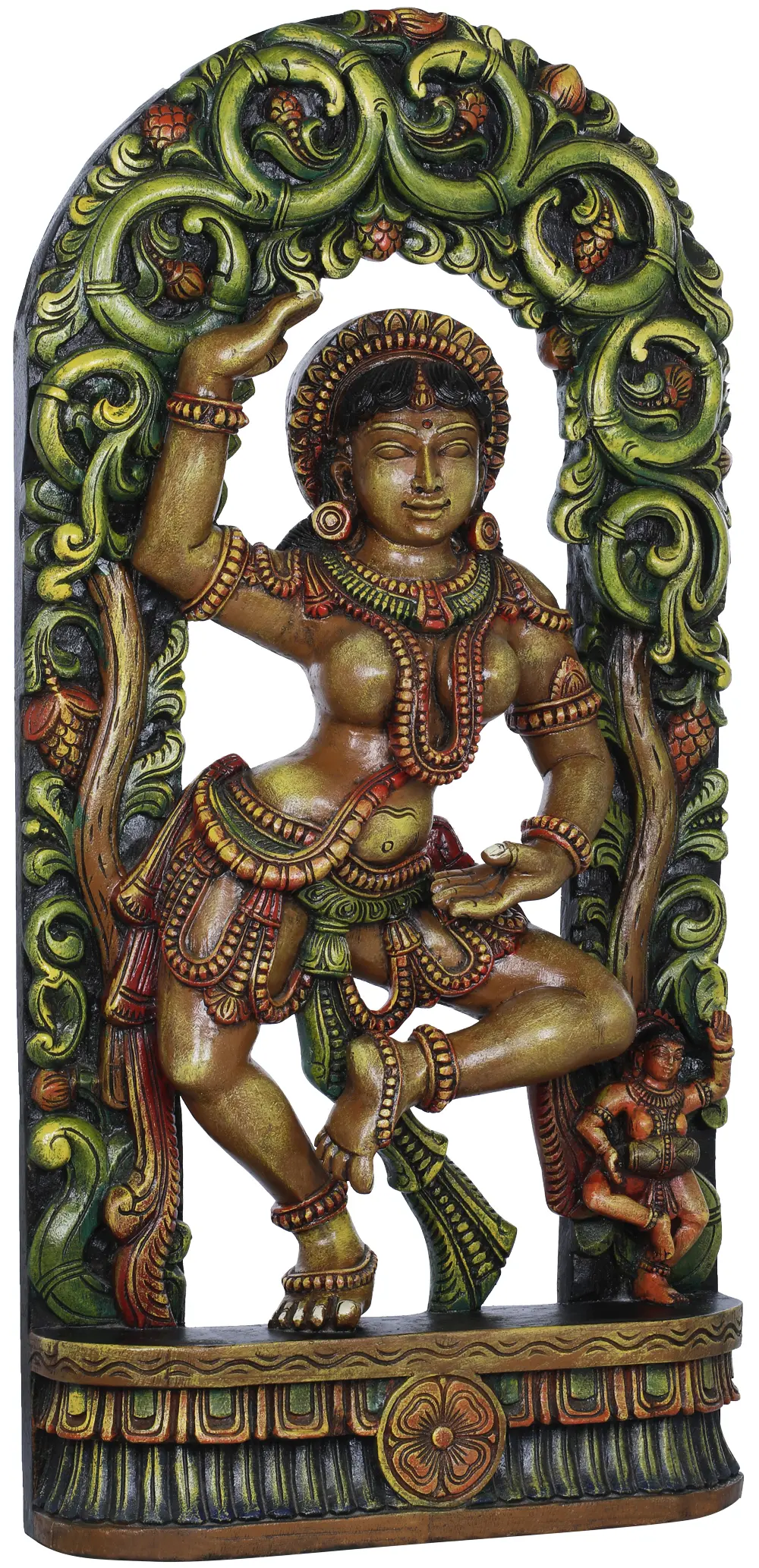 The dancing maidens of Lord Indra’s court are the celestial nymphs who are considered to be extremely charming and beautiful who can woo the gods and men with their talent of music and dance and captivating seductiveness. This one shown here is carved out of a fine quality wood in contrasting bright colors of a yellow-gold body framed in an arch of bright green color depicting the lush green leaves and colorful flowers. This beautiful apsara dances on a lavish floral carved pedestal highlighted with a large flower in the centre. The exquisite posture of her legs and arms along with that flexible bent of her waist highlights it being inspired by the erotic sculptural art of Khajuraho monuments.