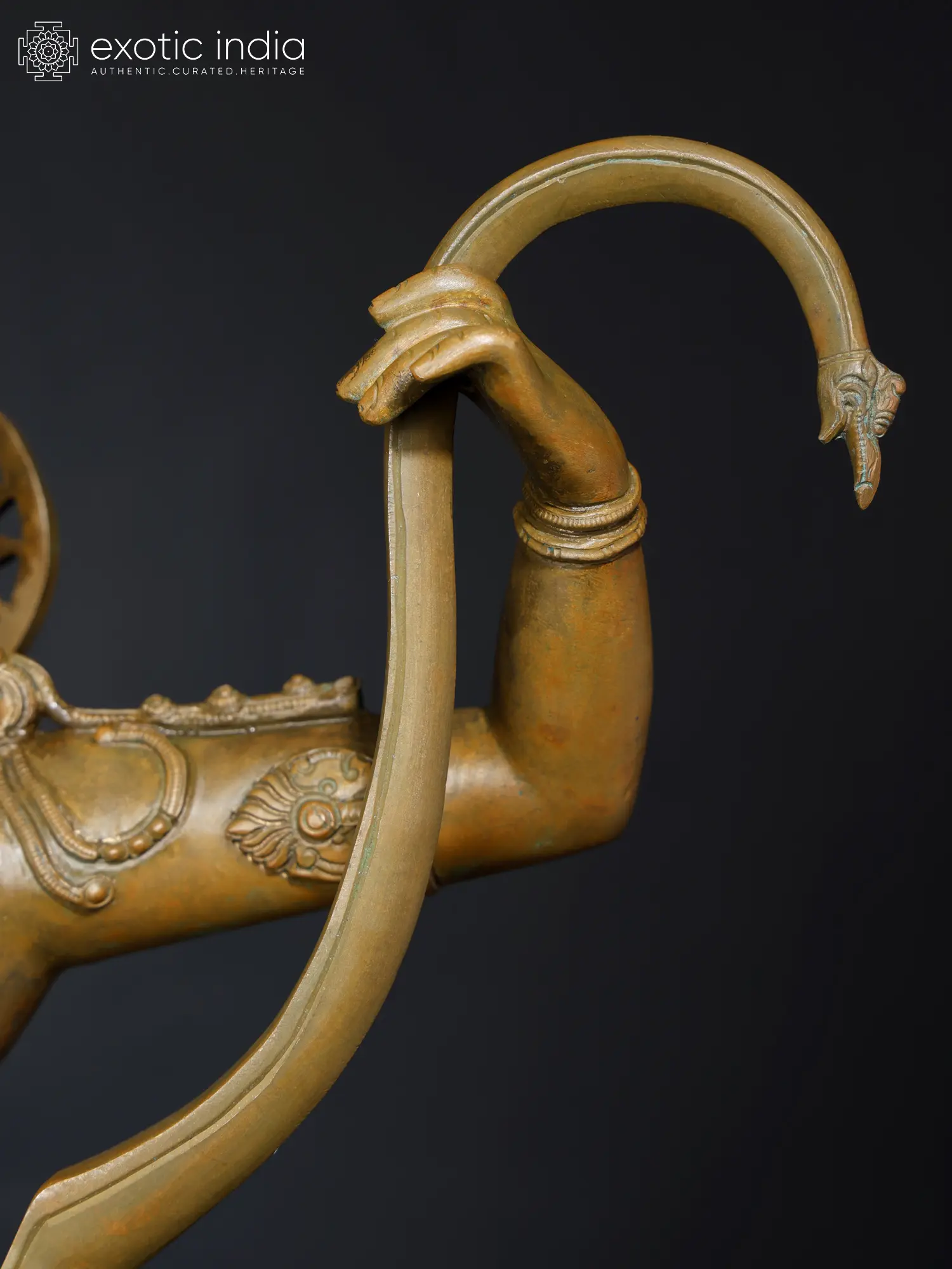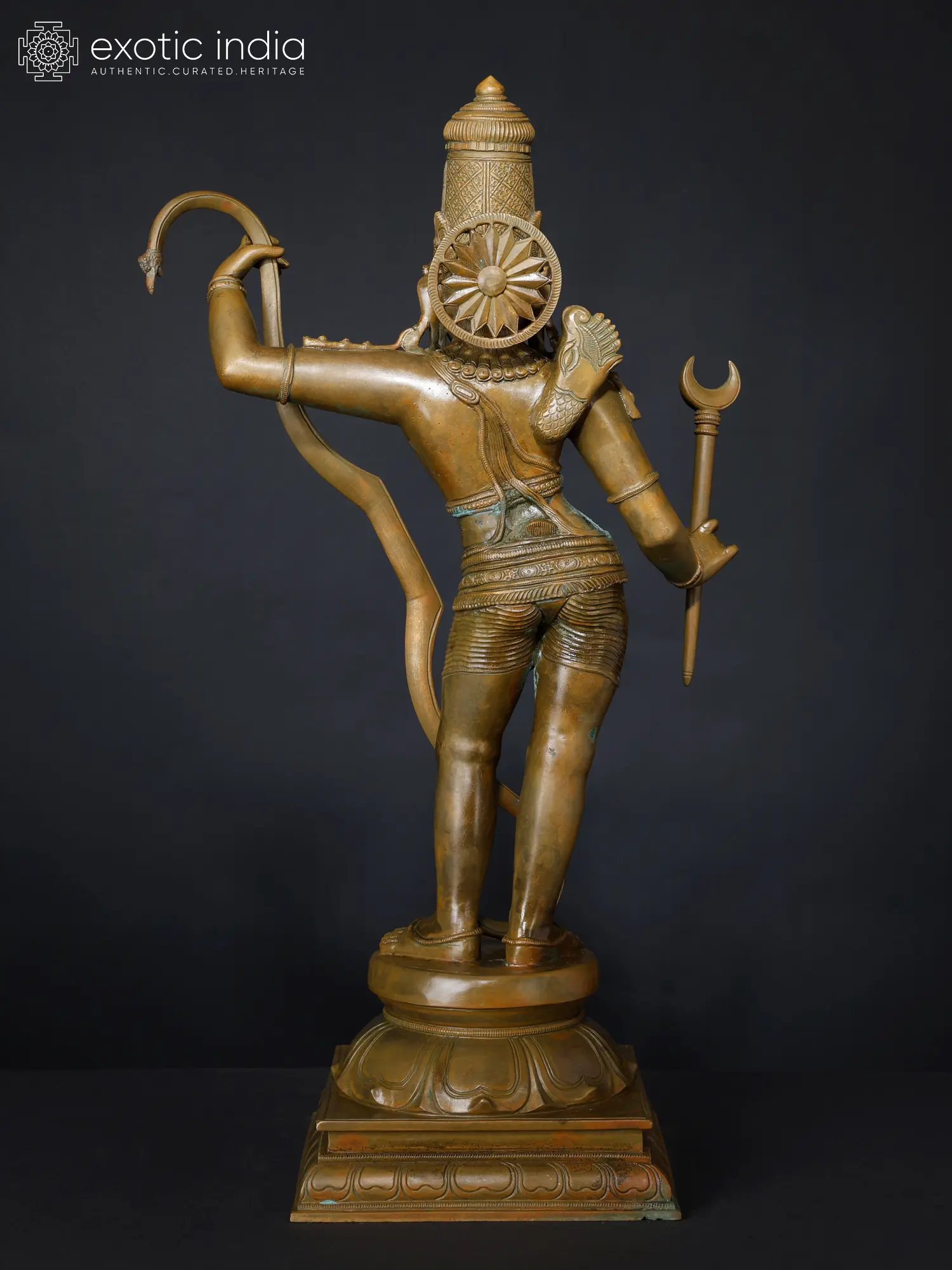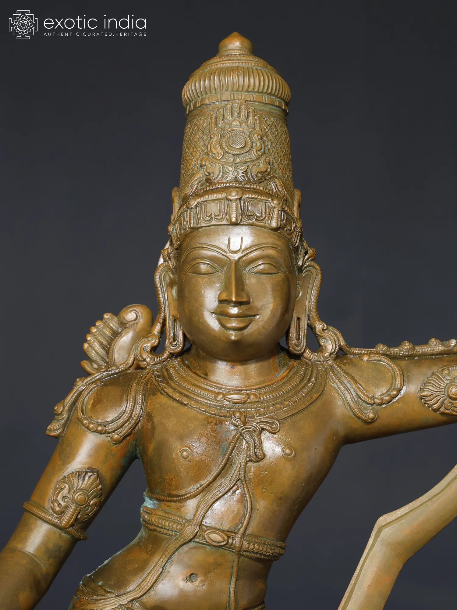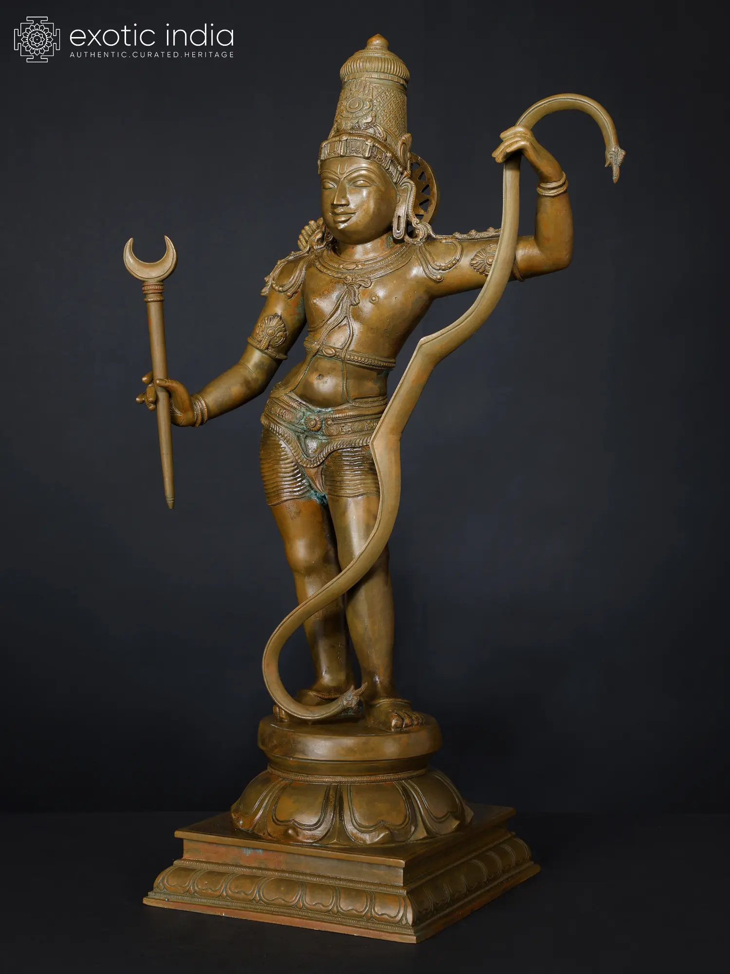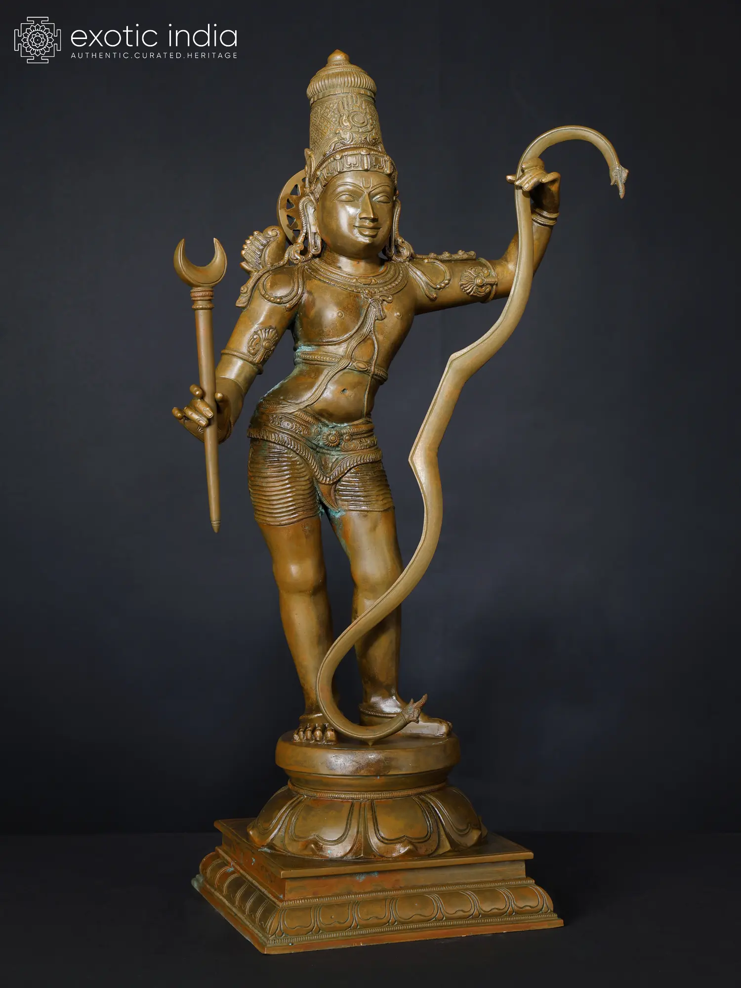 The warrior-prince of Ayodhya, in whom beauty and valor are perfectly balanced appears in this marvelous bronze statue. The sculpting of his weapons also carries an exquisiteness, making the powerful bow and arrow appear alluring, as if infused by the sweetness of he who holds them.