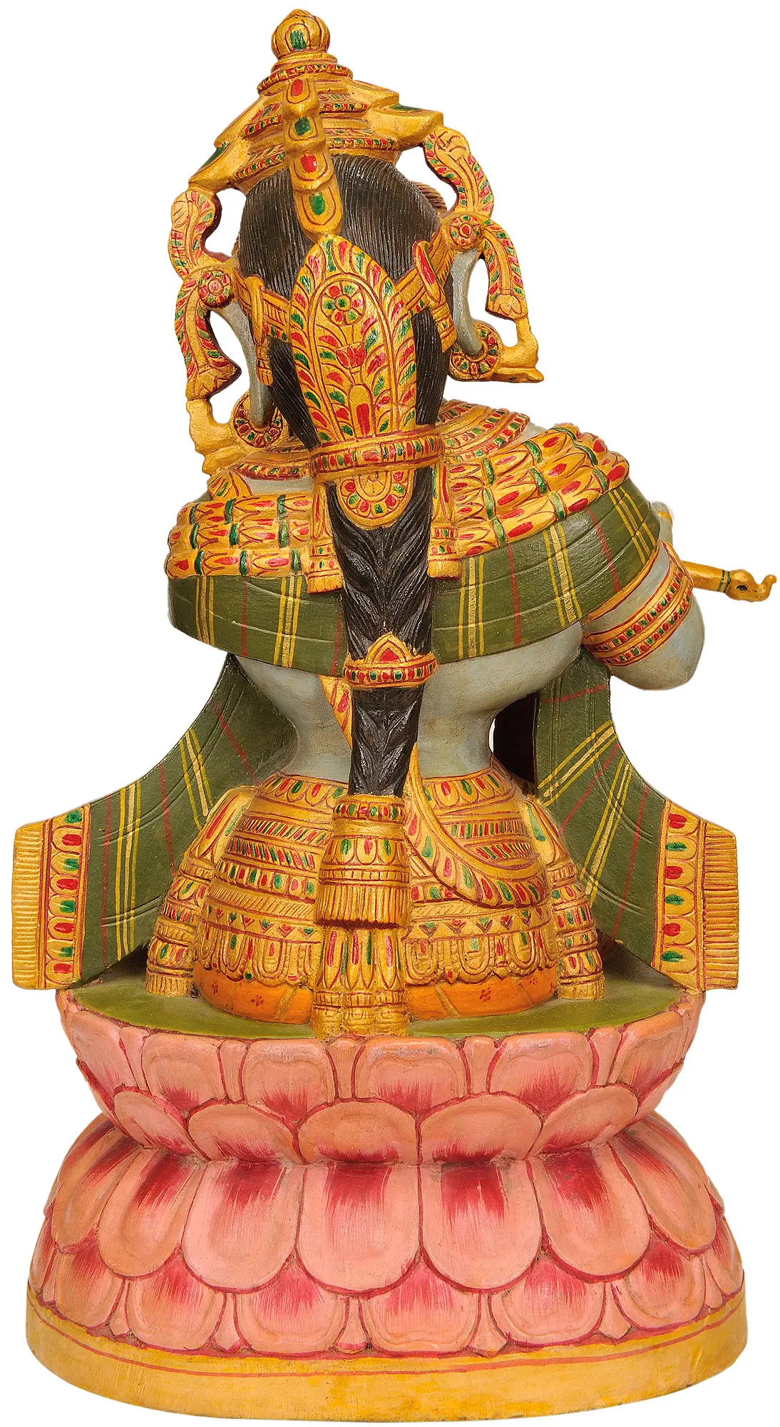 Each element of this statue has been painstakingly carved and painted by skilled artisans, continuing a rich tradition of devotional art. The delicate features of Krishna’s face, his serene expression, and the graceful posture all convey a sense of divine peace and gentle power. The vibrant colors and ornate patterns are not merely decorative; they are imbued with symbolic meaning, reflecting the opulence and divine glory of the deity. This statue is more than just an object of art; it is an embodiment of faith, a focal point for meditation, and a beautiful reminder of the transformative power of divine music and love. It serves as a perfect addition to any altar, meditation space, or as a statement piece to infuse your home with a touch of divine serenity and artistic brilliance.