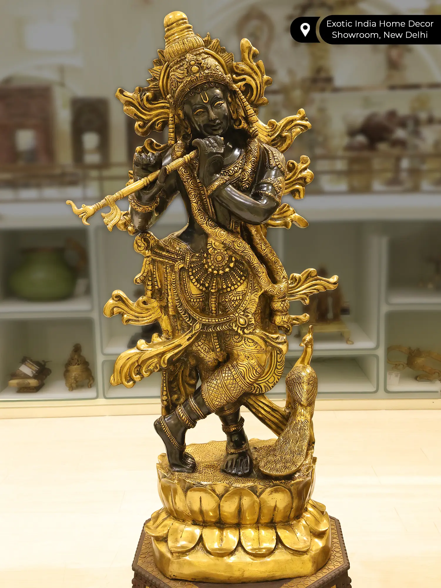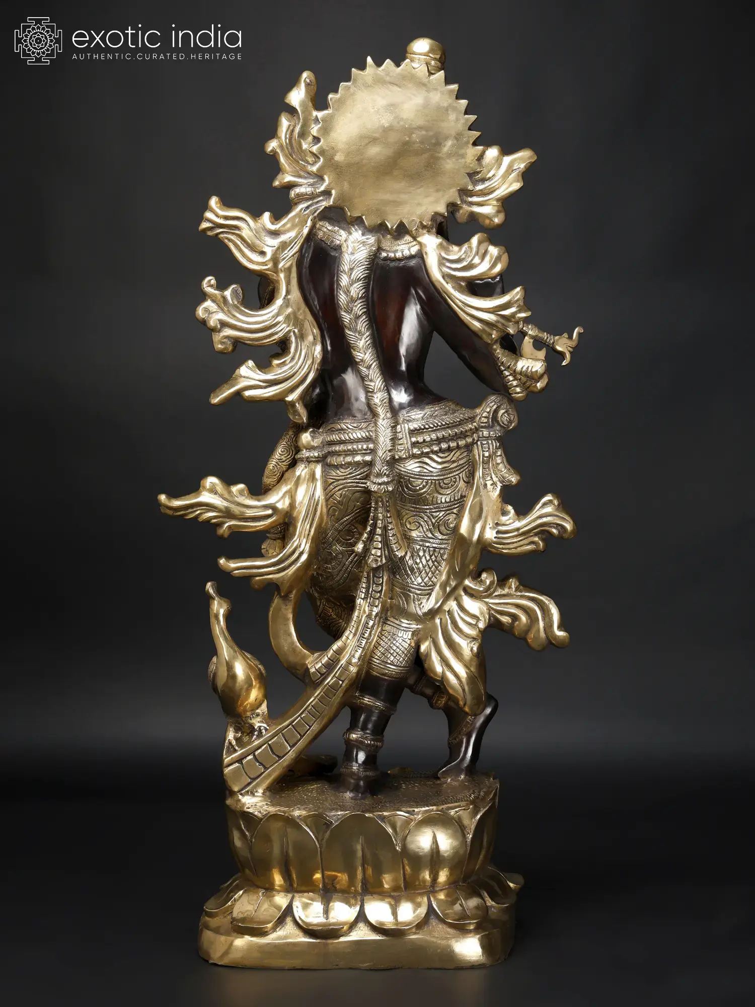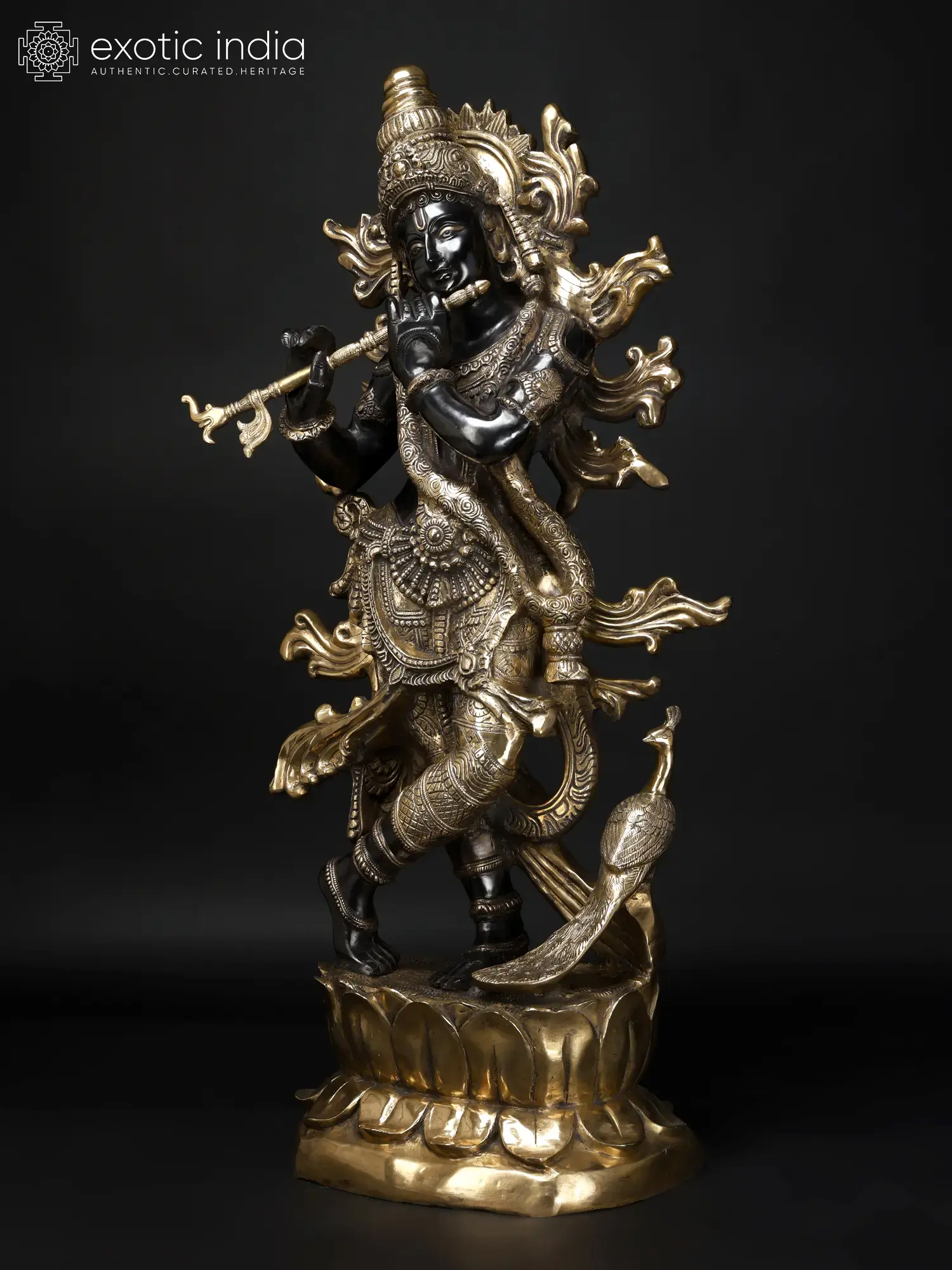 Krishna’s Inimitable Magnificence (Large Murli Manohar Lord Krishna Brass Statue Standing on Lotus with Peacock)