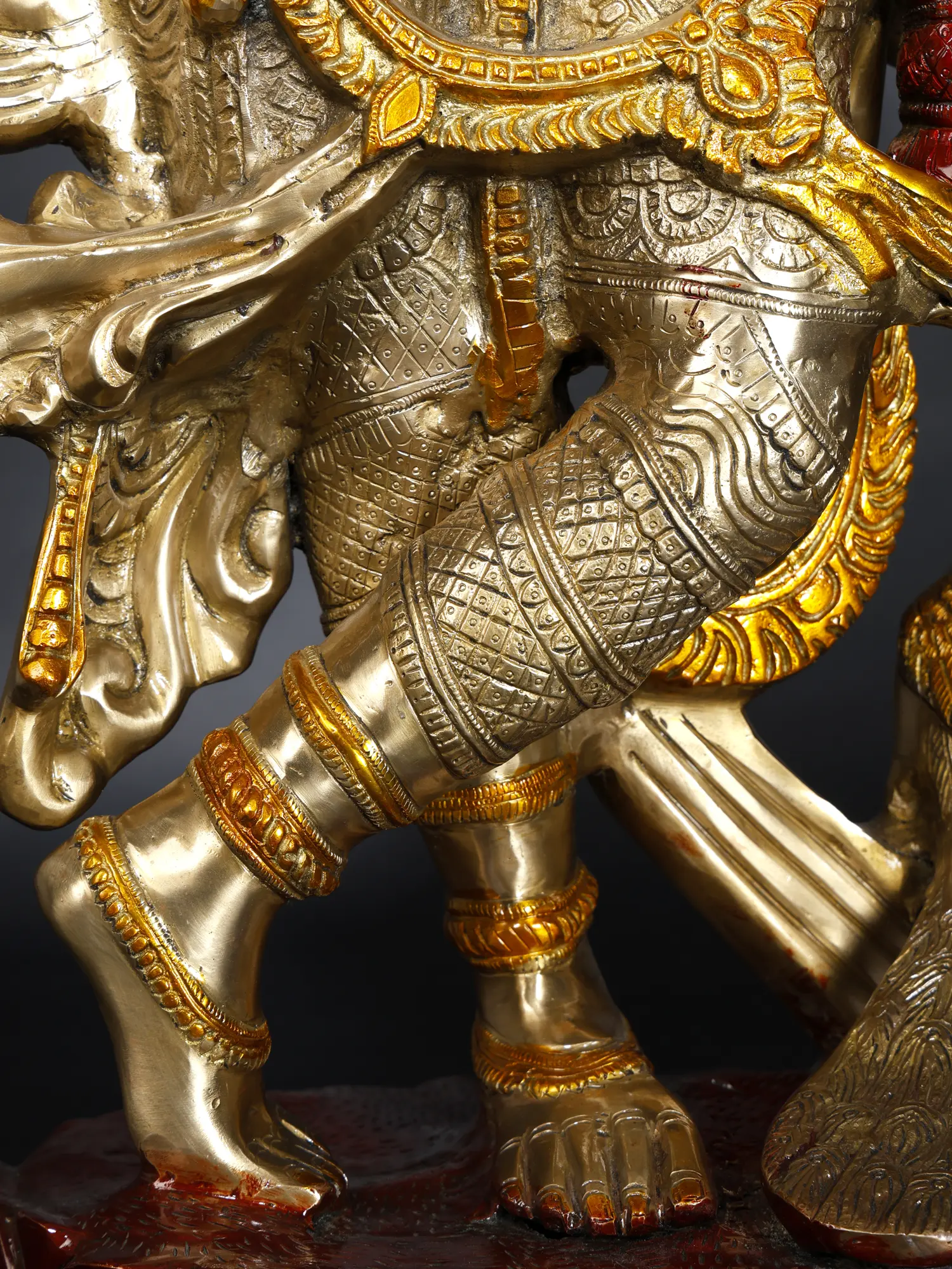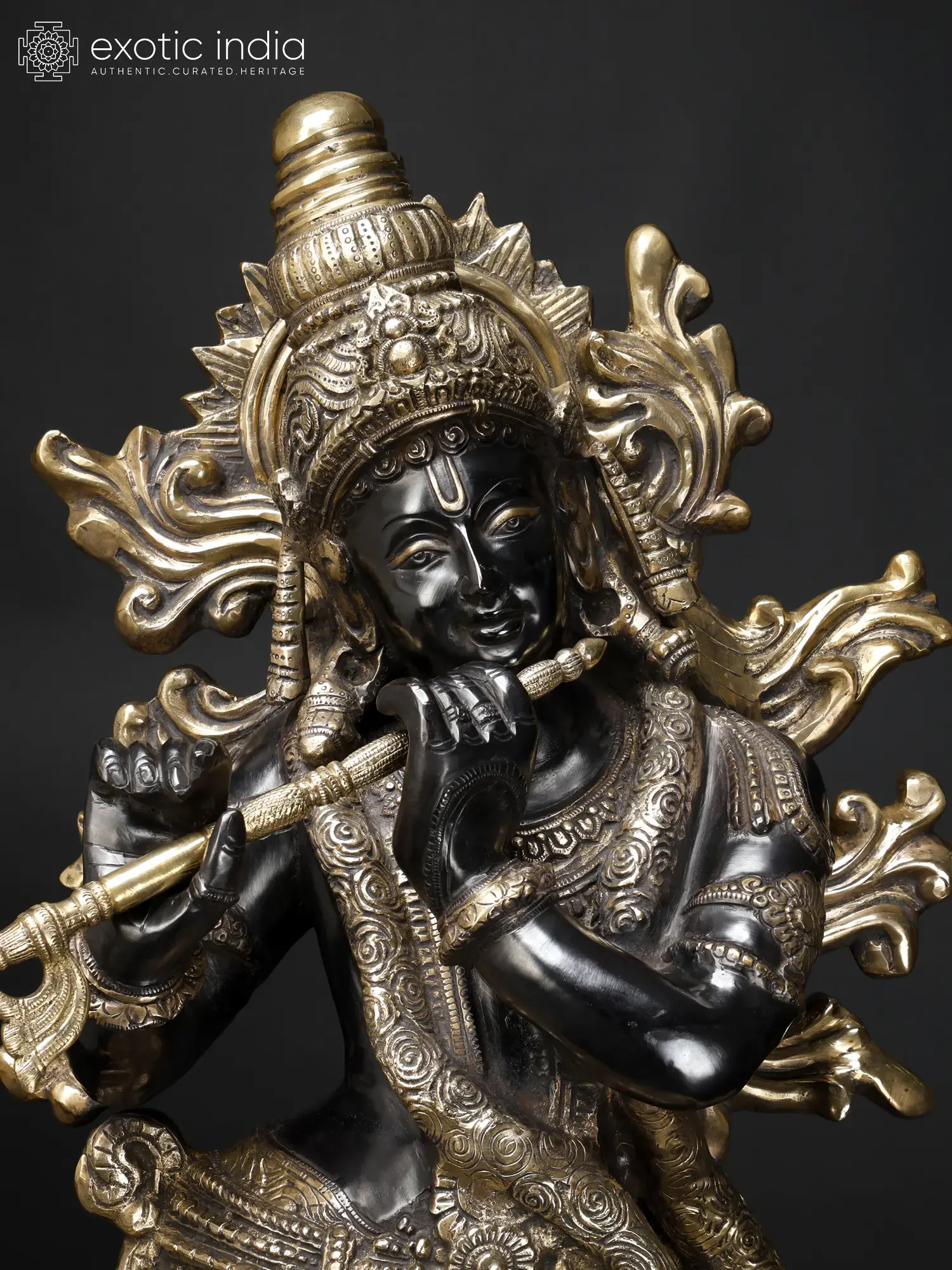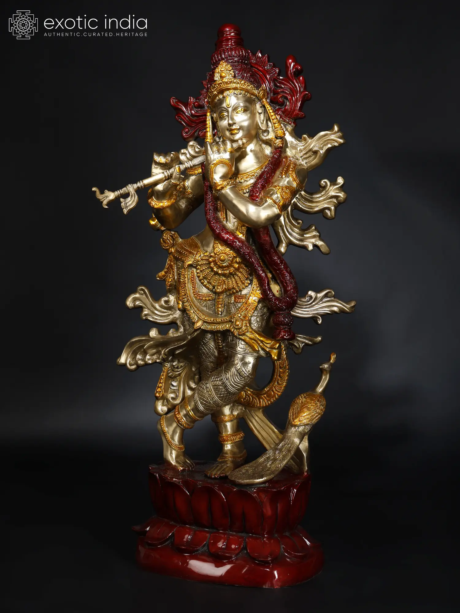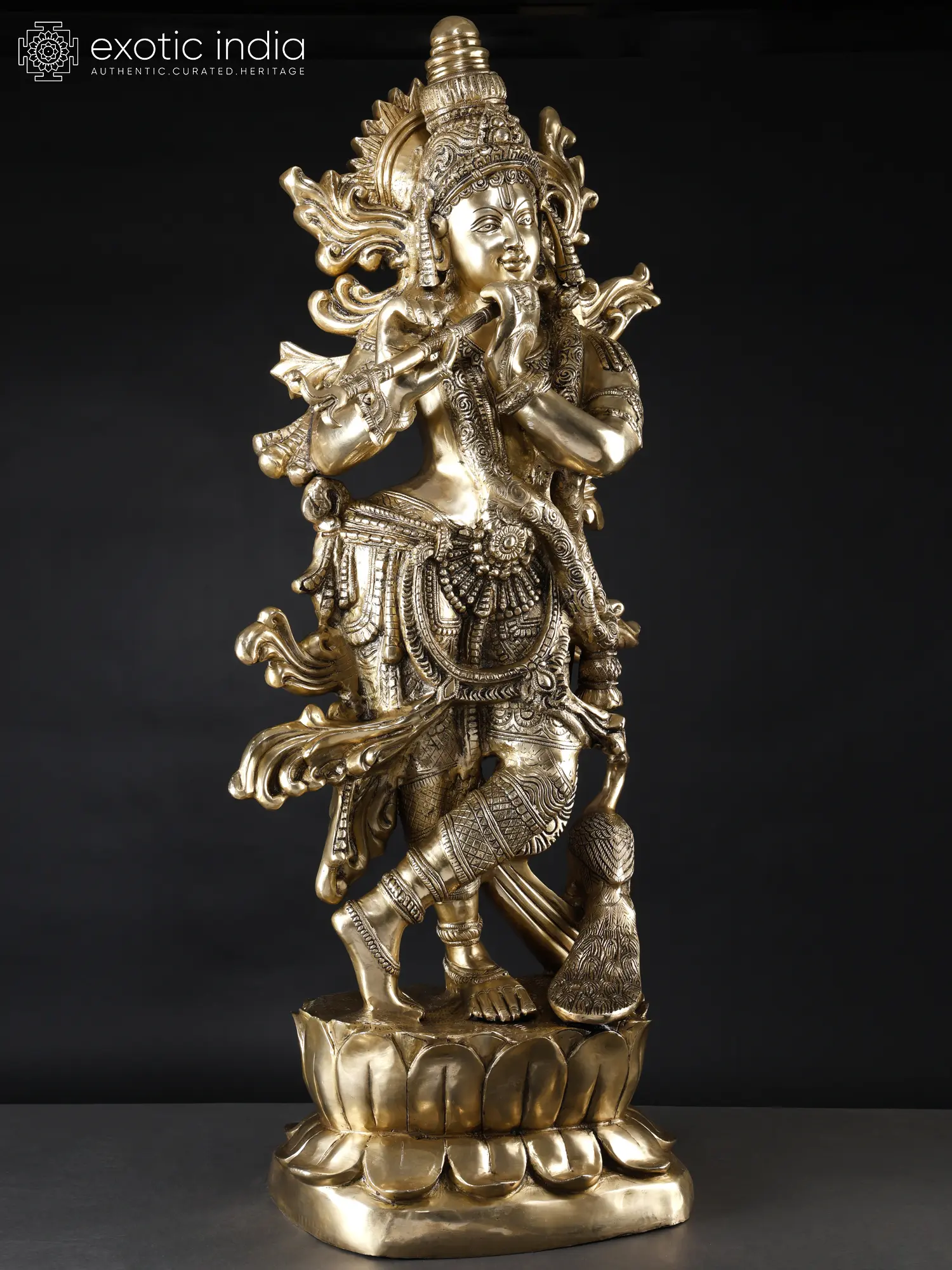 This breathtaking 48 x 21 x 12.5-inch brass statue captures the divine essence of Lord Krishna, the beloved eighth avatar of Vishnu in Hindu mythology. The exquisite detailing and masterful craftsmanship bring to life the playful yet profound nature of this iconic figure. Krishna, depicted here in his enchanting *Murli Manohar* form (the one who plays the flute), stands gracefully upon a lotus blossom, a symbol of purity and divine creation. The dark patina of the brass lends a regal aura, beautifully contrasted with the gold highlights that accentuate the intricate carvings of his garments and the majestic peacock at his side. The statue's sheer size commands attention, making it a truly captivating centerpiece for any home or temple.