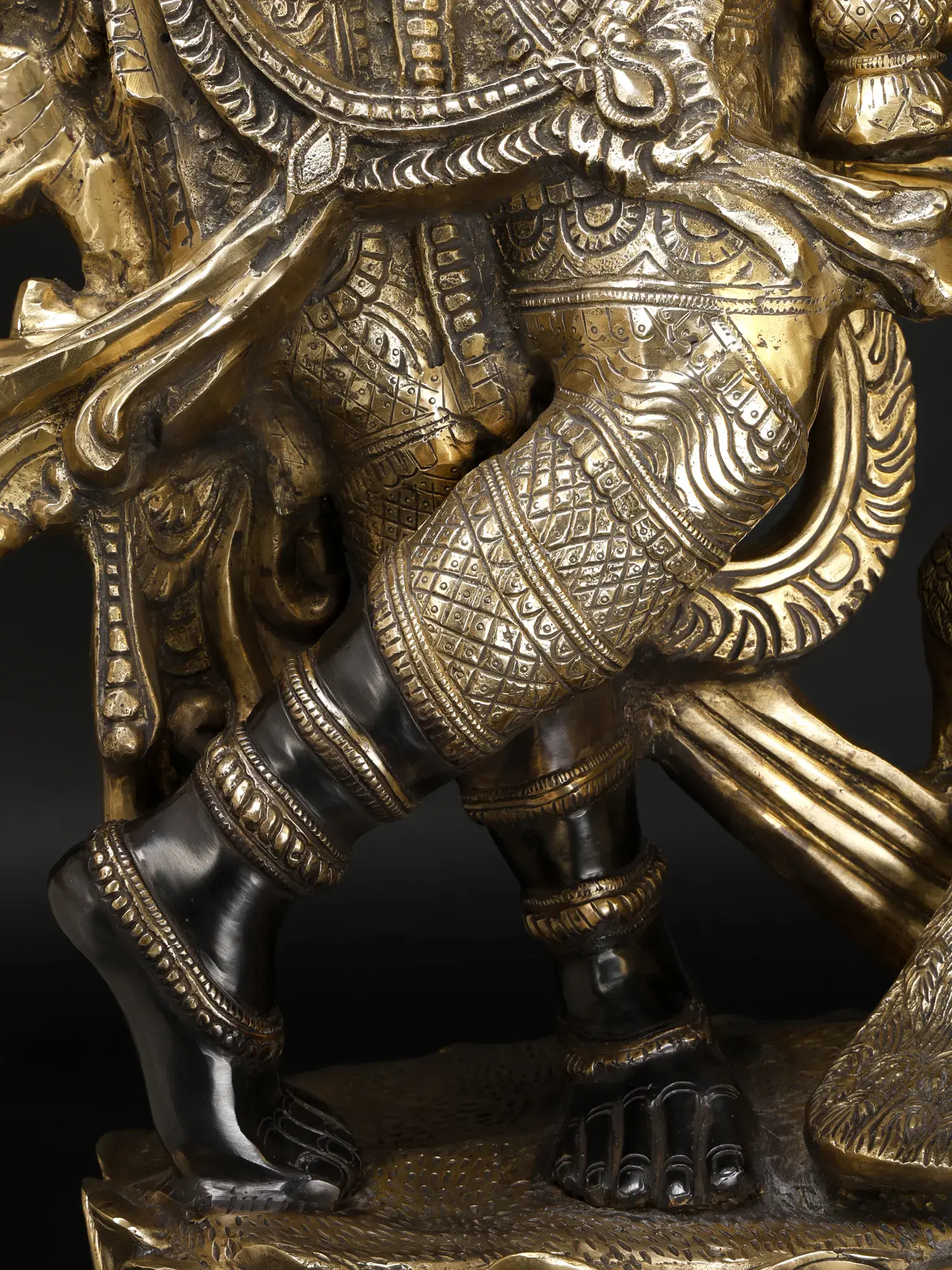 Krishna’s lotus feet are carried by an exquisite blooming lotus, a pedestal for his form shared by the peacock, a representation of love and beauty whose ethereal charm is a mirror of Krishna’s inimitable magnificence.