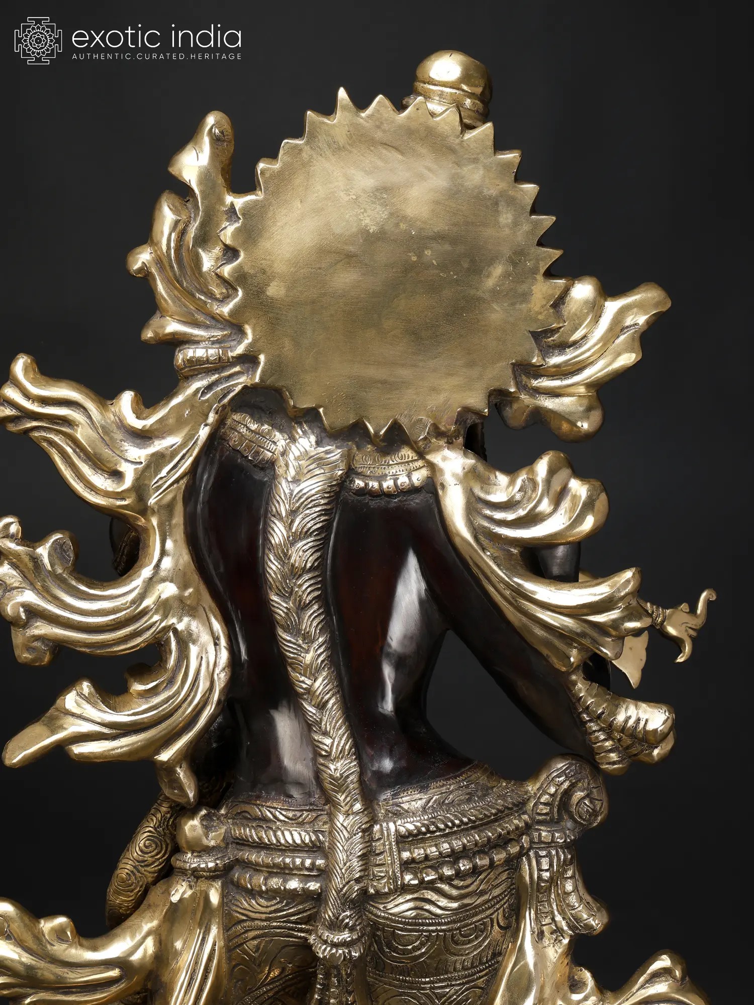 Each floral tassel in this brass statue sprouts from Krishna’s form like waves streaming from an ocean of beauty. Makara (a mythical animal, symbol of royalty and beauty) on his flute, garland laden with flowers, and ornate jewelry create a regal aesthetic in the icon.