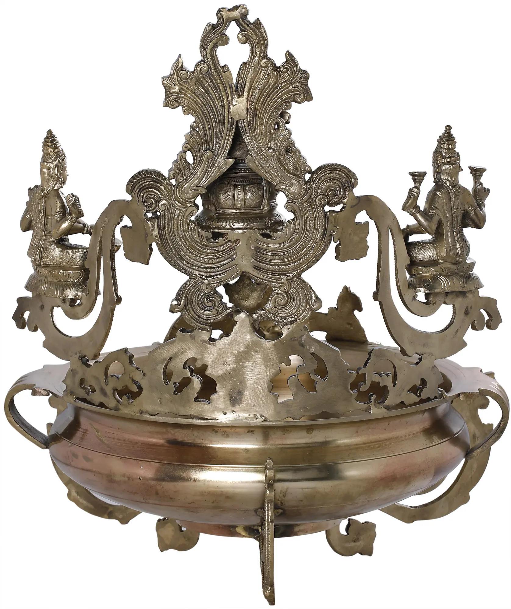 Invite the benevolent presence of three of Hinduism's most revered deities into your home with this exquisite bronze urli. Crafted with meticulous detail in Bangalore, this masterpiece is more than just a decorative piece; it's a vessel of divine blessings, embodying prosperity, wisdom, and auspicious beginnings. The urli, a traditional Indian decorative bowl, is often filled with water and adorned with flowers and floating candles, symbolizing the flow of abundance and the dispelling of darkness.