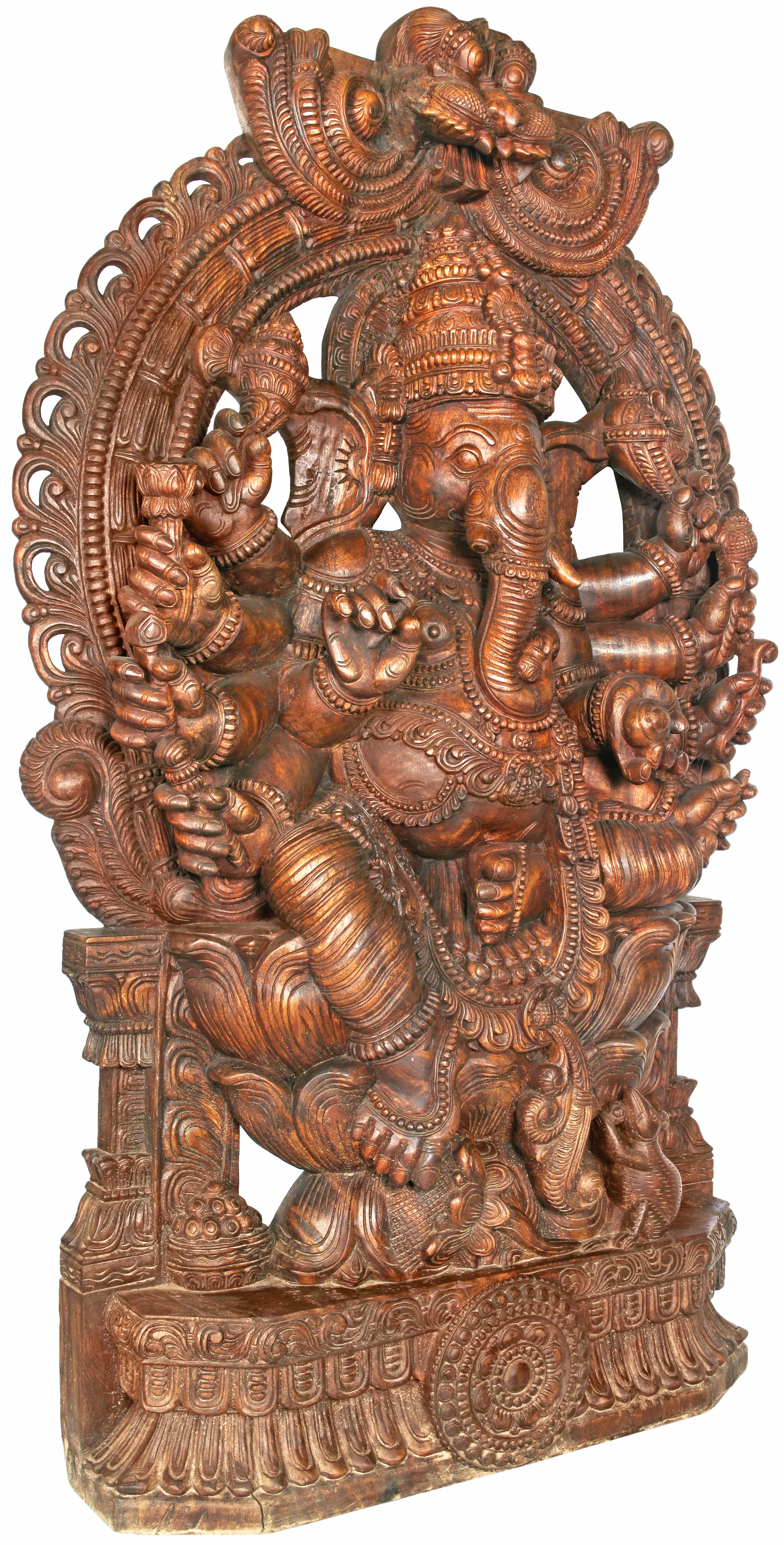 This magnificent wood carving depicts Lord Ganesha, the beloved elephant-headed deity, in a grand and commanding pose. Revered as the remover of obstacles, the patron of arts and sciences, and the intellect personified, Ganesha is invoked at the beginning of any new venture to ensure success and prosperity. This particular rendition showcases his divine power and grace through the intricate details of traditional South Indian temple craftsmanship. The sheer number of arms, eight in this sculpture, signifies his boundless energy and his ability to manage multiple tasks simultaneously, a testament to his omnipresence and omnipotence. Each hand holds symbolic items, further enriching the devotional narrative and the visual spectacle.