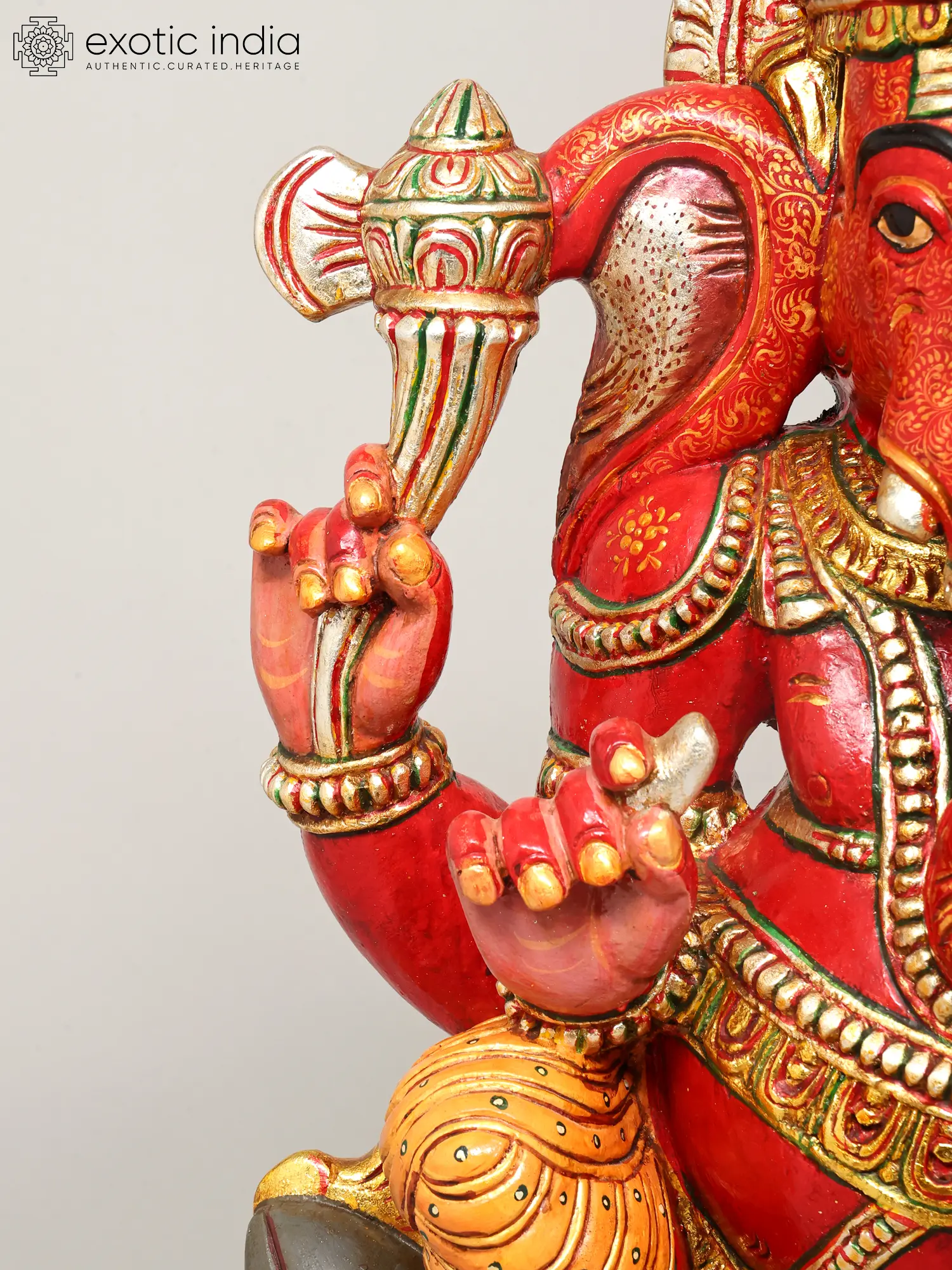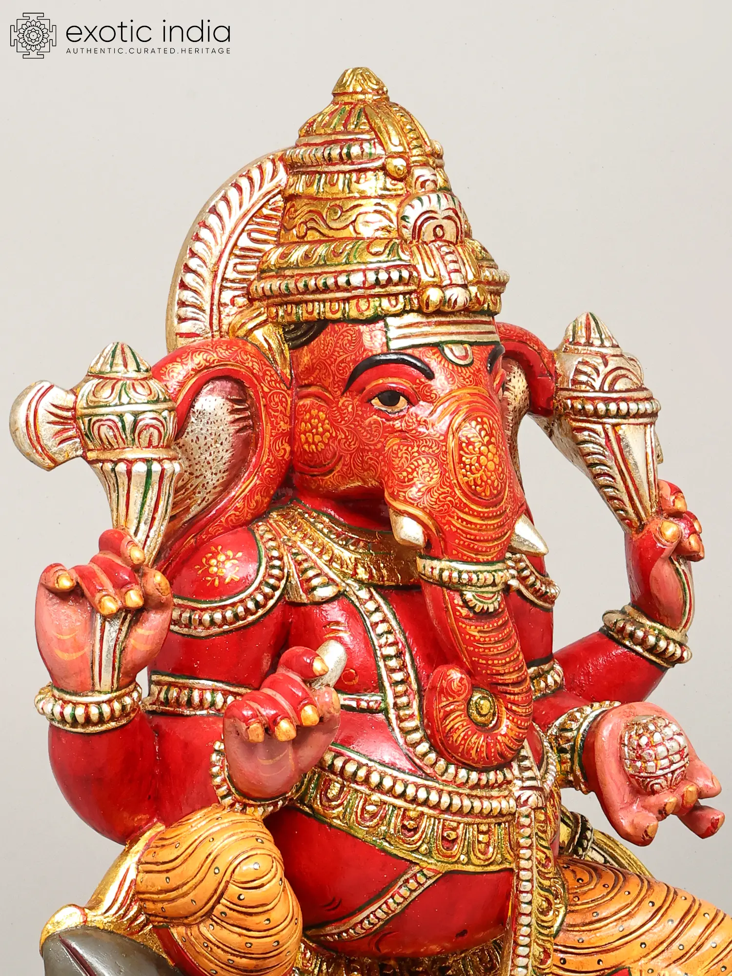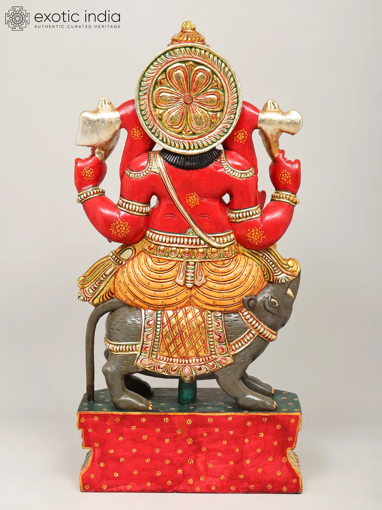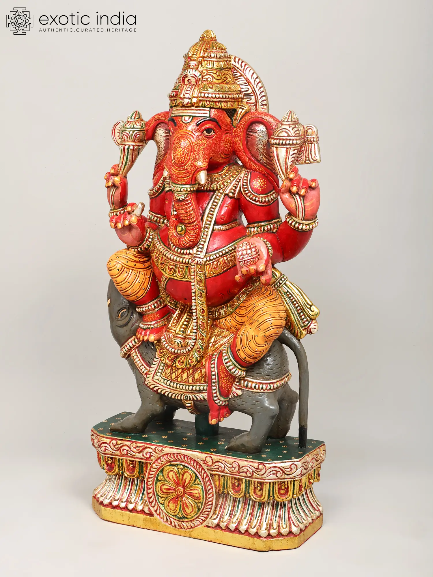 The form of the four-armed deity is rendered with striking dynamism, seated majestically upon his loyal mount, Mushak. You will marvel at the rich ornamentation, from the ornate headdress to the finely sculpted jewelry and garments that adorn the divine figure. The interplay of deep reds, vibrant yellows, and metallic gold accents creates a visually arresting masterpiece, a testament to the exquisite finishing techniques employed.