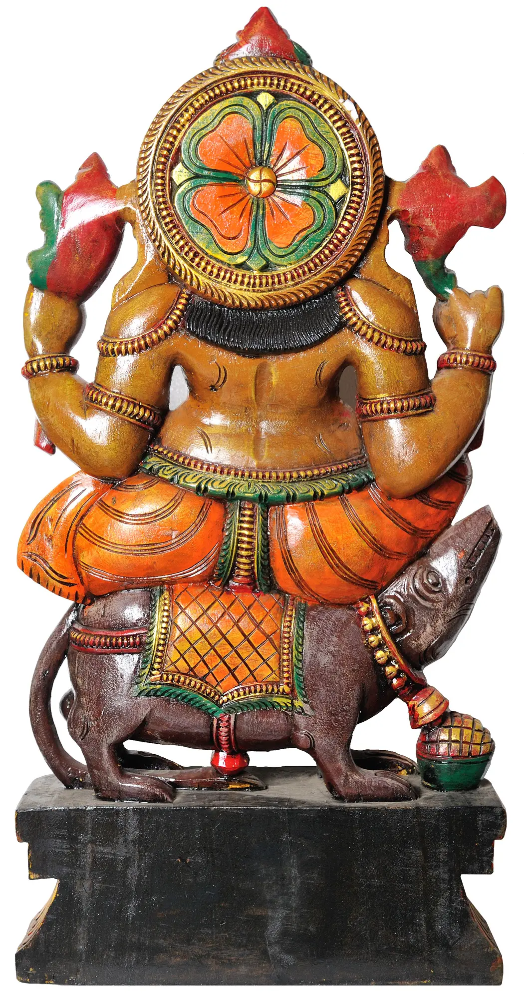 Every facet of this carving is a testament to the skill of the artisan. Ganesha is adorned with rich, ornate jewelry and flowing garments, meticulously rendered to capture the essence of divine royalty. His multiple arms, each holding symbolic objects such as a radish (representing the rewards of his efforts) and a modak (a sweet delicacy symbolizing the fruits of spiritual labor), are posed in gestures of blessing and protection. The tranquil yet powerful expression on his face invites contemplation and devotion. The surrounding base is equally detailed, featuring vibrant floral motifs and architectural elements reminiscent of ancient temple structures, further enhancing the piece's spiritual aura.