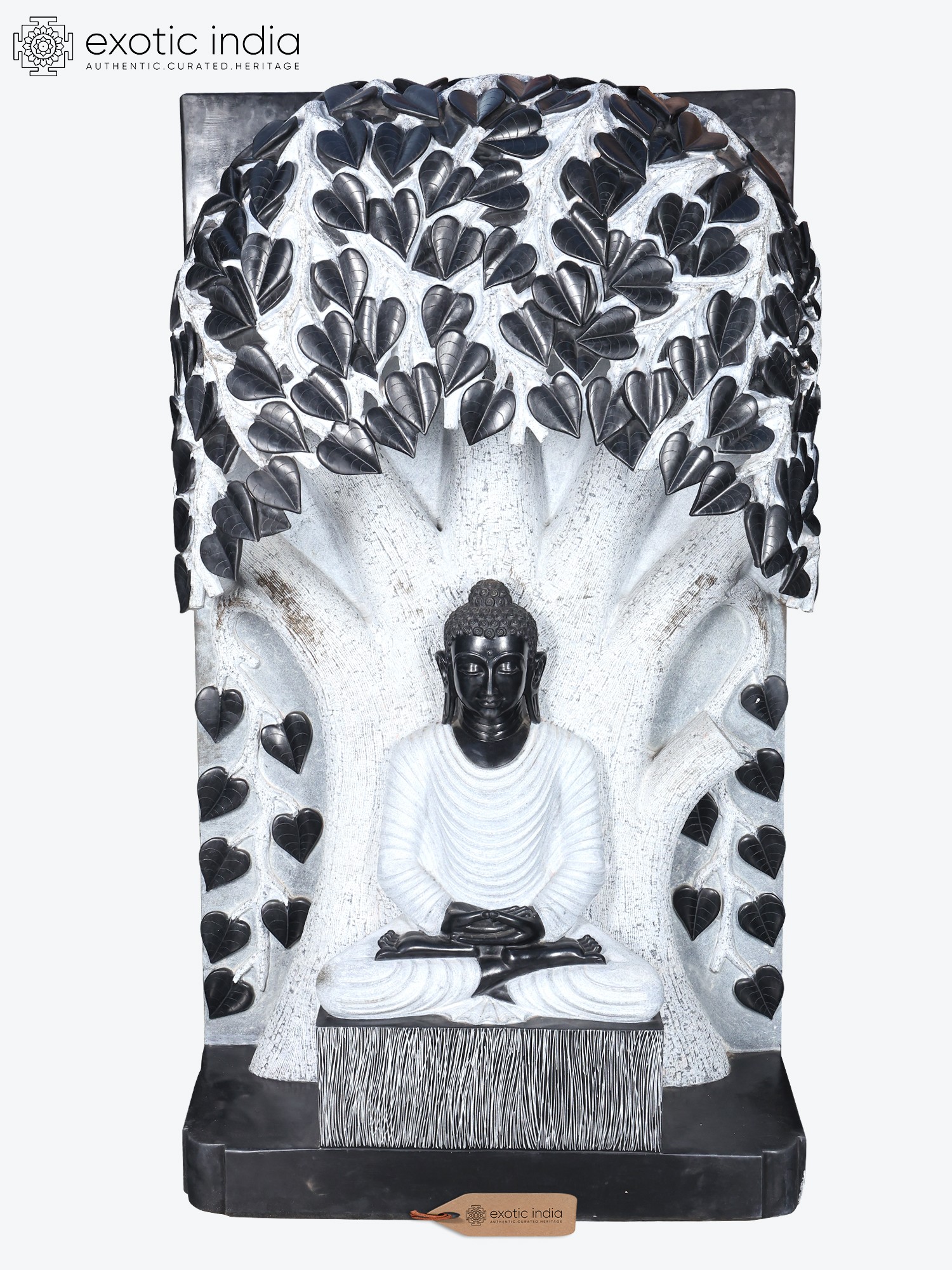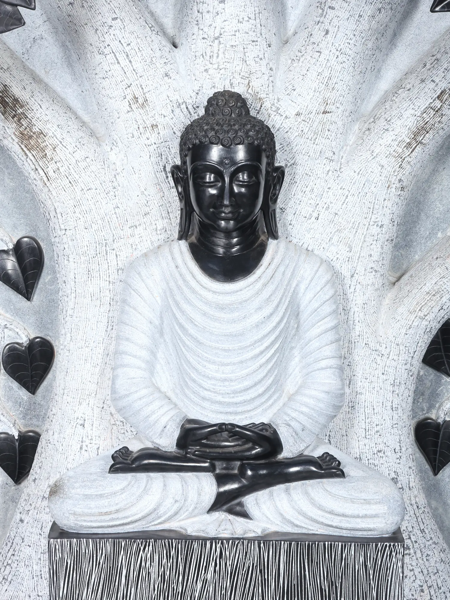Carved from exquisite marble, this sculpture embodies the meticulous dedication of master artisans. Each curve of the Bodhi tree's trunk and the intricate rendering of its leaves speaks to a deep understanding of form and texture. The contrast between the deep, rich black of the Buddha and the textured, almost luminous white of the tree is a testament to the skilled hand that brought this vision to life.