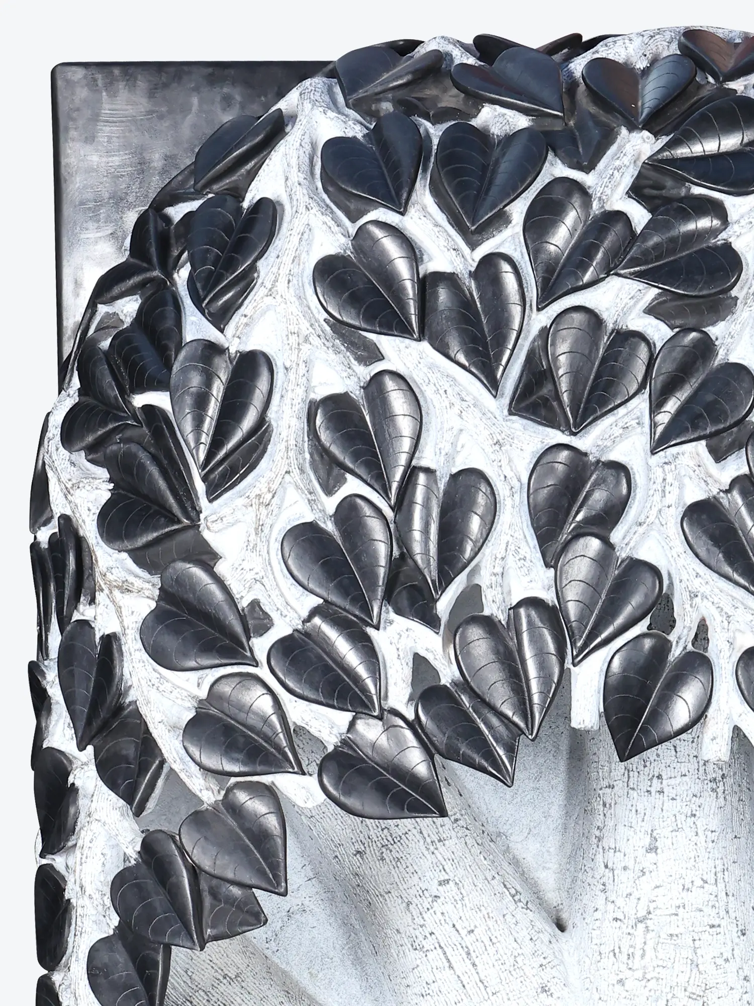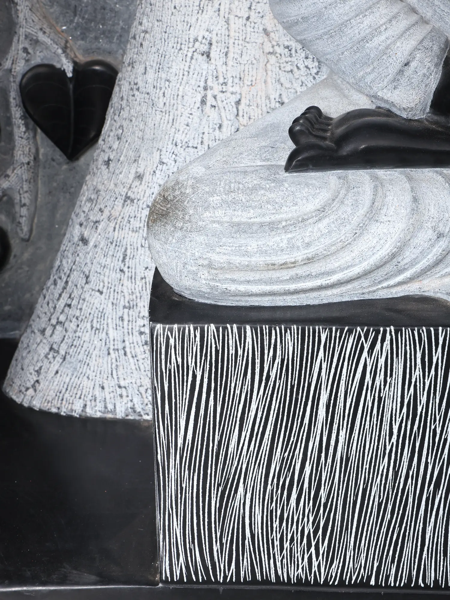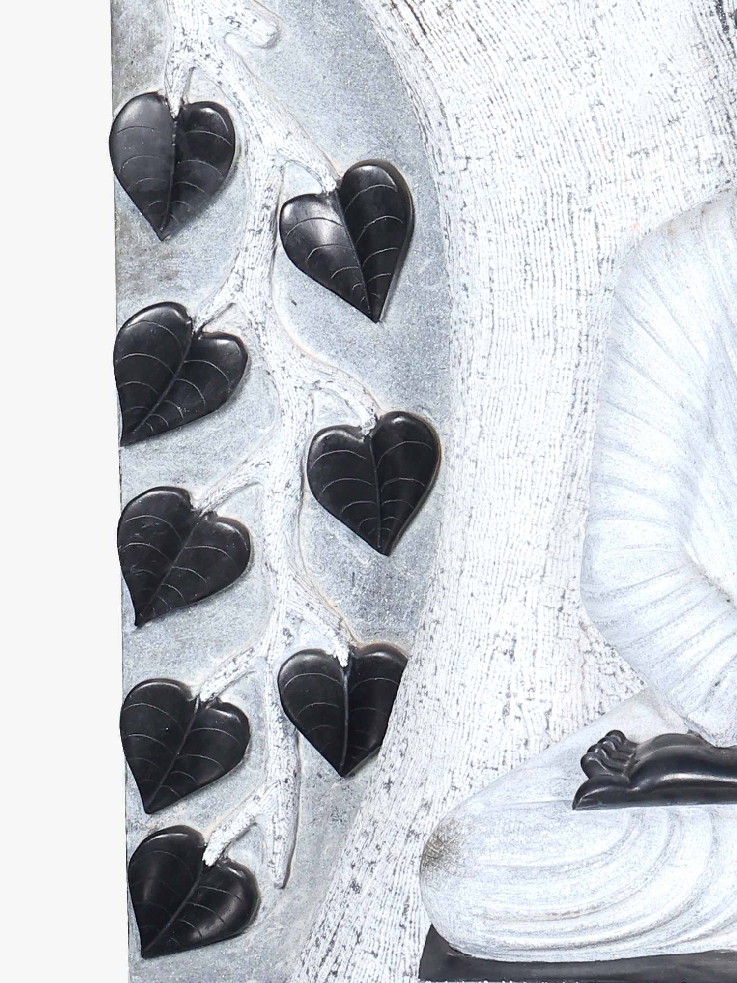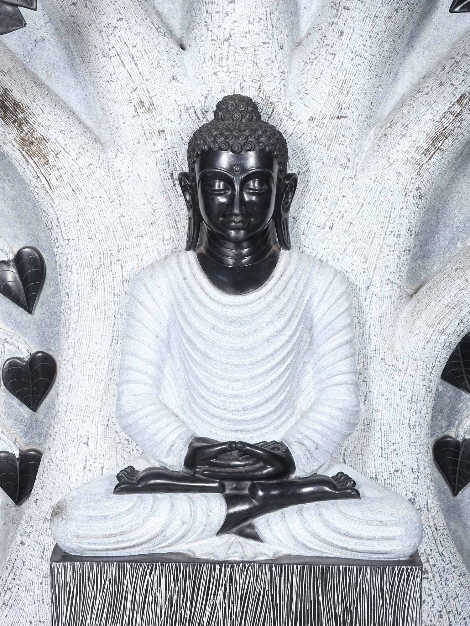 • Intricately carved from marble with a striking contrast between the dark Buddha and the textured tree.