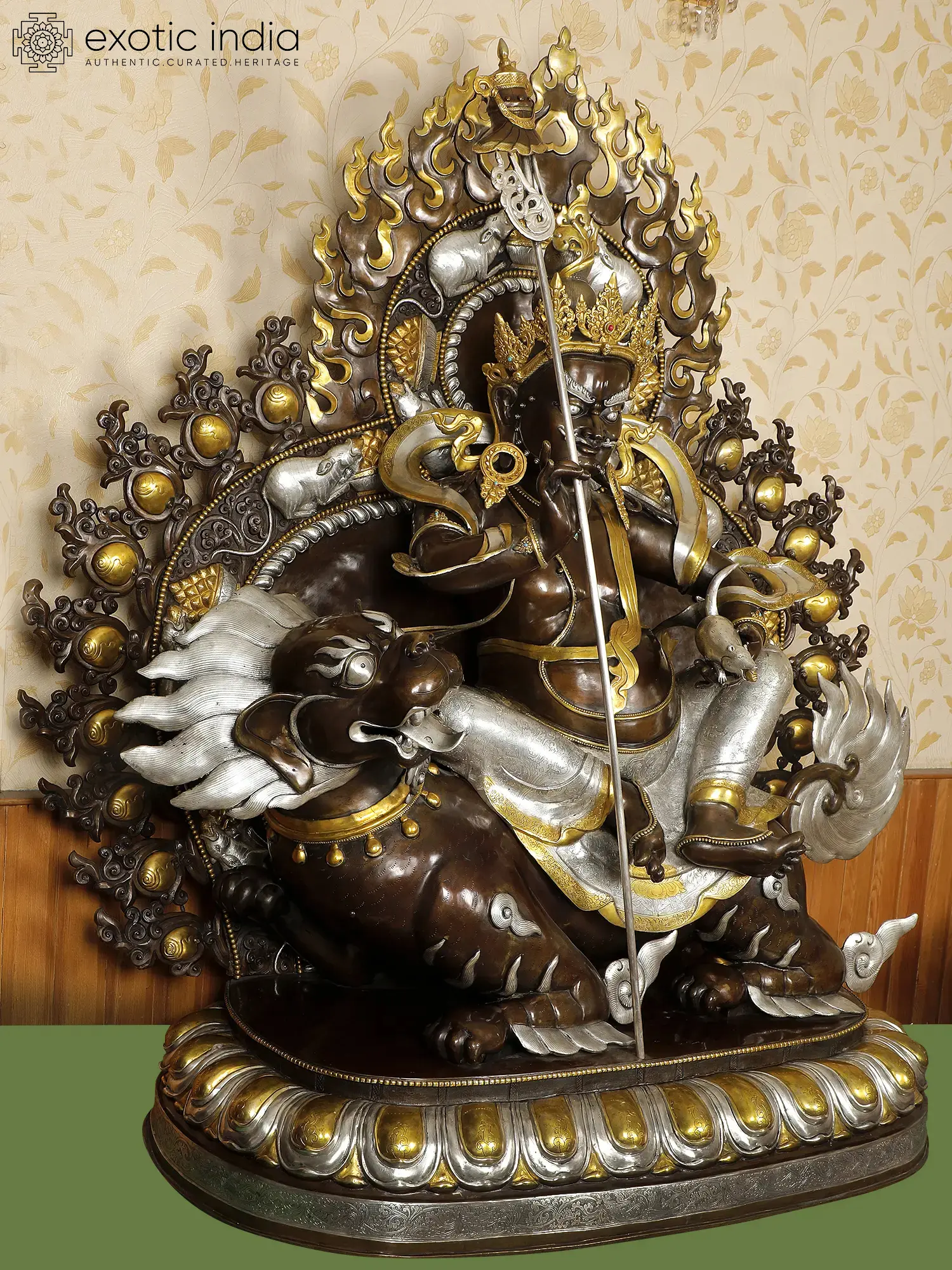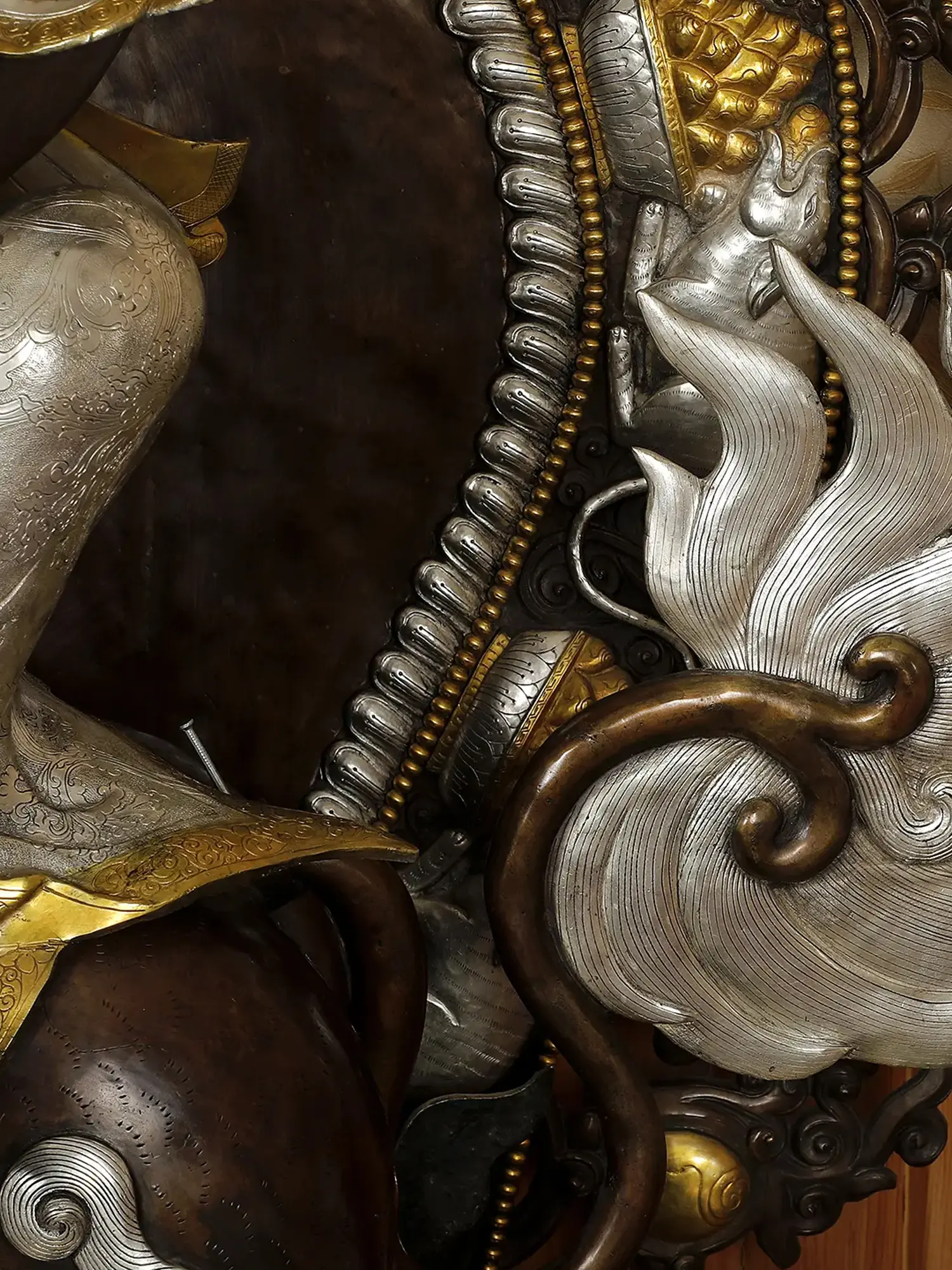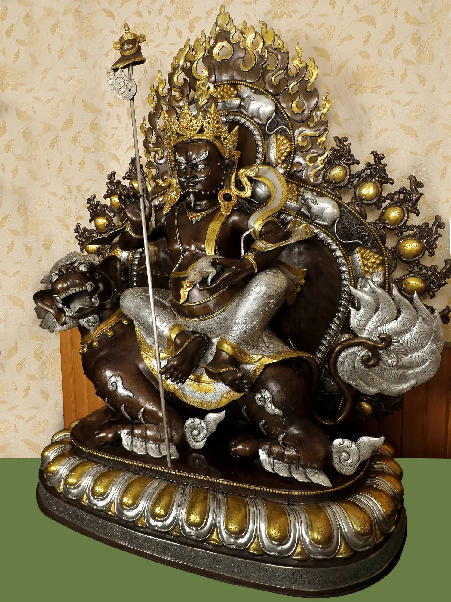 In the Gelugpa sect, the Lord of Yakshas, Vaishravana (Kubera in Hinduism), is worshipped as a great warrior, protector, and provider of wealth. The massive statue of Vaishravana in gilded copper here presents the vision of the protector of the North in Nepalese art. He is seated on a roaring snow lion, with a staff of victory and a jewel-spitting mongoose in his hands.