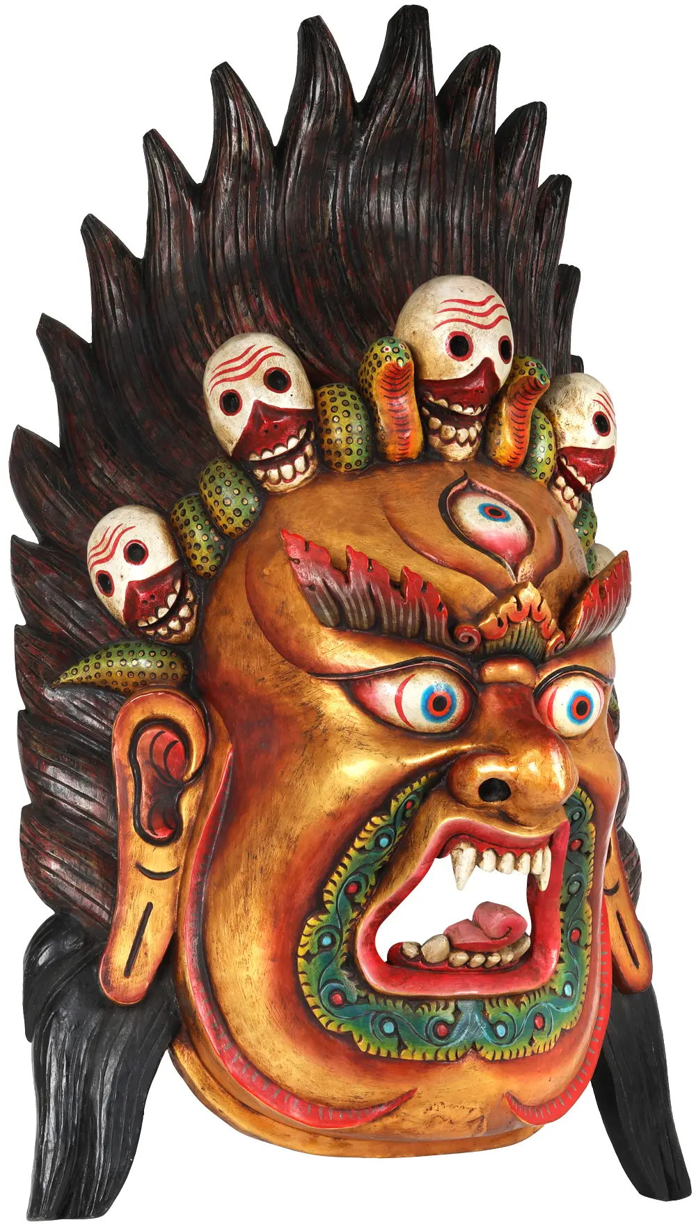 This commanding wooden mask embodies the fierce protector of Buddhist teachings, Mahakala. Handcrafted in Nepal, a land steeped in spiritual traditions, this mask is a powerful visual representation of wrathful compassion. Mahakala, often depicted as a terrifying deity, is not a being of malice but rather a force that eradicates ignorance, delusion, and all obstacles that prevent spiritual progress. His fearsome visage is designed to confront and overcome the inner demons and external hindrances that plague practitioners.