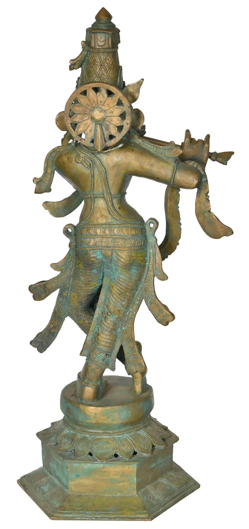 A widely adored deity fashioned from an age-old, highly venerated medium. Lord Krishna is the most popular of the dashavataras of Lord Vishnu. A cowherd from Vrindavan, a charmer of innocent cows and milkmaids (gopiya) alike. In this solemn bronze composition, He is in His tribhanga murari roopa (form), so-called because the body of the divine flute-player (murari) justs out (‘bhanga’) at three (‘tri’) different junctures, namely the shoulder, the hip, and the ankle.