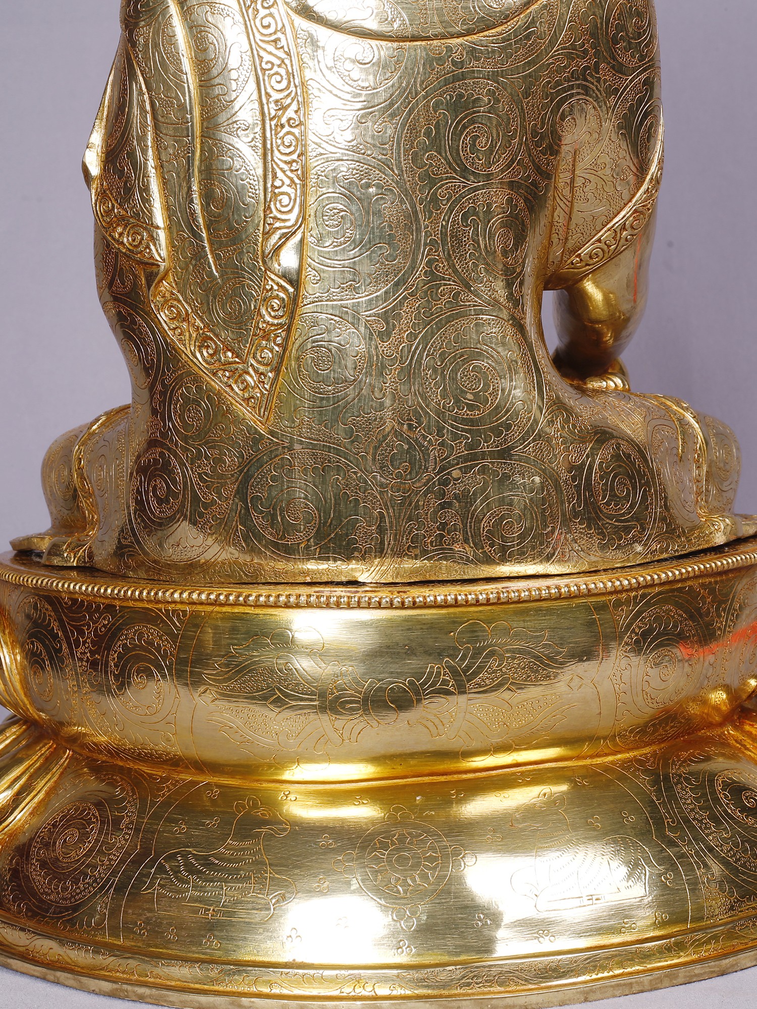 Crafted from robust copper, this sculpture showcases an exceptional level of artistry. The meticulous gold plating bestows a radiant, ethereal glow, a testament to the artisan's dedication. Every detail, from the delicate folds of the monastic robe to the serene contours of the face, is rendered with unparalleled precision and reverence.
