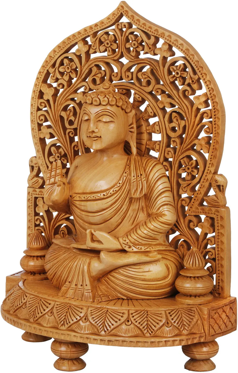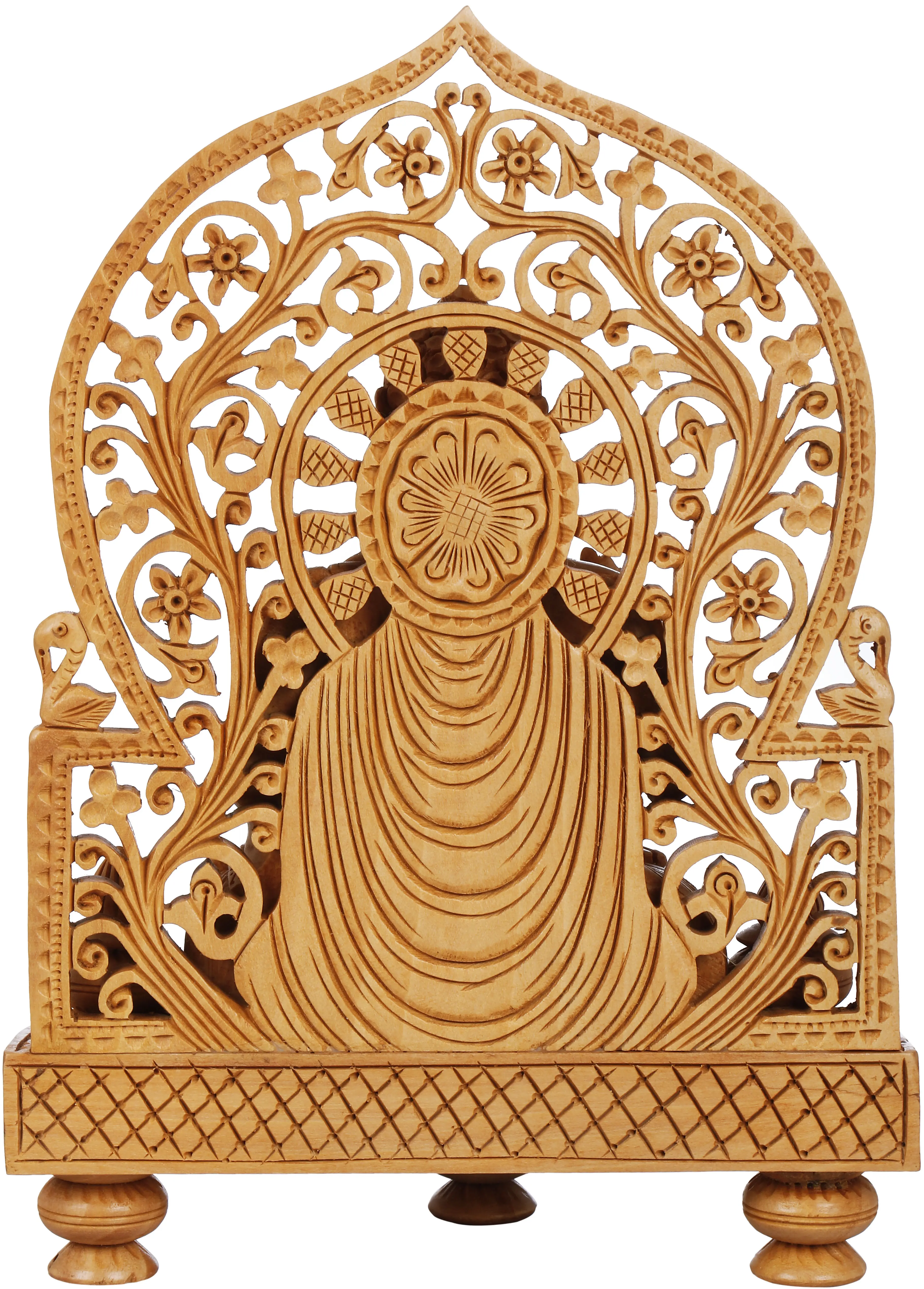 Invite a profound sense of peace and spiritual grounding into your home or meditation space with this exquisitely carved wooden statue of Lord Buddha. Crafted with meticulous attention to detail, this piece transcends mere decoration; it is a tangible representation of enlightenment and compassion. The warm, natural tones of the wood emanate a gentle radiance, inviting contemplation and mindfulness. The figure of the Buddha is depicted in a serene seated posture, the hallmark of meditation and inner stillness. His eyes are gently closed, suggesting deep introspection and an internal journey towards wisdom. The robes are rendered with flowing folds, showcasing the artisan's skill in capturing the organic drape of fabric, creating a sense of movement within the stillness. One hand is raised in a gesture of blessing or protection, while the other rests in his lap, symbolizing a calm acceptance of the present moment. The intricate halo, or *prabhamandala*, behind the Buddha is a testament to the rich symbolism within Buddhist art. Often interpreted as the sphere of light emanating from a fully enlightened being, it signifies wisdom, compassion, and the boundless nature of spiritual awareness. The delicate floral and leaf motifs carved into the halo evoke the beauty of nature and the interconnectedness of all life, reflecting the Buddhist teachings on impermanence and the natural world. The presence of birds on either side of the halo further enhances this connection to the natural world and can symbolize messengers or aspects of spiritual realization. This statue draws inspiration from the heart of Tibetan Buddhist traditions, where wood carving has been a revered art form for centuries. These carvings are not merely aesthetic objects; they serve as focal points for devotion, meditation, and the cultivation of positive qualities. In Tibetan lore, the carving of sacred figures is often considered a merit-making practice, imbued with spiritual intention by the artisan. The wood itself can be seen as carrying the energy and prayers infused during its creation. The base of the statue is equally elaborate, featuring decorative patterns that anchor the serene figure and add a sense of stability and permanence. The tiered design of the base, with its sculpted legs, elevates the Buddha, signifying his exalted status. The overall craftsmanship speaks of dedication and reverence, making this statue a truly special piece for anyone seeking to deepen their spiritual practice or bring a touch of sacred beauty into their surroundings. This wooden representation of Lord Buddha is more than an object; it is an invitation to inner peace and a timeless reminder of the path to enlightenment.