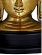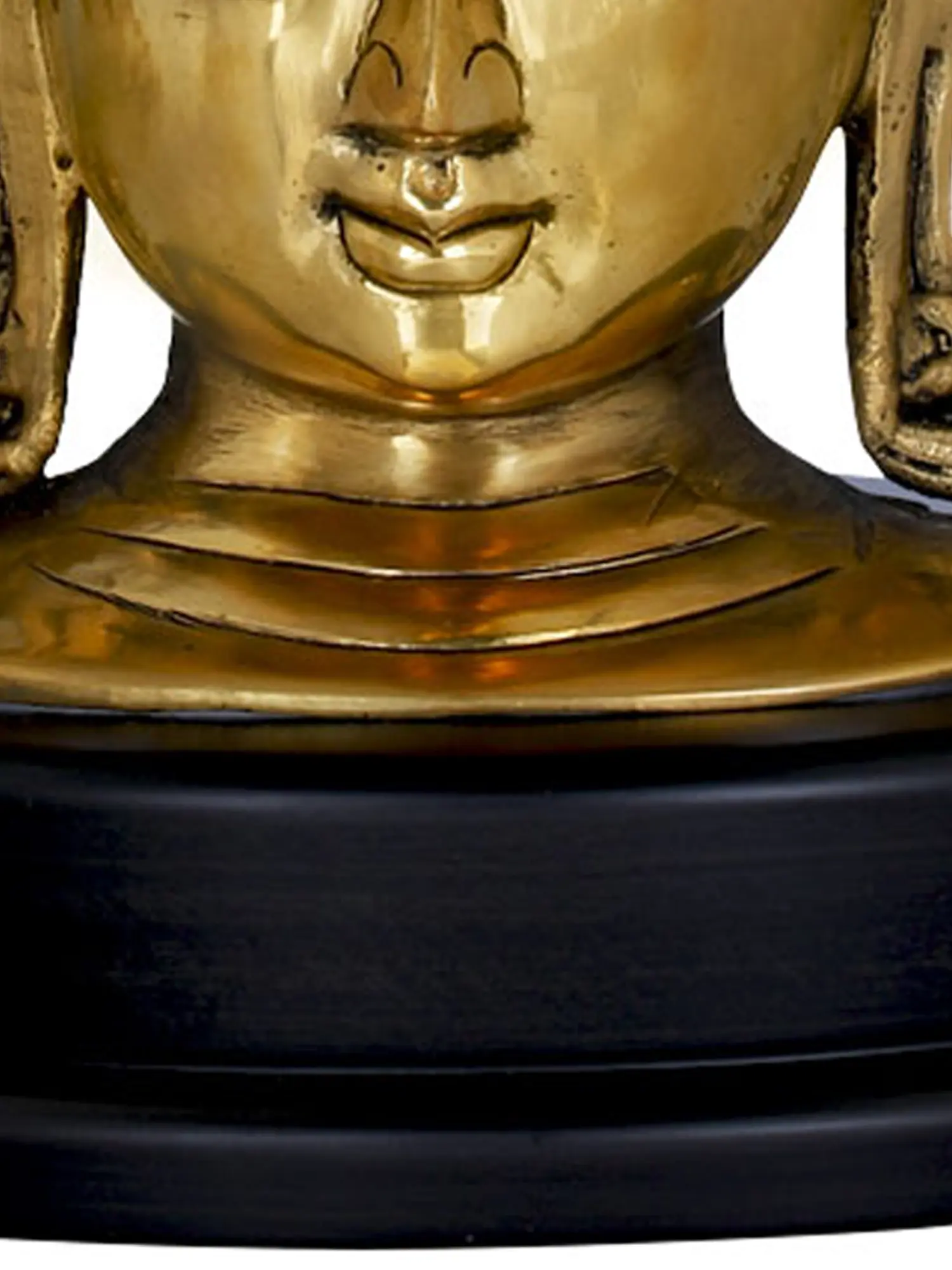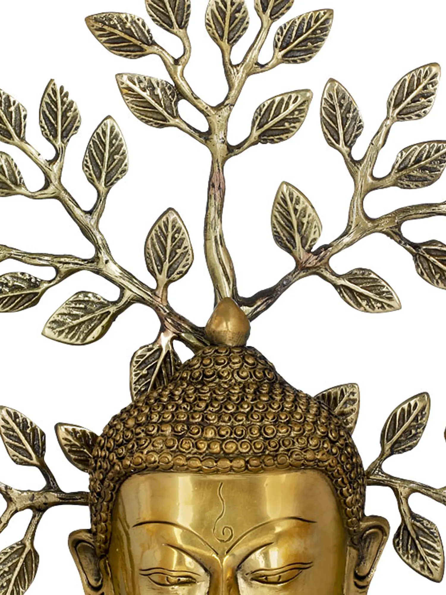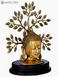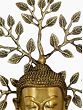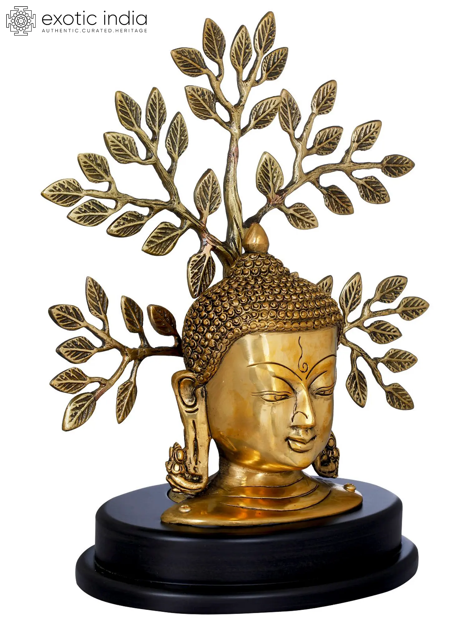 Shakyamuni Buddha, whose teachings have been concentrated in the religion of Buddhism today - has been acutely sculpted in brass as a bust. His eyes in a state of realization look downwards, covered almost half by the lids, with a slight smile. His curls are tied into a high bun, and his earlobes are stretched by the weight of heavy earrings. Placed as an umbrella is a branch of the revered Bodhi tree. Placed on a double layer of round wooden discs - this piece speaks of the climaxed enlightenment (Nirvana).