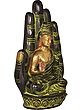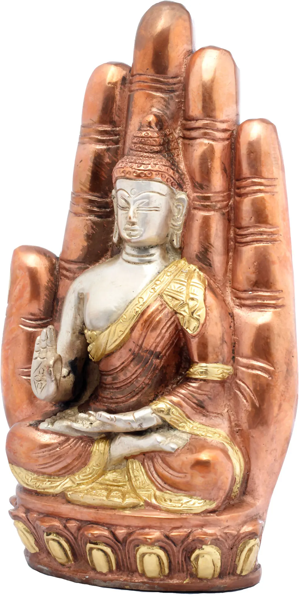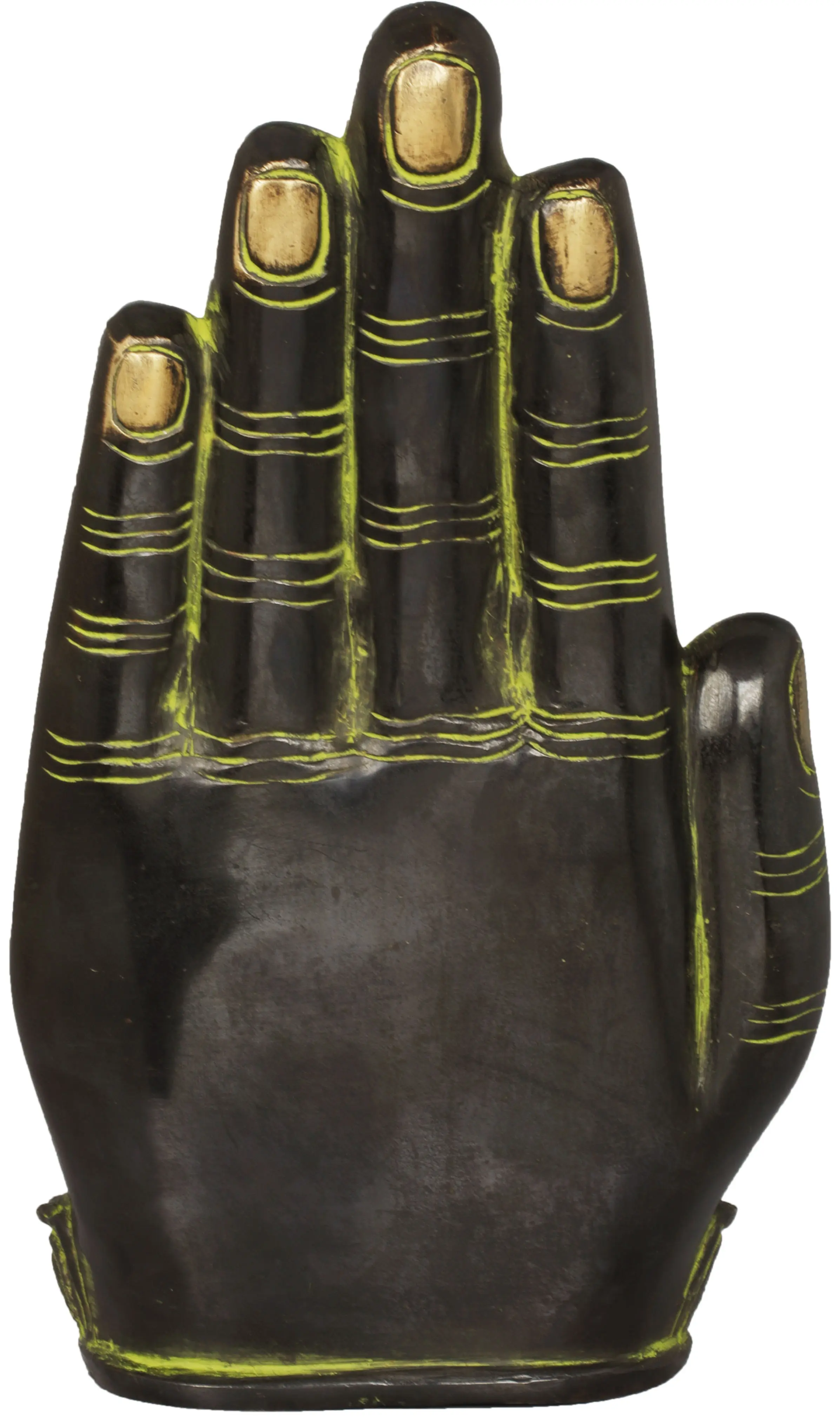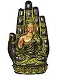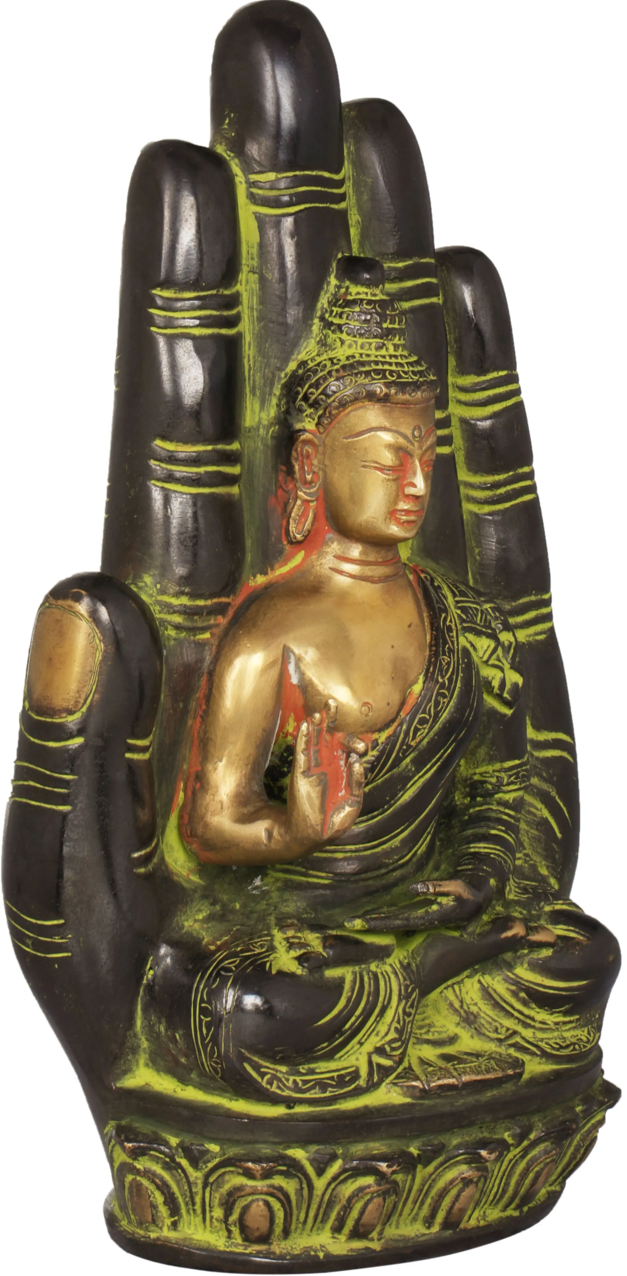 This exquisite brass statue depicts the serene form of Lord Buddha, seated in a contemplative posture upon a vibrant lotus blossom. The artistry extends beyond the central figure, cradling the Buddha within the protective embrace of a stylized hand. This hand, rendered in a deep, rich brass with striking green accents, symbolizes the divine guidance and encompassing compassion offered by the Buddha, a gesture often seen in Buddhist iconography representing the transmission of wisdom. The intricate details, from the Buddha's serene expression and urna on his forehead to the delicate folds of his monastic robe, speak to the skilled hands of Indian artisans who have brought this sacred imagery to life.