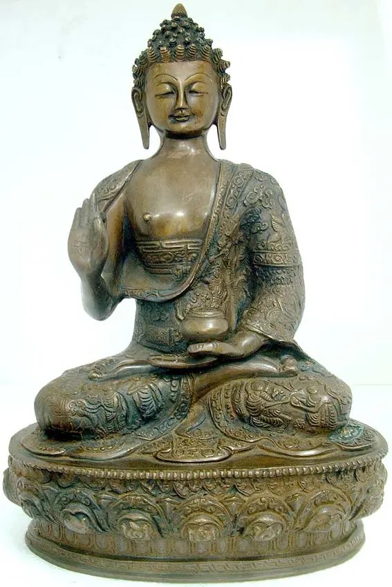 With his right hand held in ‘vitarka-mudra’ – interpretive posture, the statue represents him as the universal teacher, the Buddha’s final state as a living being. Usually the Buddha’s images in teaching posture are rendered with both hands in ‘vitarka-mudra’. In ‘vitarka-mudra’ the eyes are half-open as in a thoughtful demeanour. With his eyes closed, as in meditation or as engrossed in inner dialogue, the posture in this rendition is slightly different. Apart, he is holding in his left hand a pot which symbolised in general the abundance of knowledge which as the universal teacher the Buddha imparted, and sometimes, especially in later Tantrika innovations, also his power to bestow worldly riches and happiness. In the Buddha’s iconography the pot in his left hand often symbolised his emanation as the Medicinal Buddha – Bhaisajyaguru, though in such emanation his image is represented as carrying in his other hand or around him also a twig of a herbal creeper or plant. The spiritual aura that the Buddha’s face reveals is in tune with the initial perception of the Buddha’s imagery seeking to represent the Buddha – the Enlightened one, beyond his mortal frame only as Dharma-kaya – the law-incarnate.