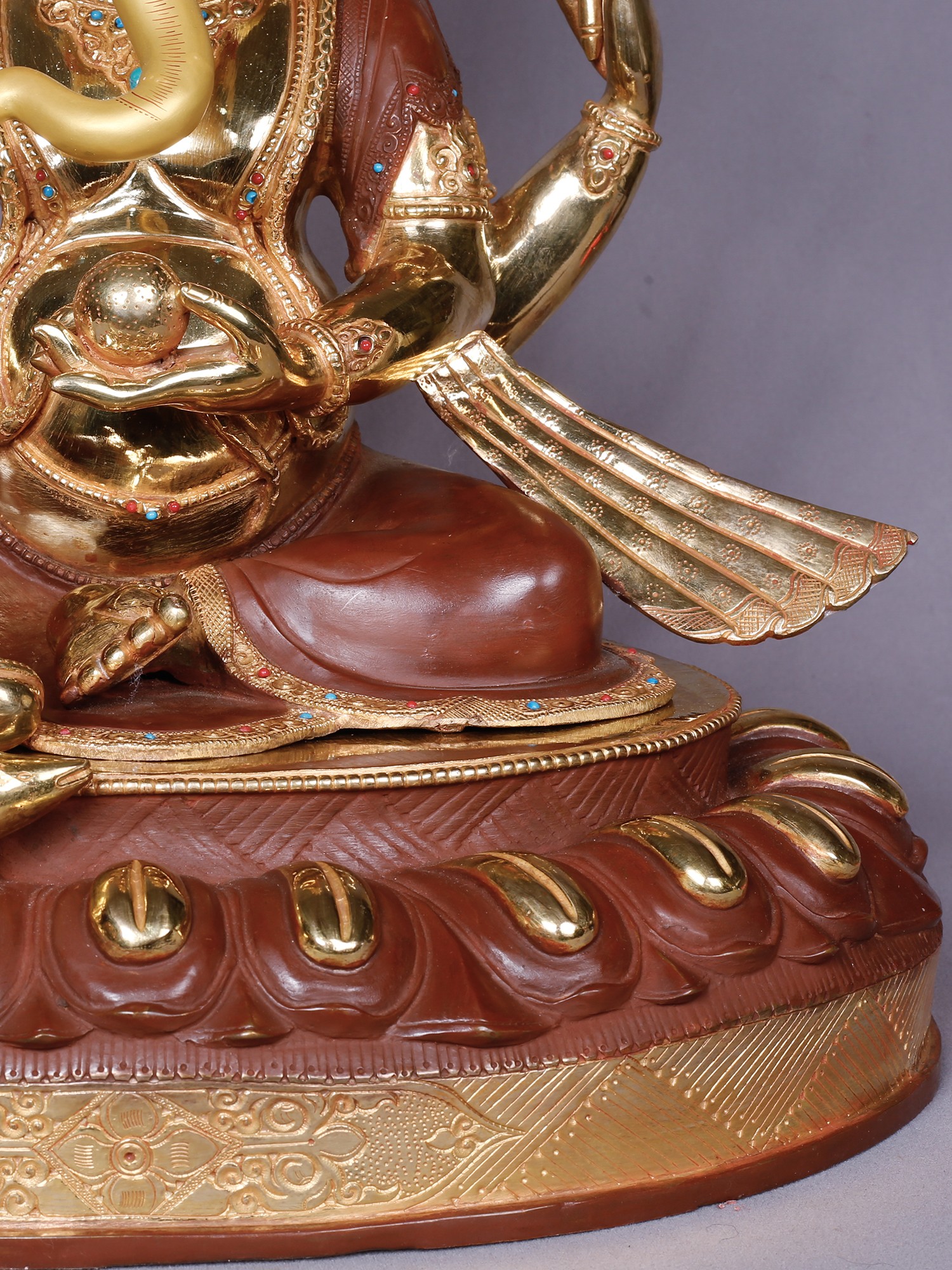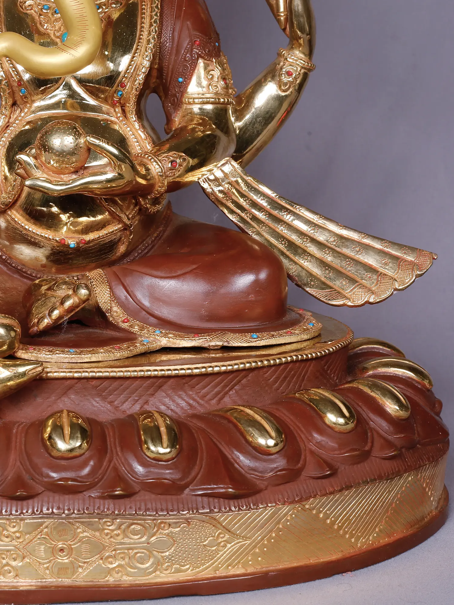 Observe the dynamic posture, conveying both serene contemplation and potent power. This representation of the beloved deity, with his elephantine visage and kindly countenance, is depicted with eight arms, each holding significant symbolic objects. You will notice the ankusha (goad) for controlling the mind, the pasha (noose) for capturing obstacles, and a lotus flower, symbolizing purity and enlightenment. The rich, textured finish of the garments, contrasted with the gleaming gold of his divine form, adds depth and visual intrigue, making it a truly arresting presence.