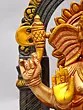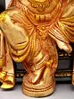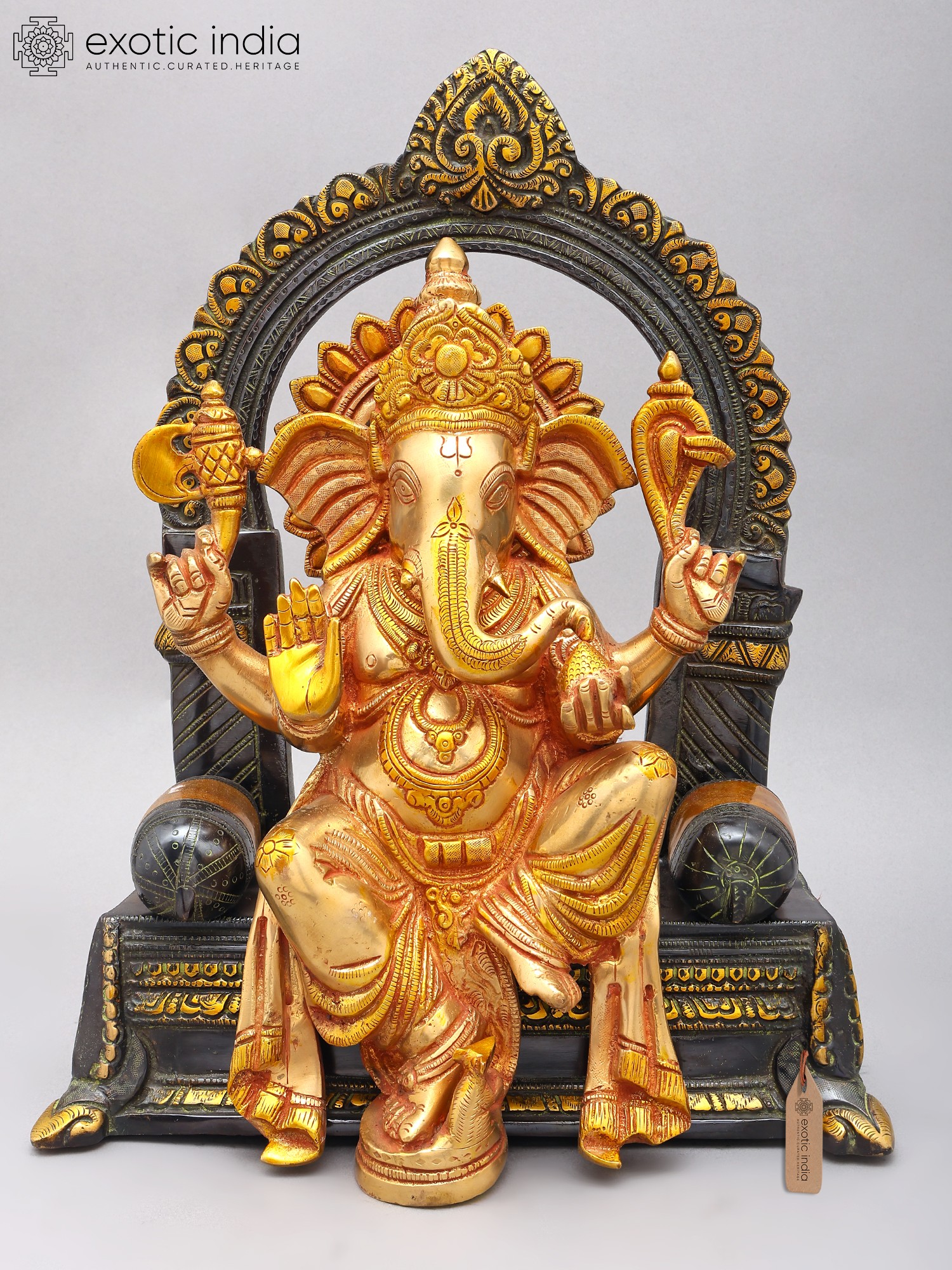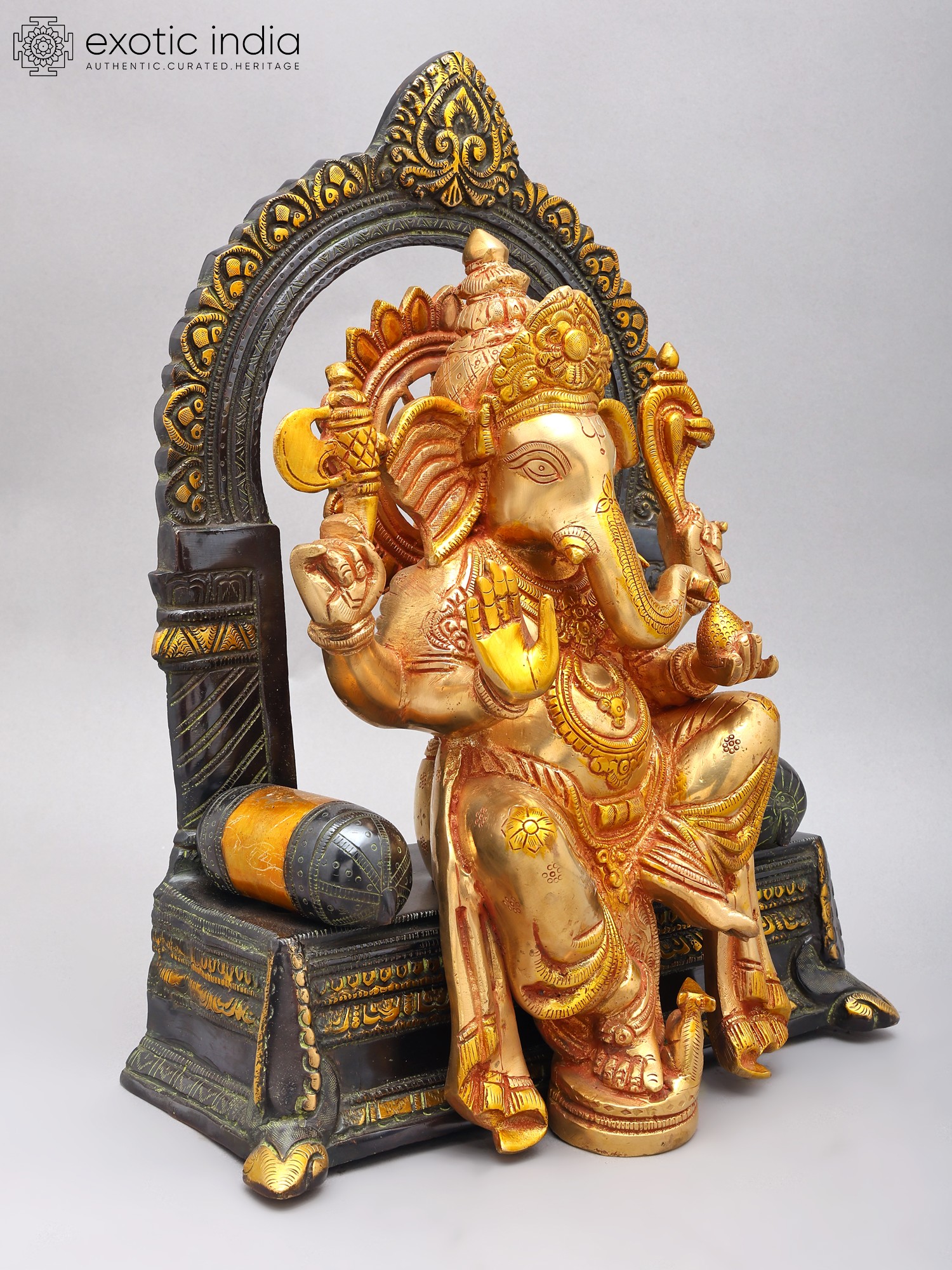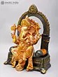 The figure is shown seated regally on a detailed Singhasan (throne), symbolizing authority and auspiciousness.
