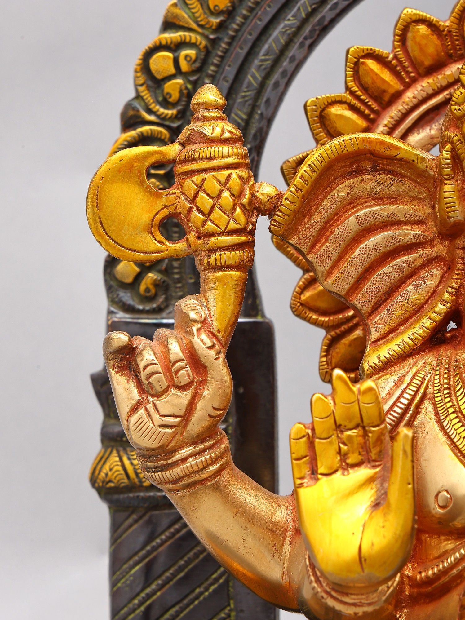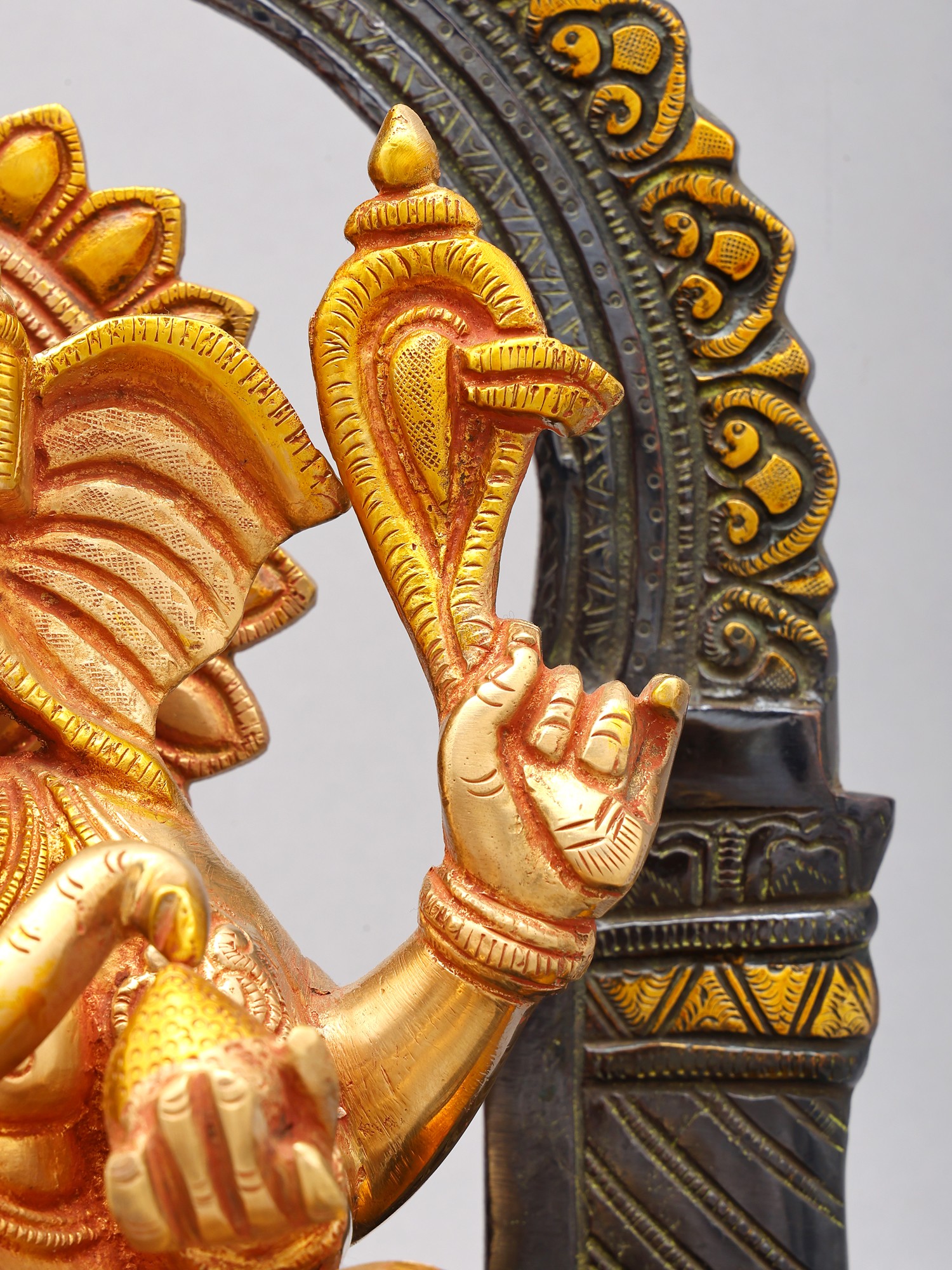 Intricate detailing on the statue captures the divine iconography of Ganesha, including his multiple arms and symbolic attributes.