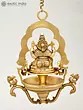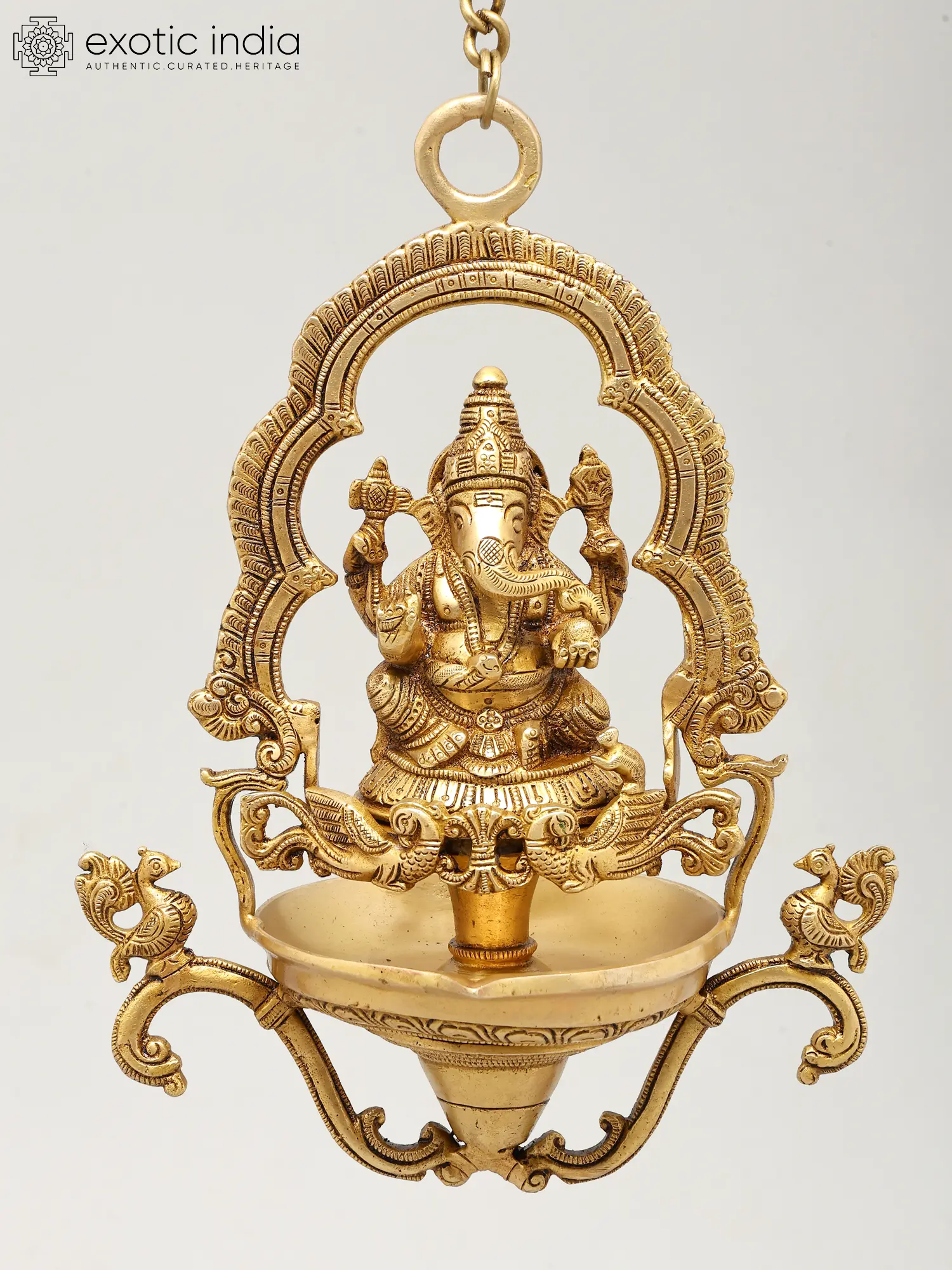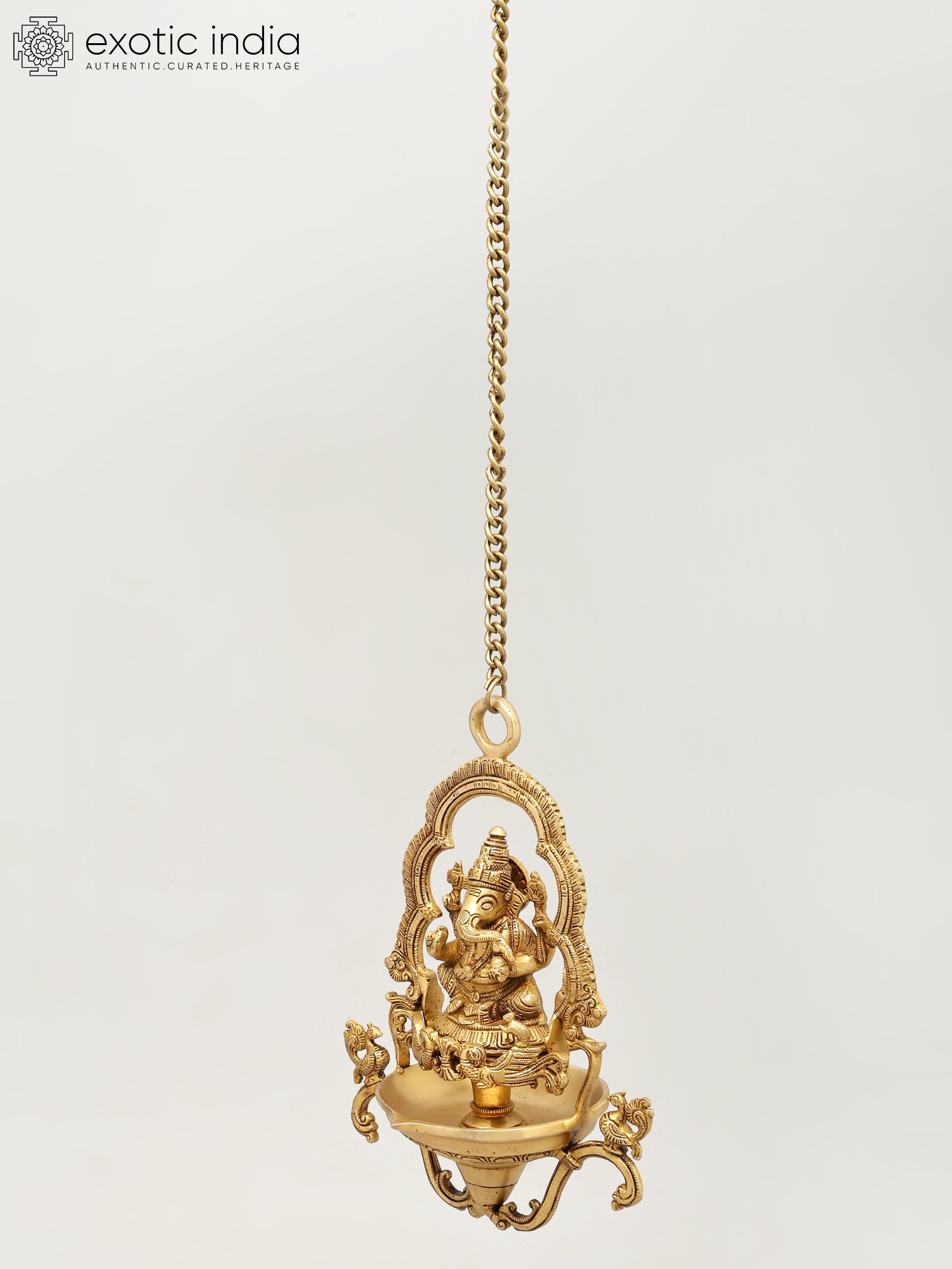 This lamp is a masterpiece of Indian metalwork, showcasing the intricate details that only handcrafting can achieve. The detailed carving of Ganesha, from the majestic crown to the delicate features of his face, speaks volumes about the artisan's dedication and skill. The surrounding brass structure, with its elegant curves and decorative motifs, adds to the overall grandeur of the piece. The inclusion of the chain allows for it to be hung, casting a warm, diffused light that creates a serene and inviting ambiance. The choice of brass as the material is significant; it has been used for centuries in India for creating religious idols, utensils, and decorative items, valued for its ability to retain its form and its ability to develop a beautiful patina over time, adding to its character. This lamp is an authentic piece of Indian heritage, designed to be a focal point in any home, temple, or sacred space. It embodies the spirit of devotion and the timeless allure of traditional Indian art.