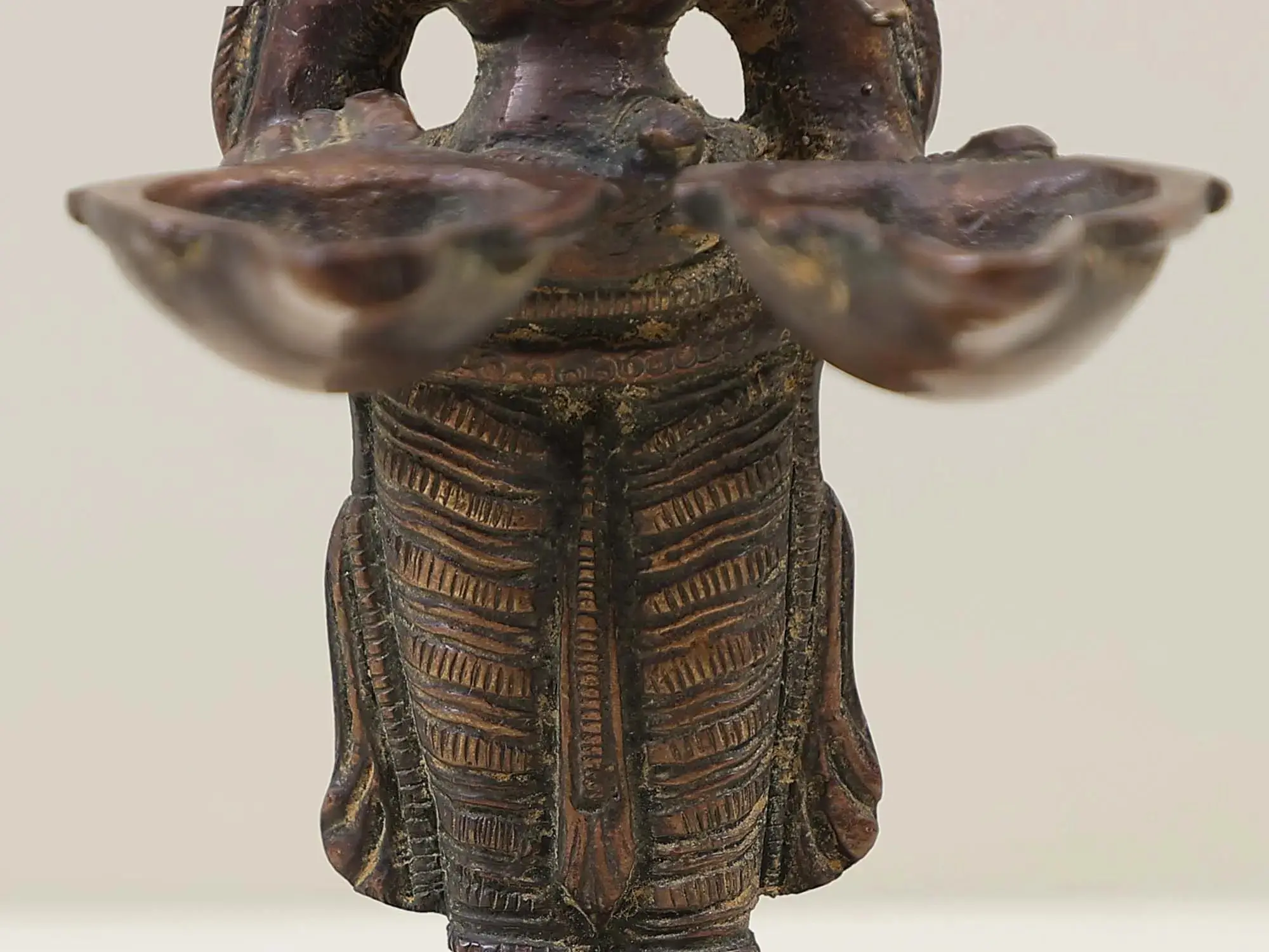 This brass lamp made in the style of a Deepalakshmi can be identified as a Ganesha lamp. It has the typical structure of a figure standing straight holding one or two lamps as if making an offering. Here in this lamp, the image of Lord Ganesha is benevolent and he is holding the lamp as if blessing the devotees with the light of wisdom.