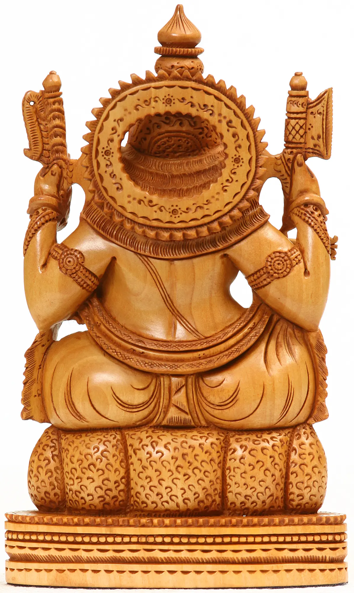 This sculpture is a testament to the rich artistic heritage of Jaipur, a city renowned for its mastery in wood carving. Skillfully handcrafted from Kadamba wood, each detail of the sculpture reflects the dedication and expertise of the artisans who have meticulously brought this form of Ganesha to life. Kadamba wood is favored for its fine grain and smooth texture, lending itself beautifully to intricate carvings like the delicate folds of Ganesha's clothing and the ornate details of his ornaments. The warm, natural tone of the wood adds a touch of earthly elegance, making it a timeless piece of art.