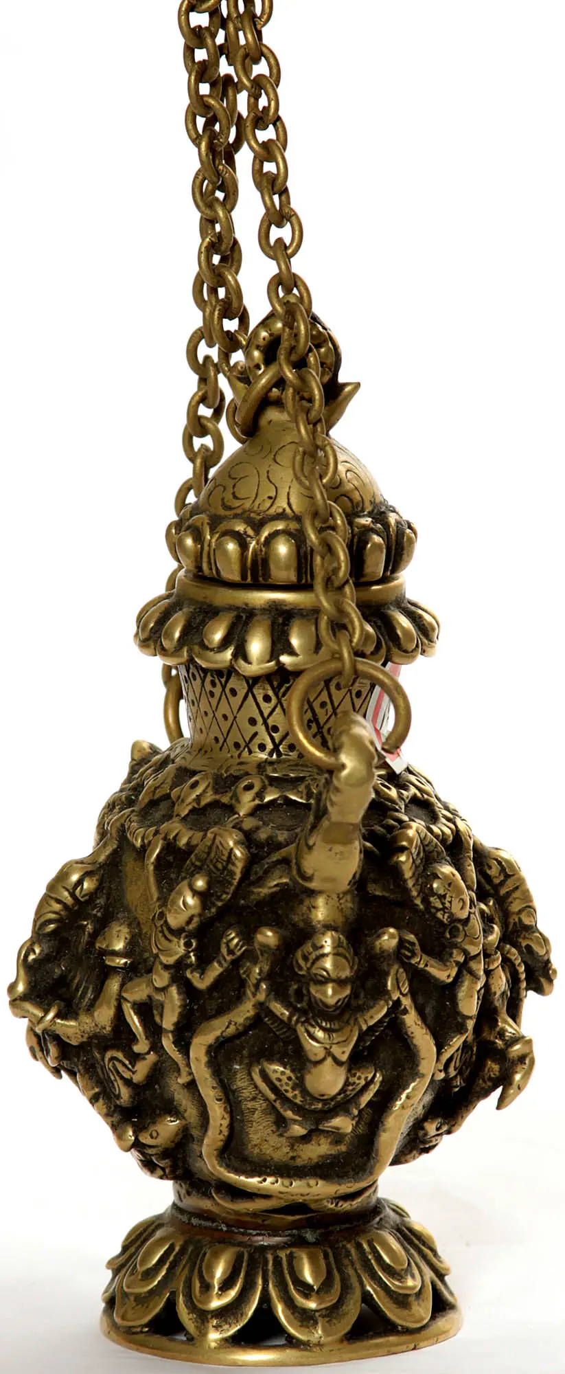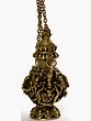 The warm golden hue of the brass lends the bottle a timeless quality, evoking the ancient traditions from which it draws its inspiration. Intricate detailing covers the bottle's surface, with multiple figures adorning it. A closer look reveals not only Ganesha himself, but also the dancing and reverent figures which are sure to be deities in their own rights. These are all sculpted with remarkable attention to detail. Suspended by a delicate chain, this sculpture is an example of the skill and artistry passed down through generations. Its compact dimensions make it ideal for display on an altar, shelf, or desk, where it can serve as a constant source of inspiration and serenity.