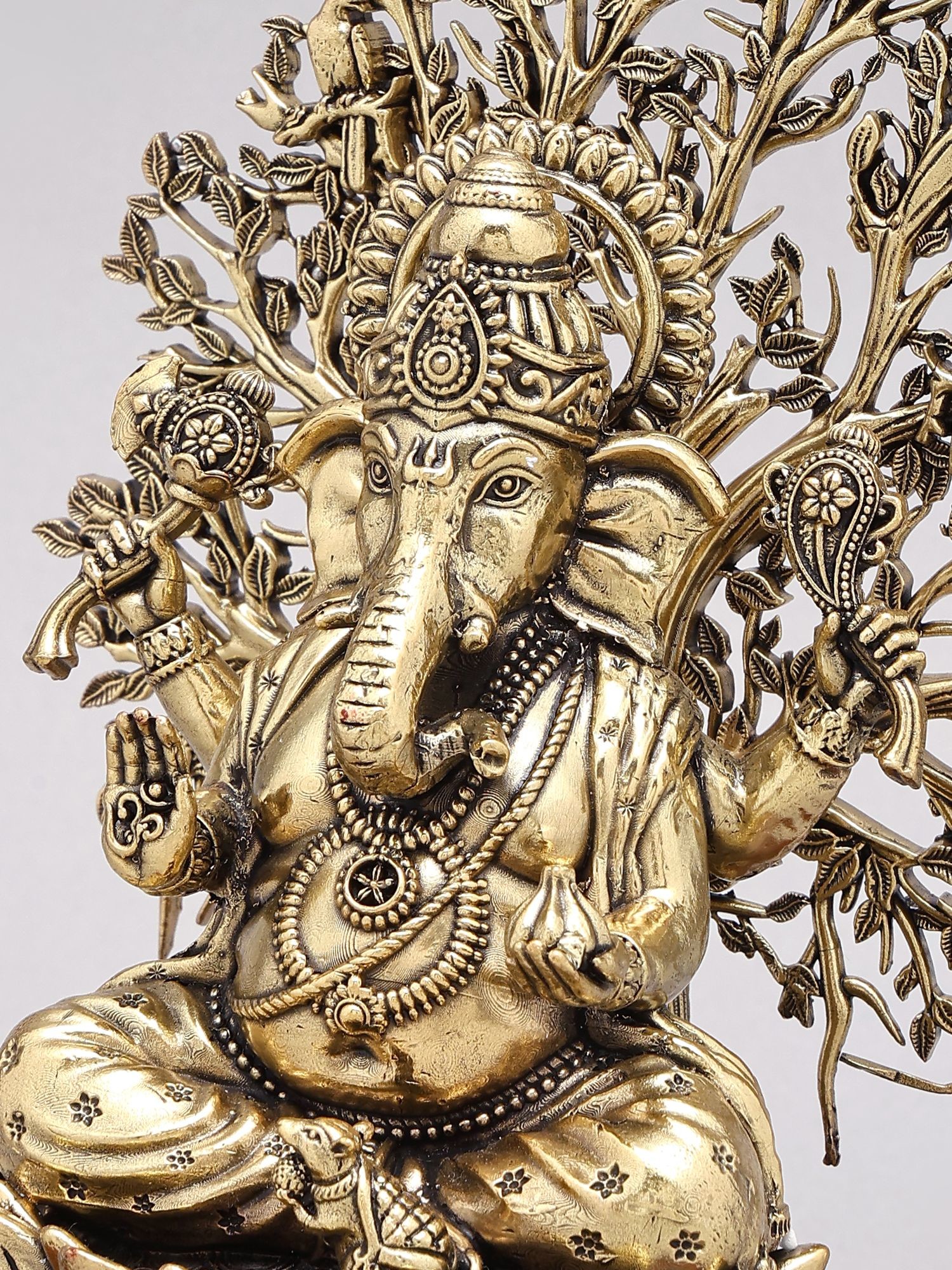 The intricate tree element behind Ganesha symbolizes growth and life.