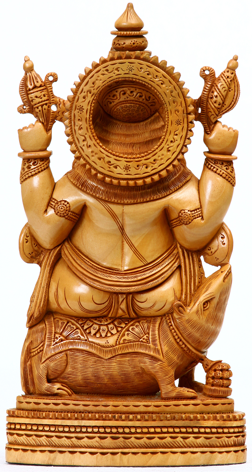 Behold a meticulously crafted sculpture that embodies the essence of wisdom, prosperity, and auspicious beginnings. This depiction of Lord Ganesha, the beloved elephant-headed deity of the Hindu pantheon, captures his benevolent presence. Each curve and contour of this piece resonates with the divine energy associated with this revered god. His large ears, said to hear all prayers, are prominently displayed, while his trunk, a symbol of adaptability and intelligence, gracefully curls. This image of Ganesha offers blessings and bestows protection. The 'abhaya mudra,' the hand gesture of reassurance, signifies fearlessness and divine grace. His posture exudes tranquility and power, inspiring a sense of calm and confidence to those who behold him. Seated upon his loyal mount, the mouse, Ganesha is a symbol of overcoming obstacles and finding wisdom even in the smallest of creatures.