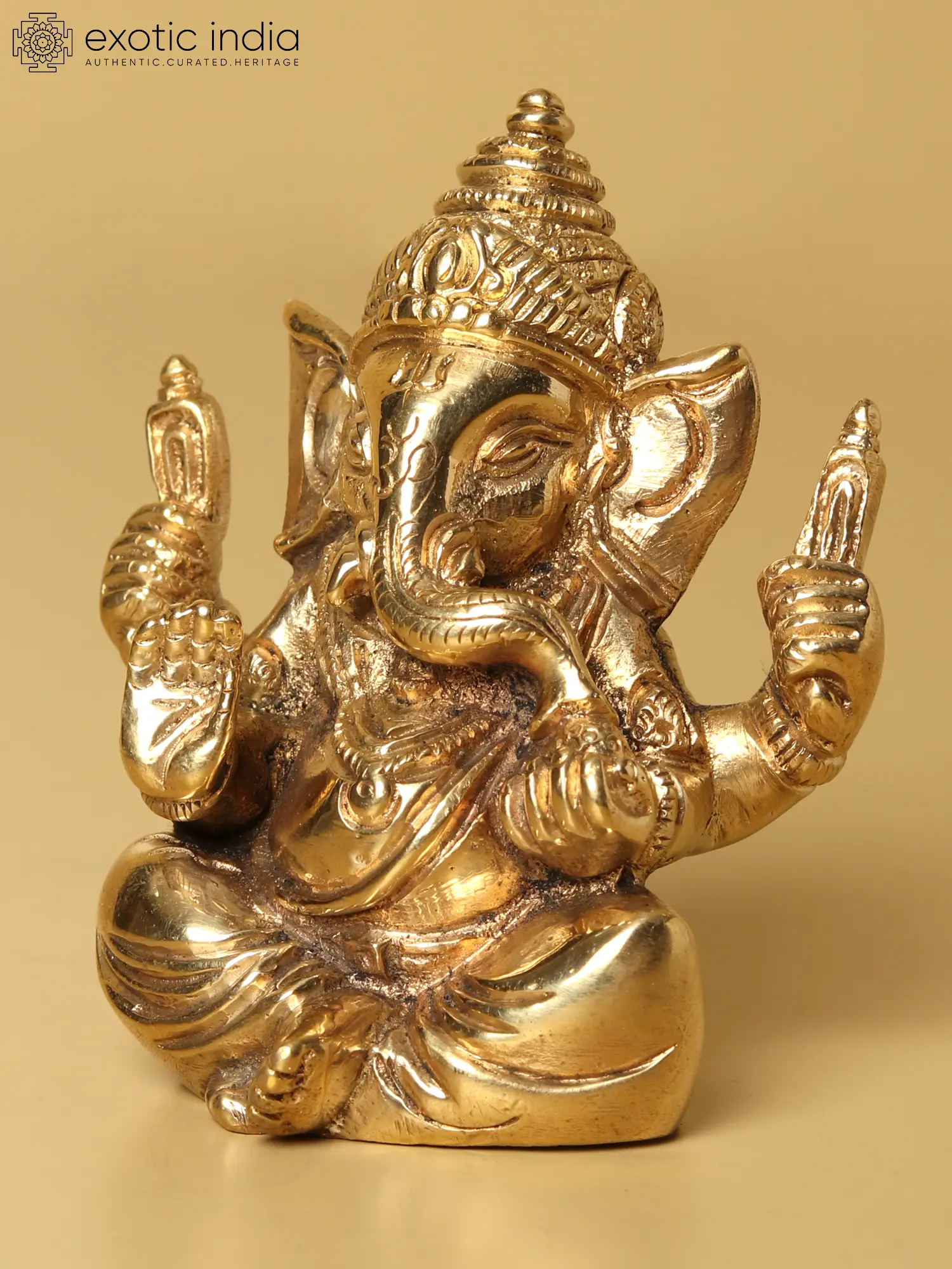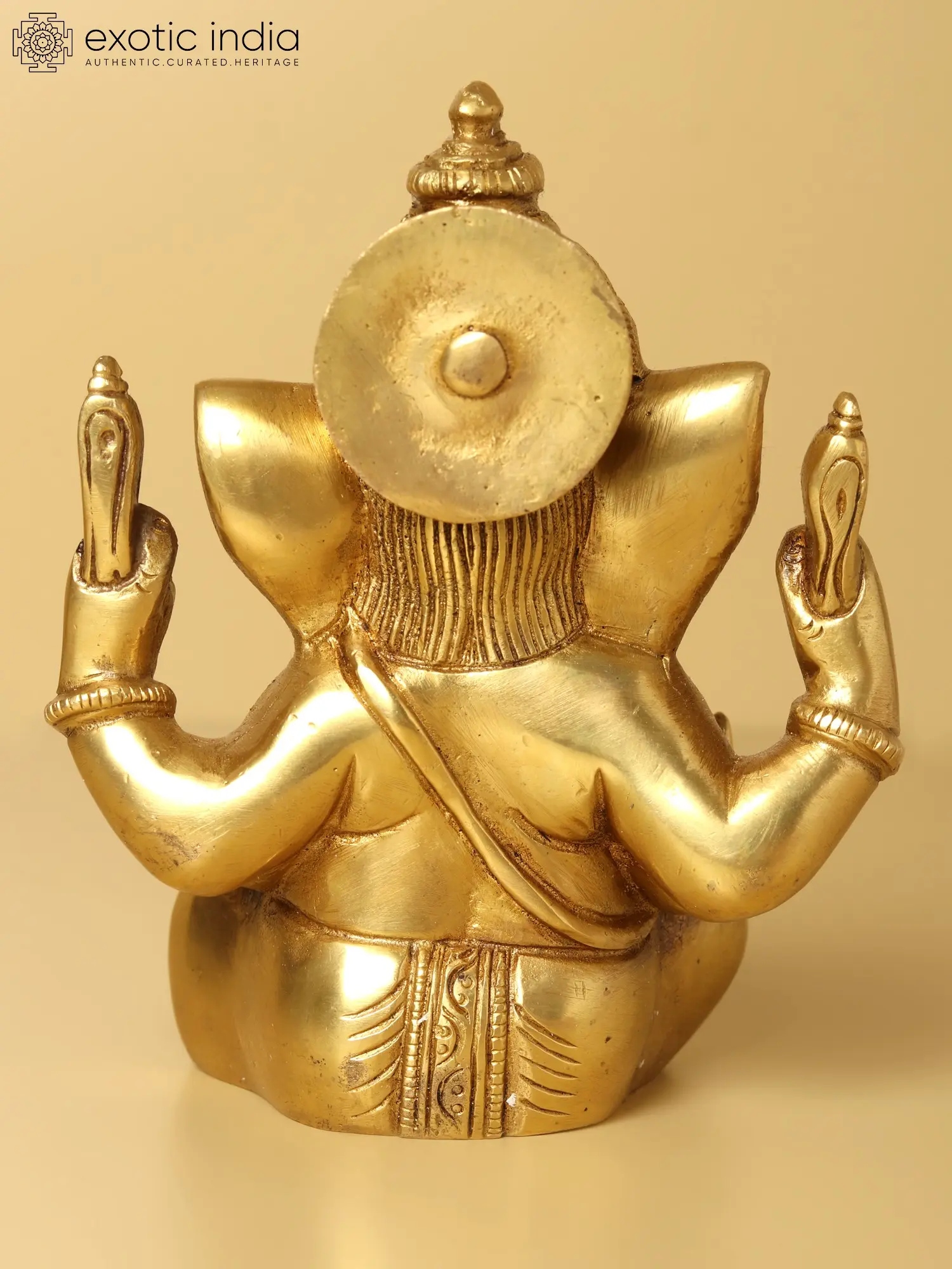 Seated gracefully, Lord Ganesha dons the “Ashirwad Mudra” (Gesture of benediction), radiating blessings and protection. His raised right hand symbolises bestowing boons upon his devotees, instilling them with positivity and fortune. In his upper hands, he delicately holds nooses, potent symbols of his ability to guide and redirect life’s path. With an elephant head denoting wisdom, Ganesha embodies intellect and discernment. This brass portrayal captures his essence as the remover of impediments and the source of prosperity. This artwork inspires you to navigate life’s challenges with confidence and embrace the opportunities ahead.