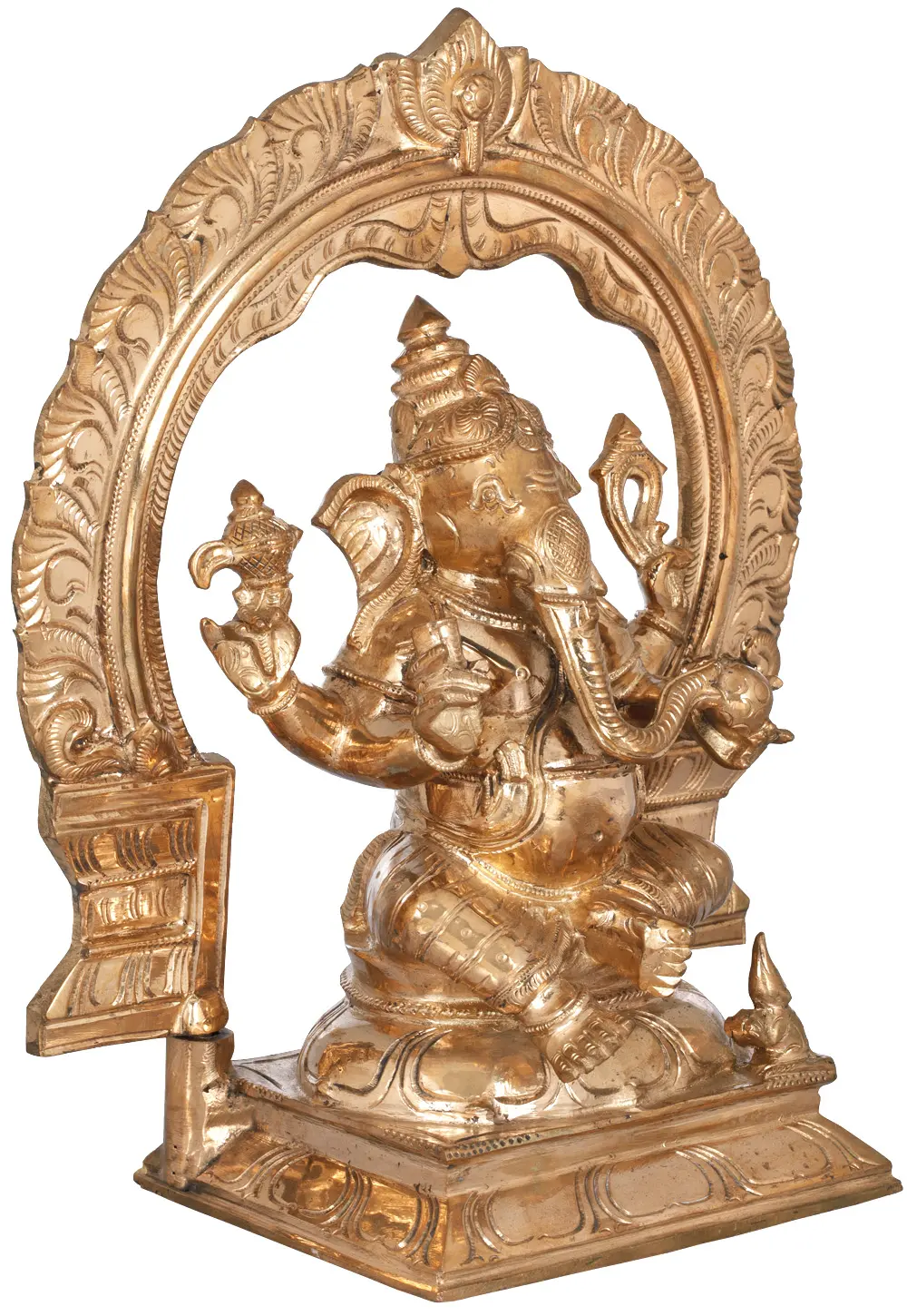 Vighnaharta Ganesha is the god of beginnings as he is worshipped before the beginning of any task. A god with the chubby, gentle, wise and an elephant headed face is found in big-small idols in all Hindu houses. As this sculpture is made up of panchaloha bronze statue, it is believed that this metal brings balance in life, self-confidence, good health, fortune, prosperity, peace of mind; the big arch chiselled in floral chains forms the beautiful backdrop depicting a positive vibe around the surroundings.