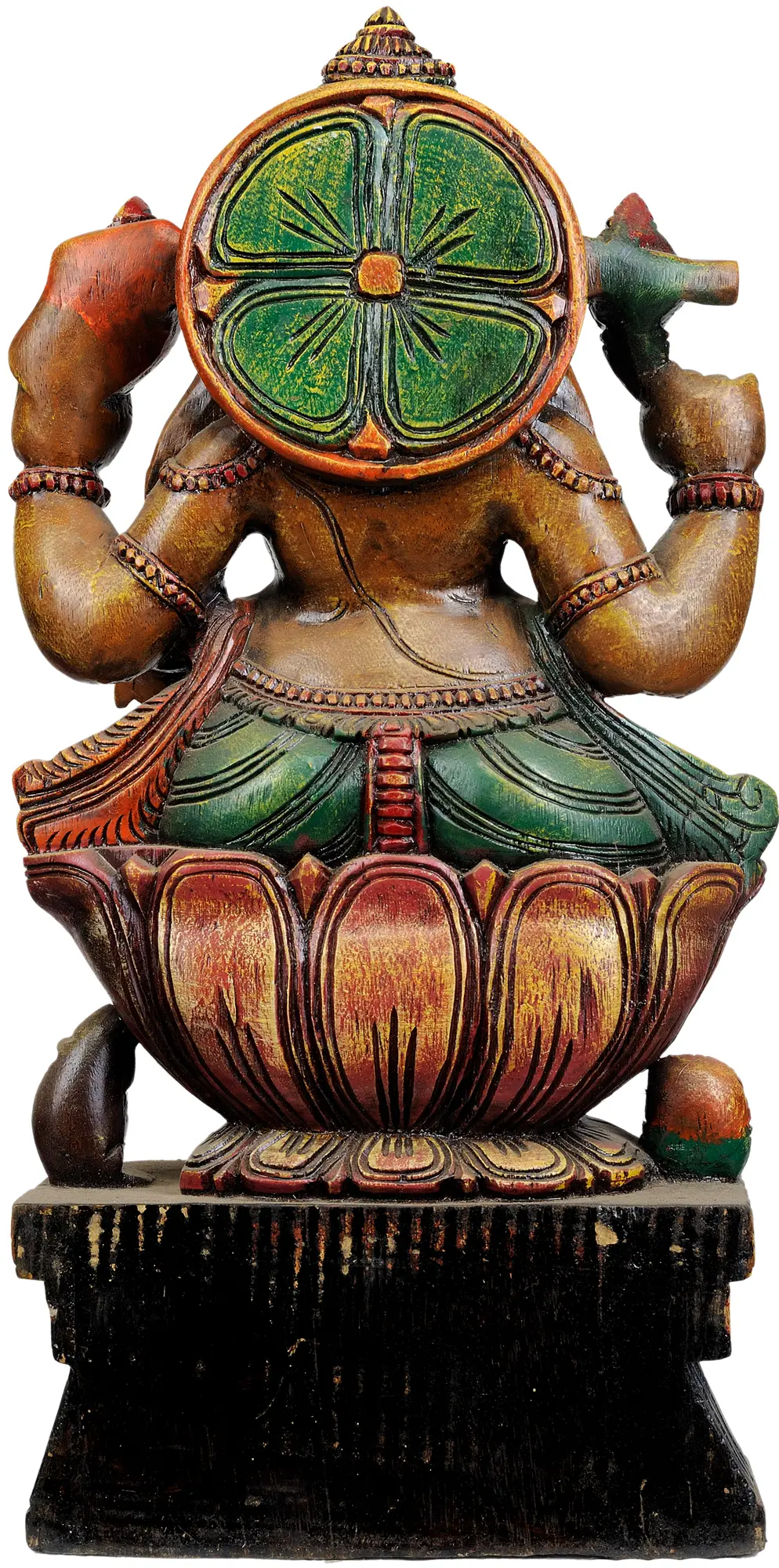 The distinctive style of this sculpture reflects the rich heritage of South Indian temple art. These time-honored techniques involve intricate carving and careful application of color, resulting in a piece that resonates with spiritual energy. The lotus upon which he sits, representing purity and enlightenment, is rendered with incredible detail, while the ornate adornments underscore the reverence he commands. This is not merely a carving; it is a portal to the sacred spaces where art and devotion converge.