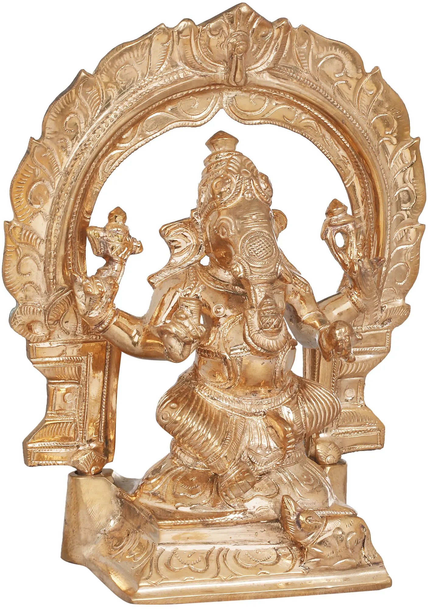 Invite divine blessings and the removal of obstacles into your home or sacred space with this exquisite bronze statue. Crafted with meticulous detail in Swamimalai, a region renowned for its traditional bronze casting heritage, this piece captures the benevolent form of Lord Ganesha, the beloved elephant-headed deity. The lustrous bronze, meticulously shaped and polished, conveys a sense of timeless elegance and spiritual depth. The artistry of this statue is evident in every curve and contour. Lord Ganesha is depicted seated, radiating an aura of peace and wisdom. His trunk, poised and expressive, is a focal point, while his multiple hands are adorned with symbolic attributes. Each element is rendered with the precision and reverence that characterizes traditional Indian craftsmanship. The accompanying archway, intricately carved with ornate patterns, further enhances the grandeur of the sculpture, framing the deity and drawing the eye towards his divine presence. This work is not merely an object of decoration but a conduit to spiritual connection and a reminder of the auspiciousness that Lord Ganesha represents.