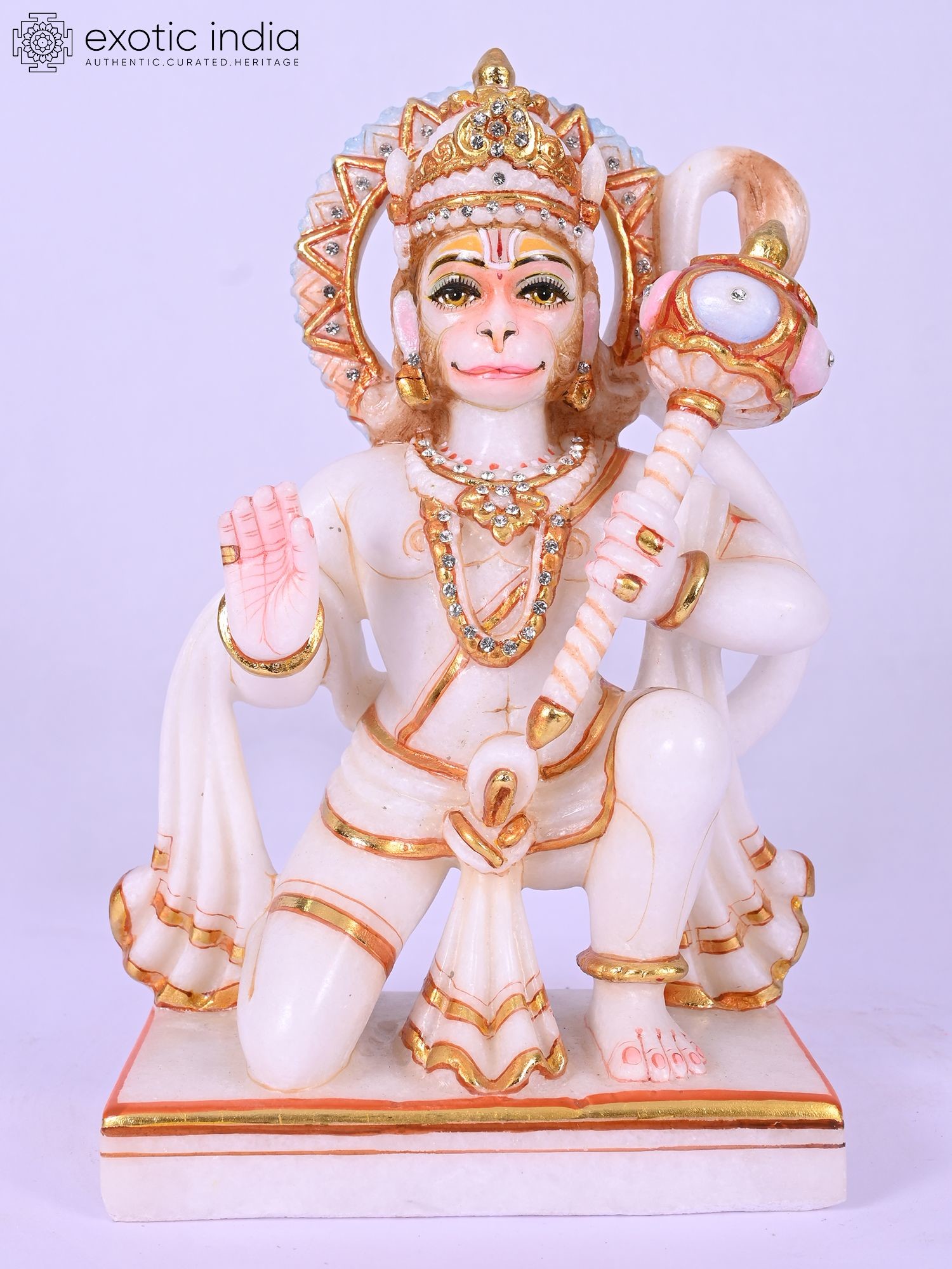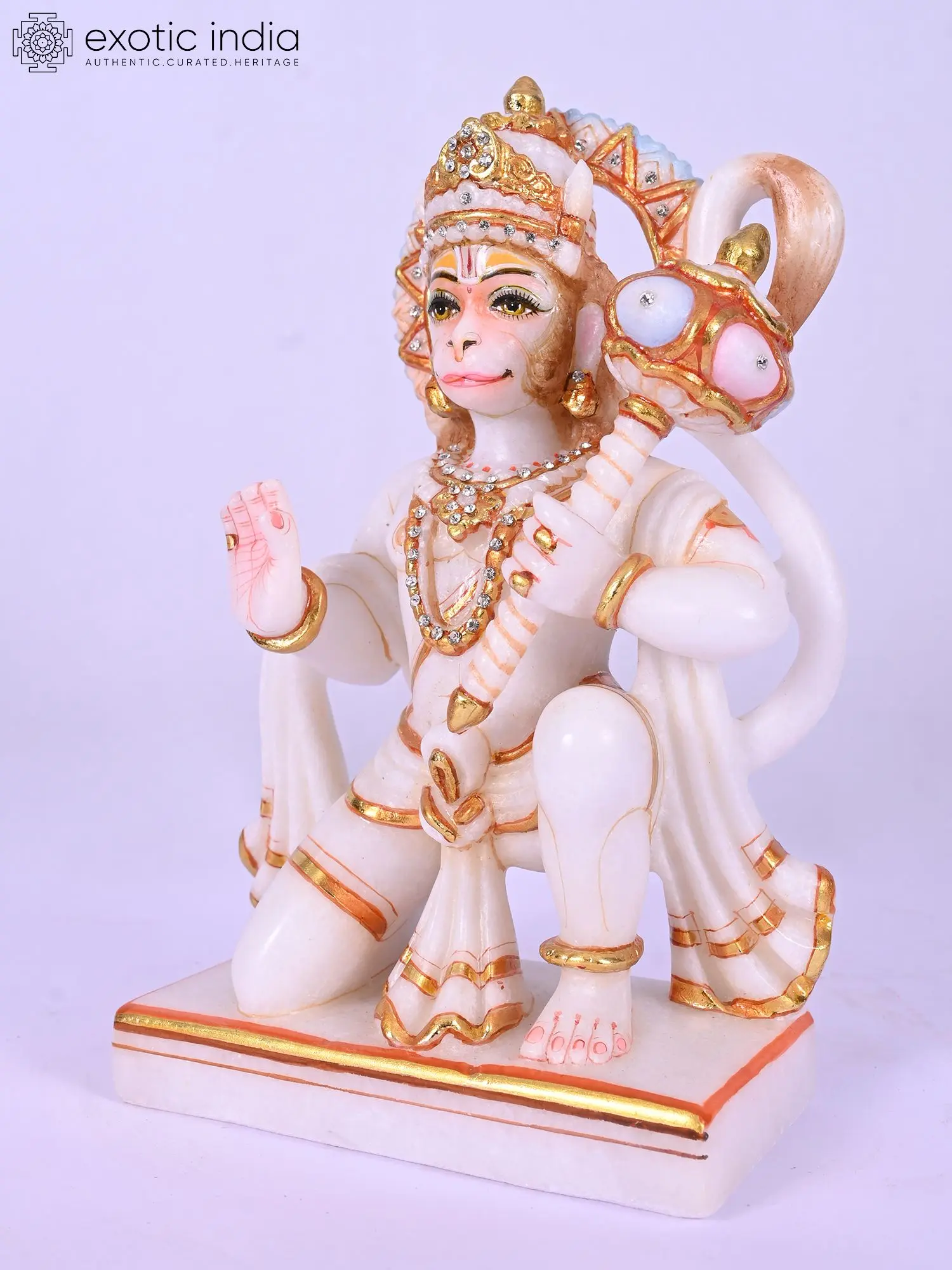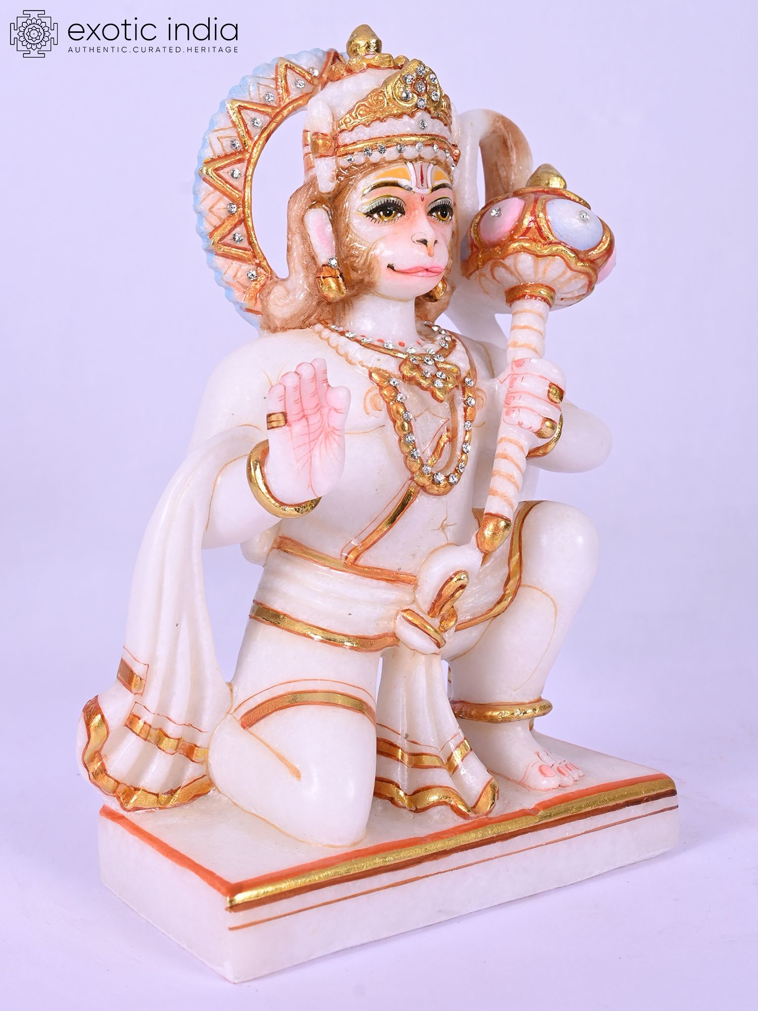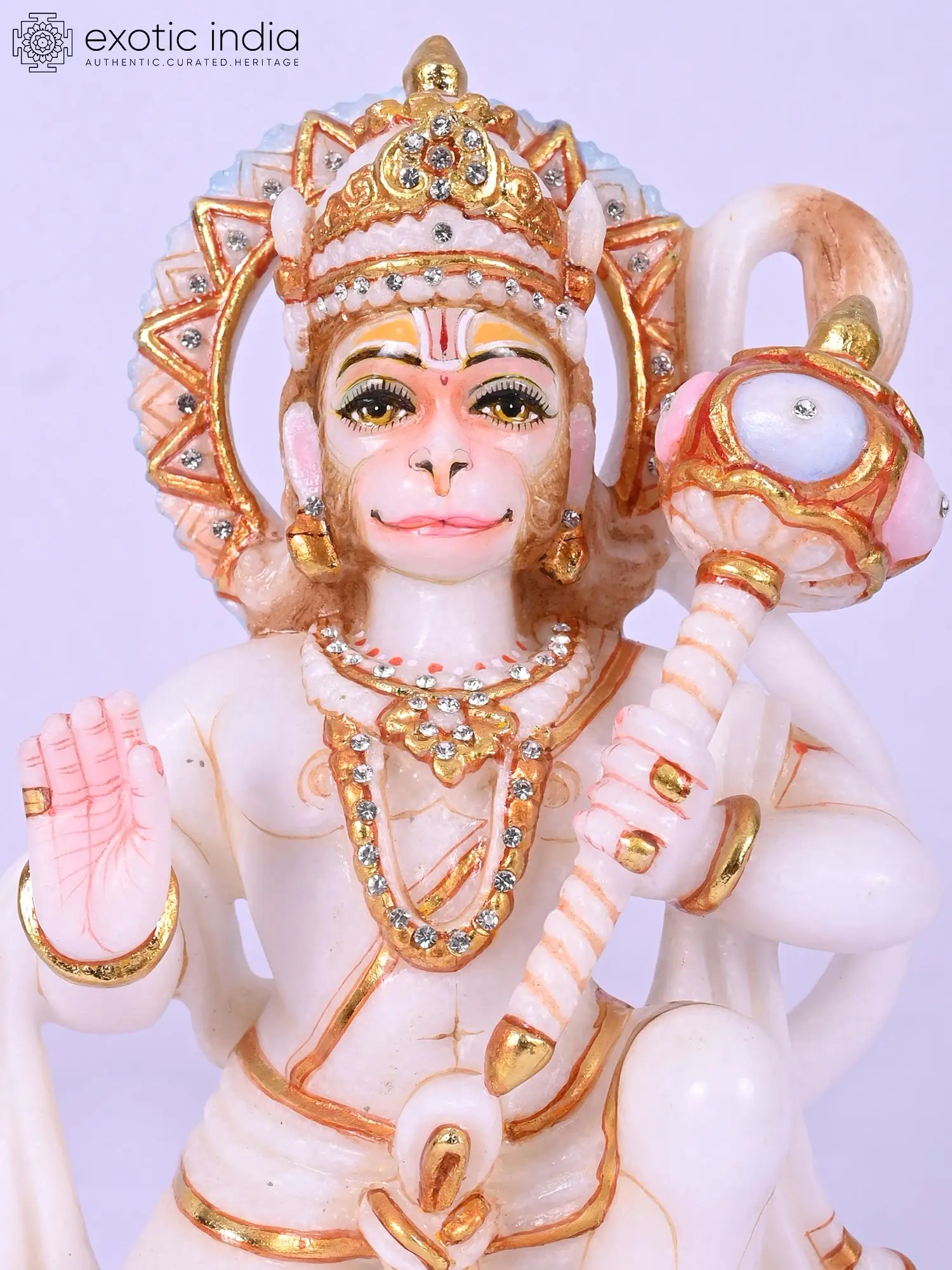 The ten-inch form is rendered with exquisite detail, from the delicately painted eyes that seem to hold ancient wisdom to the intricately adorned crown and necklaces. The flowing fabric, accented with shimmering gold leaf, drapes elegantly, while the iconic mace rests assuredly in hand. Its balanced dimensions create a commanding yet harmonious presence.