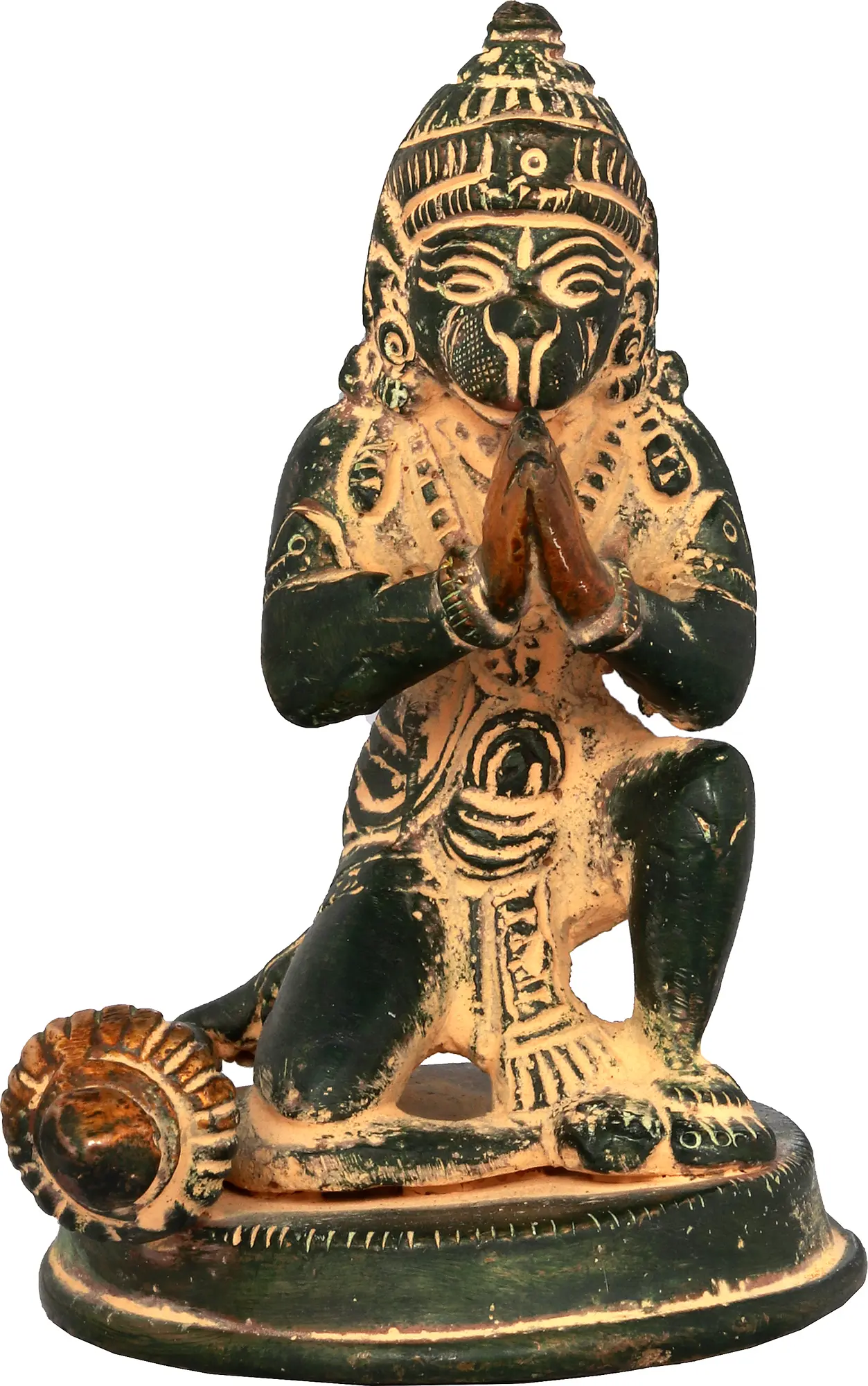 This exquisite brass statue captures the essence of Lord Hanuman, a beloved deity revered for his unwavering devotion, immense strength, and selfless service. Hanuman, often depicted as a divine Vanara (a monkey-like humanoid), is a central figure in the ancient Indian epic, the Ramayana. He is celebrated for his pivotal role in assisting Lord Rama in his quest to rescue Sita from the clutches of the demon king Ravana. This particular depiction showcases Hanuman in a humble and devout posture, with his hands clasped in prayer, signifying his profound reverence and surrender to the divine. The artistry involved in crafting this piece highlights the intricate details of his form, from the sculpted crown atop his head to the muscular build that hints at his formidable power.