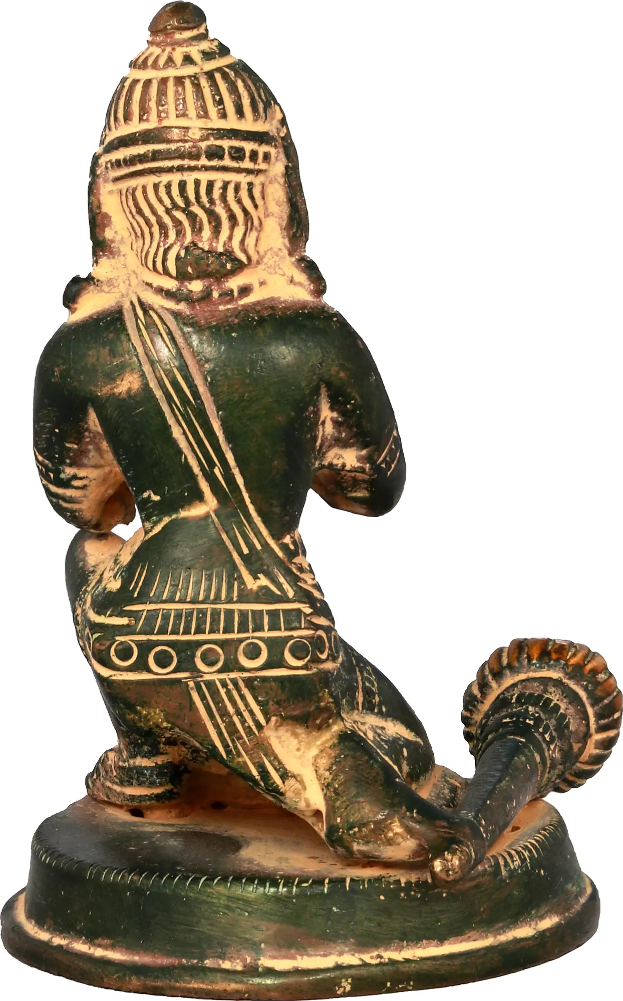 Hanuman is worshipped across India and beyond, not just as a divine being but also as a symbol of devotion, perseverance, and spiritual discipline. He is often invoked for strength in the face of adversity, for courage to overcome obstacles, and for the blessings of good health and long life. The green and golden patina on this brass statue adds a layer of aesthetic appeal, suggesting the passage of time and the reverence with which such figures are often treated. The detailed adornments and the distinct facial expression convey a sense of serenity and determination, inviting introspection and a connection to the spiritual heritage he represents. This piece is more than just an artifact; it is a tangible representation of faith and a reminder of the enduring values that Hanuman signifies in Hindu tradition.