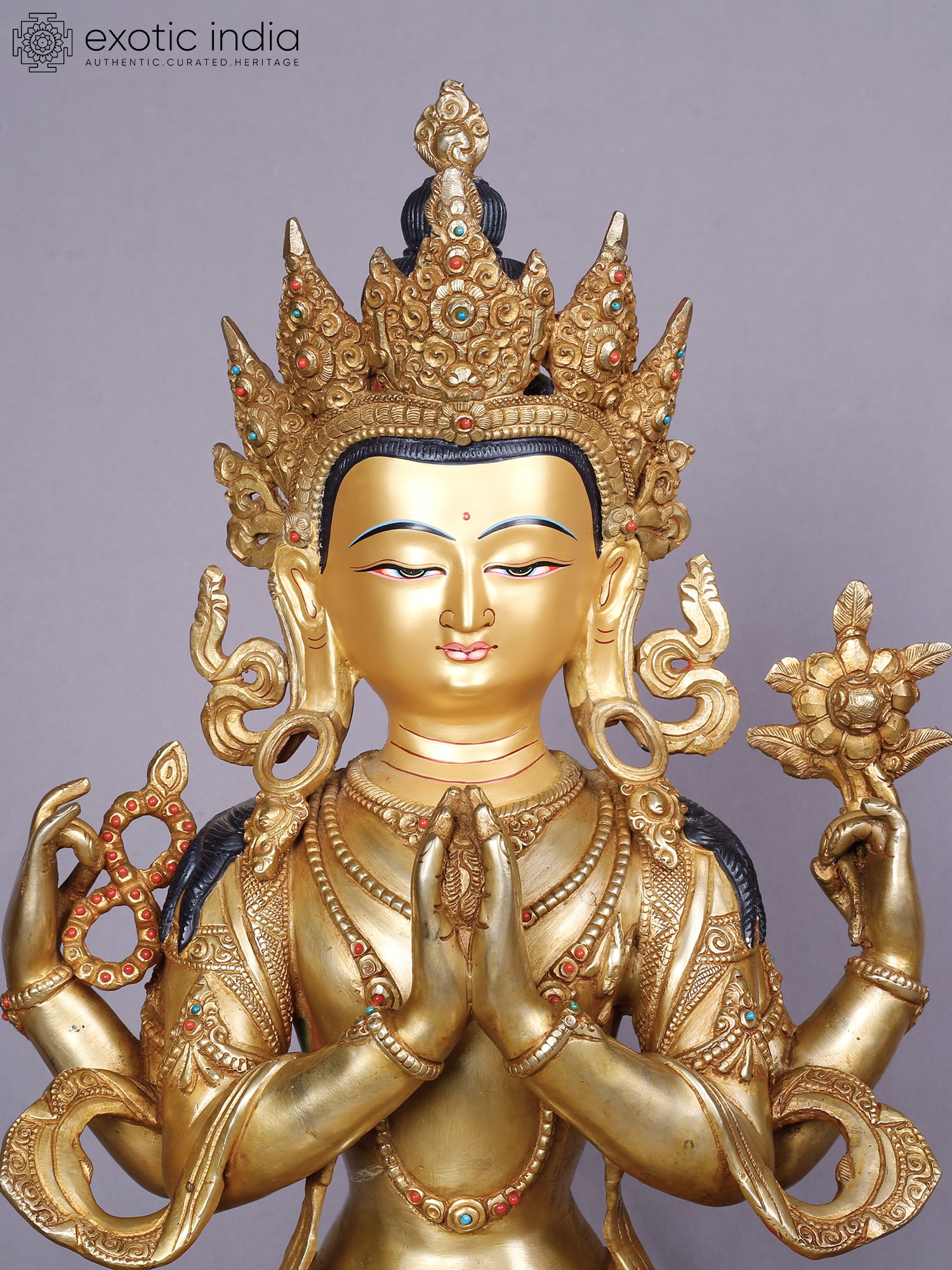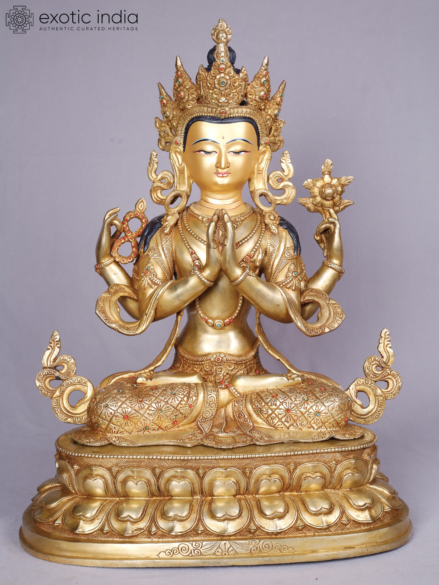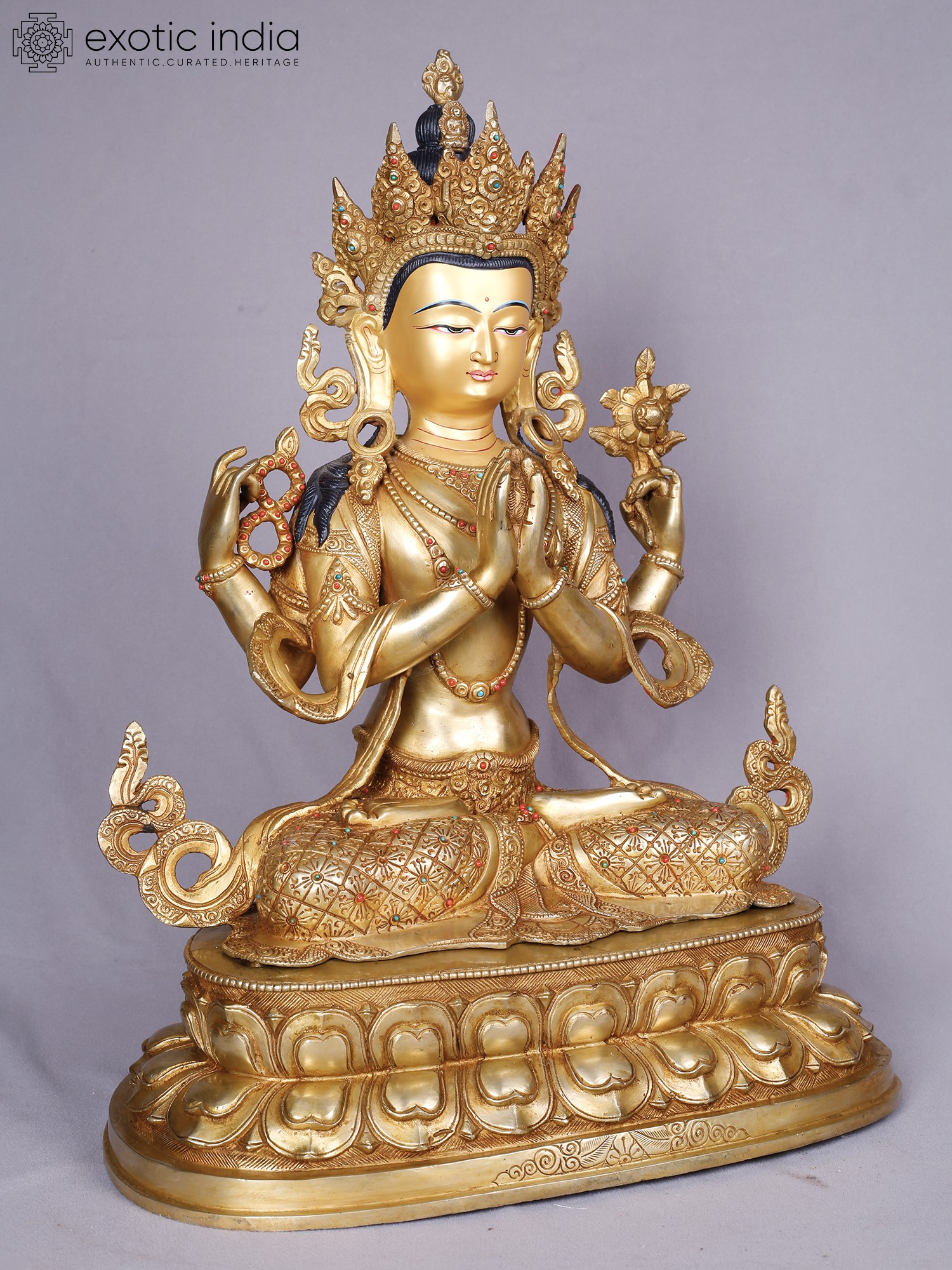 The rich gold plating accentuates the refined contours, while subtle inlays of precious stones – vibrant reds and blues – add pops of color that draw the eye. The multi-faceted headdress, a symbol of enlightenment, crowns the figure with an aura of supreme wisdom and authority. Its impressive stature, measuring 18.0 inches in height, 13.0 inches in width, and 9.0 inches in depth, ensures it commands attention as a focal point of reverence.