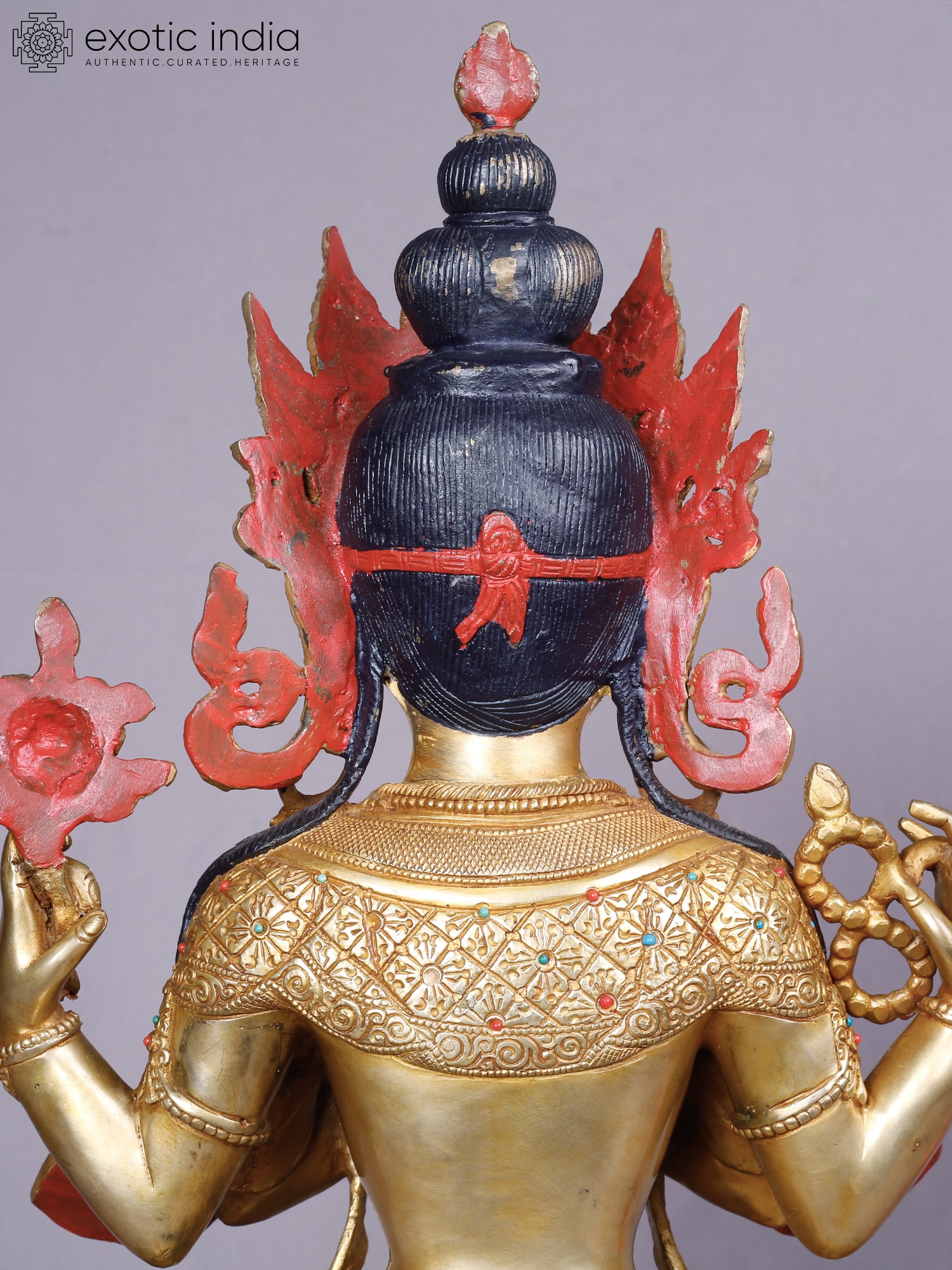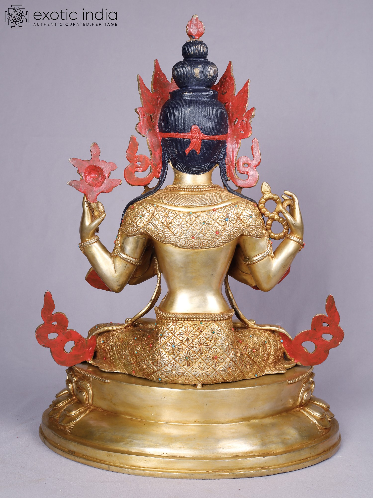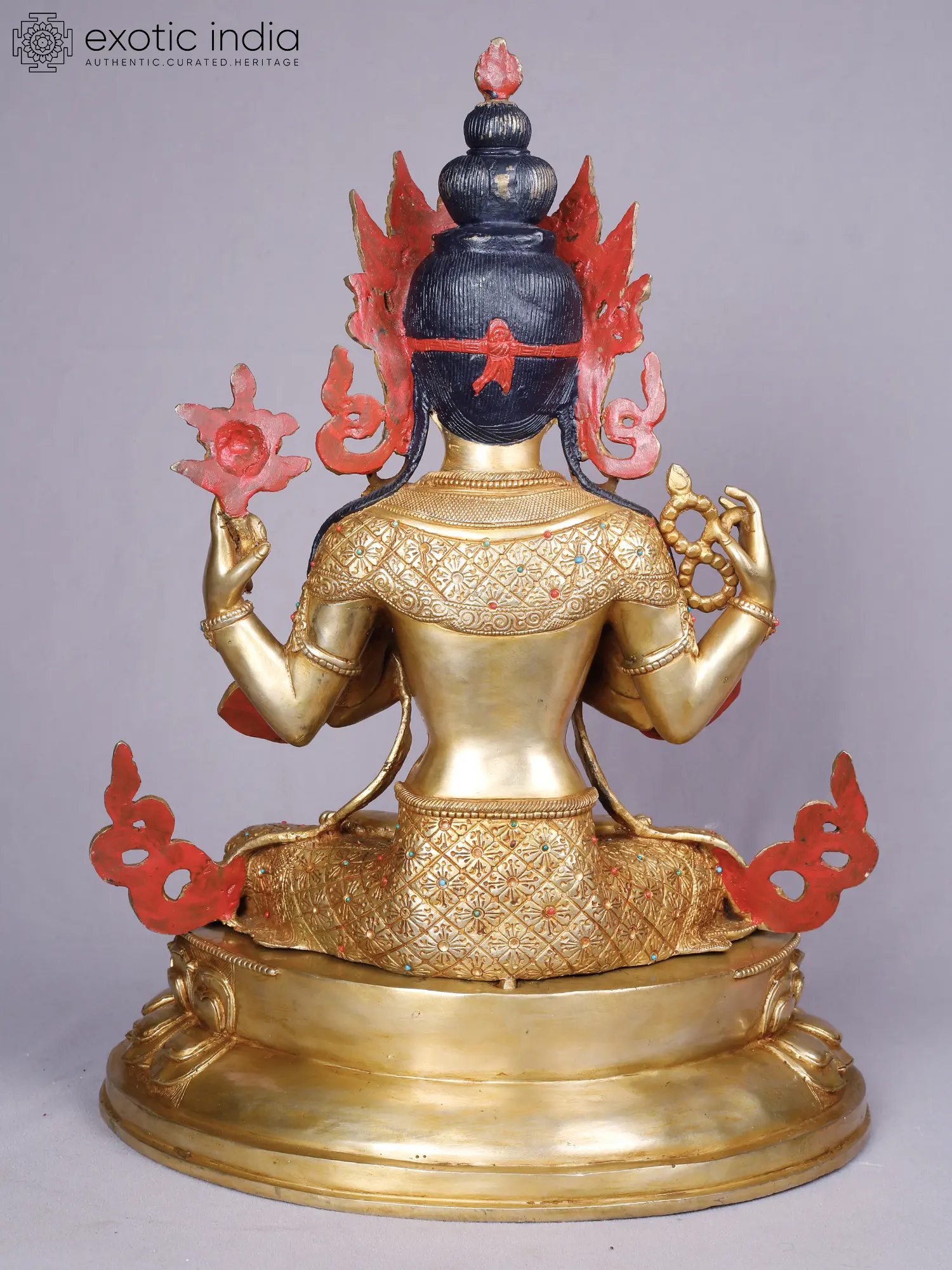 The rich gold plating accentuates the refined contours, while subtle inlays of precious stones – vibrant reds and blues – add pops of color that draw the eye. The multi-faceted headdress, a symbol of enlightenment, crowns the figure with an aura of supreme wisdom and authority. Its impressive stature, measuring 18.0 inches in height, 13.0 inches in width, and 9.0 inches in depth, ensures it commands attention as a focal point of reverence.