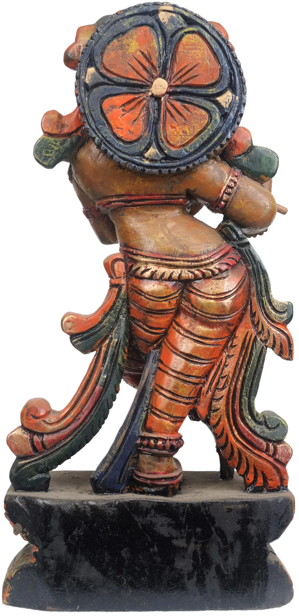 This meticulously carved wooden statue embodies the divine essence of Krishna, a revered deity in Hinduism. More than just a representation, this piece captures a moment frozen in time, radiating the charm and spiritual power that Krishna embodies. The statue features Krishna in a dynamic tribhanga pose, a characteristic three-bend stance that exudes grace and balance. He holds his flute, ready to play a melody that captivates hearts and stills the mind. The statue's color palette and detailing reflect the artistic traditions of South Indian temple craftsmanship.