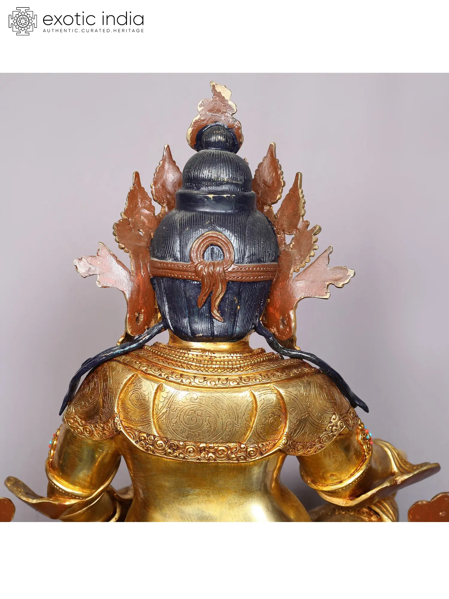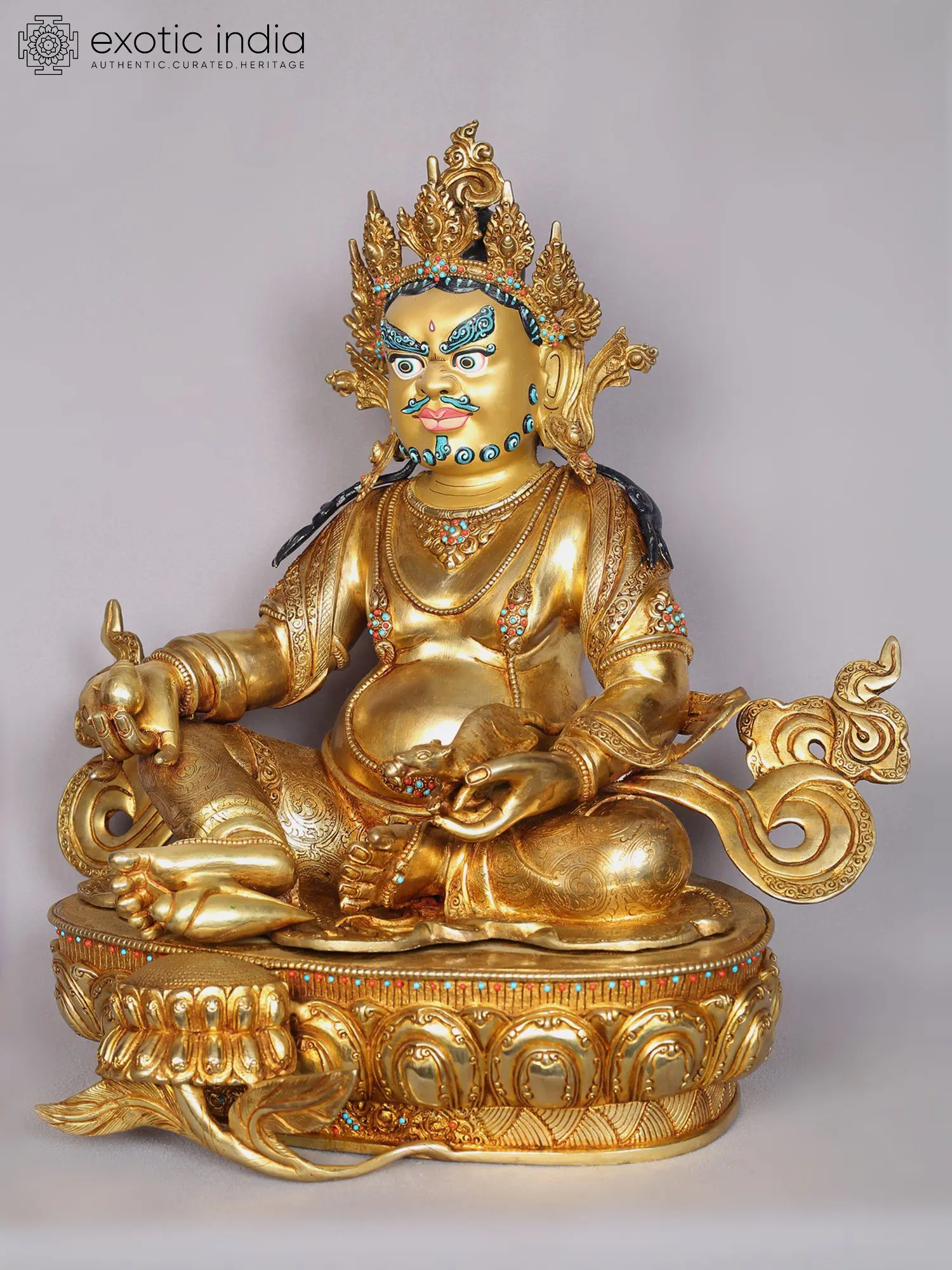 With bold eyes, flaring nostrils, a large mouth, and a plump body, Lord Kubera in this gilded copper Nepalese statue appear to be the divine guardian one seeks to protect one’s wealth and auspiciousness. Draped in fine brocaded attire whose details are beautifully captured by the sculptor, the composition of Kubera in this icon contains a repetition of conch as a motif, which is a symbol of his feminine counterpart from the oceanic world, who according to Buddhist legends brought with her the heavenly riches which Kubera bestows on his worshippers.