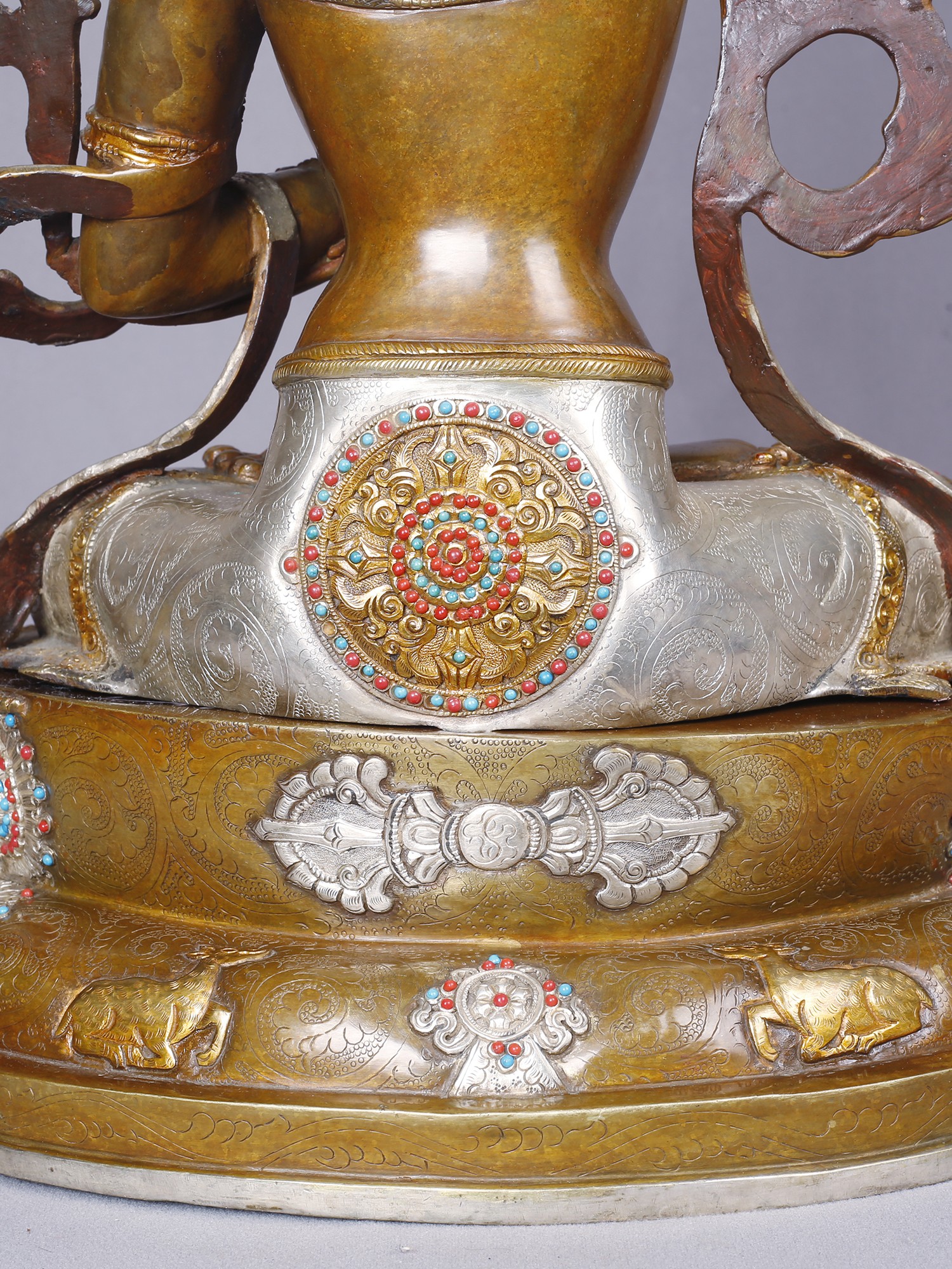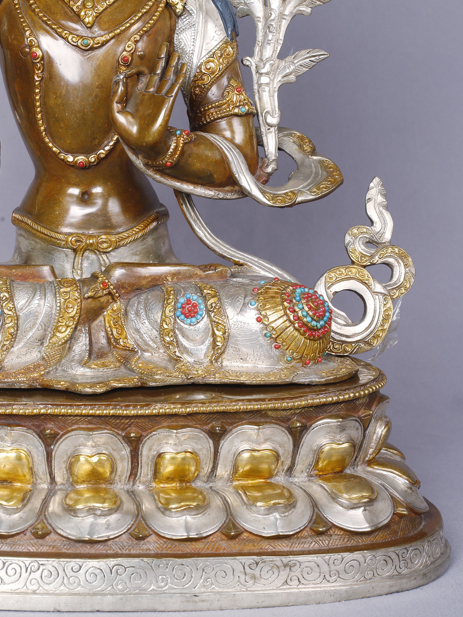 Handcrafted with exceptional skill, this piece is brought to life through the enduring medium of copper, a material valued for its malleability and resonance. It is then meticulously plated with lustrous gold and silver, a testament to the ancient techniques of Tibetan metalworking. Every detail, from the delicate adornments to the flowing robes, speaks to the dedication and artistry of its creators, ensuring a work of unparalleled quality.