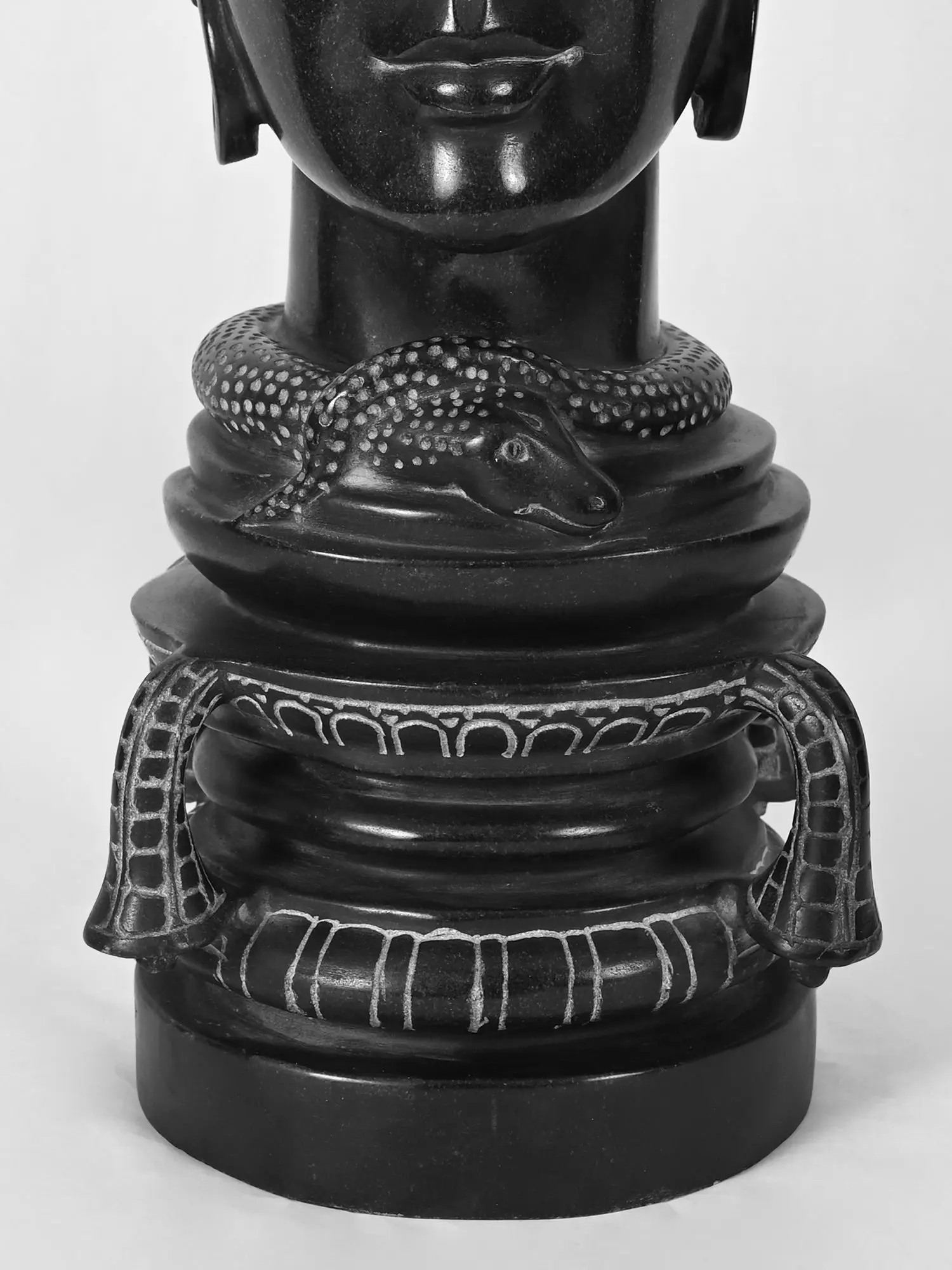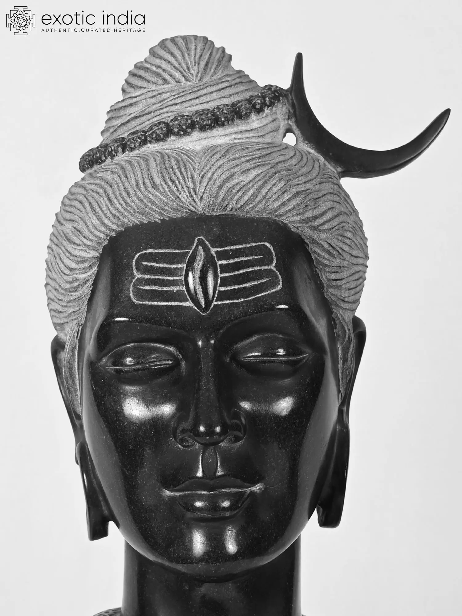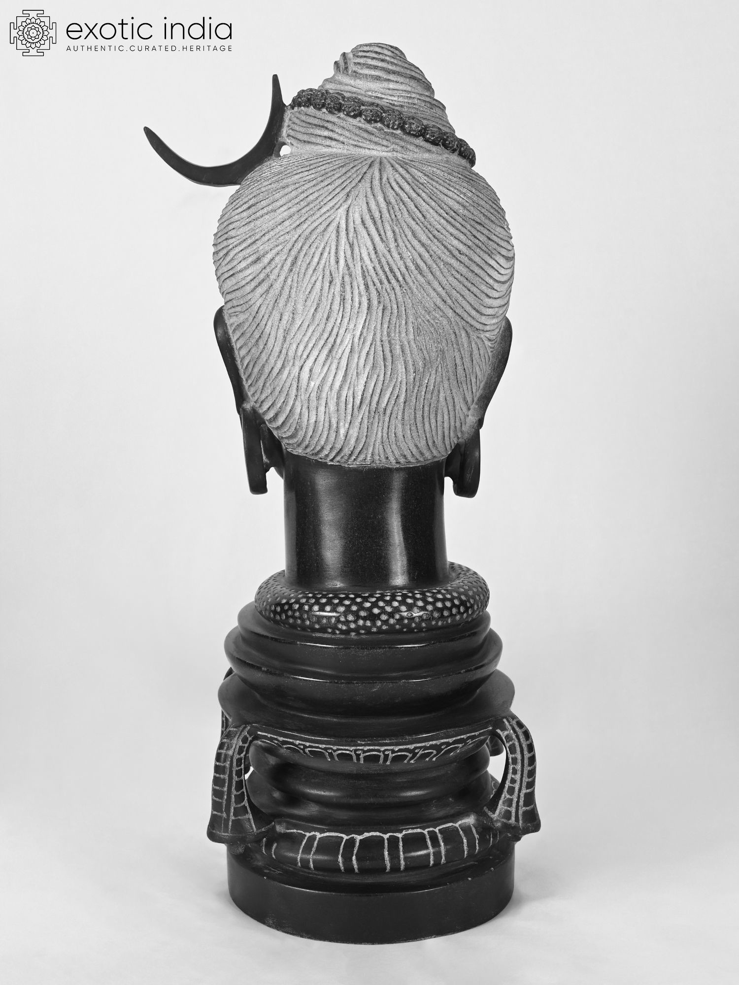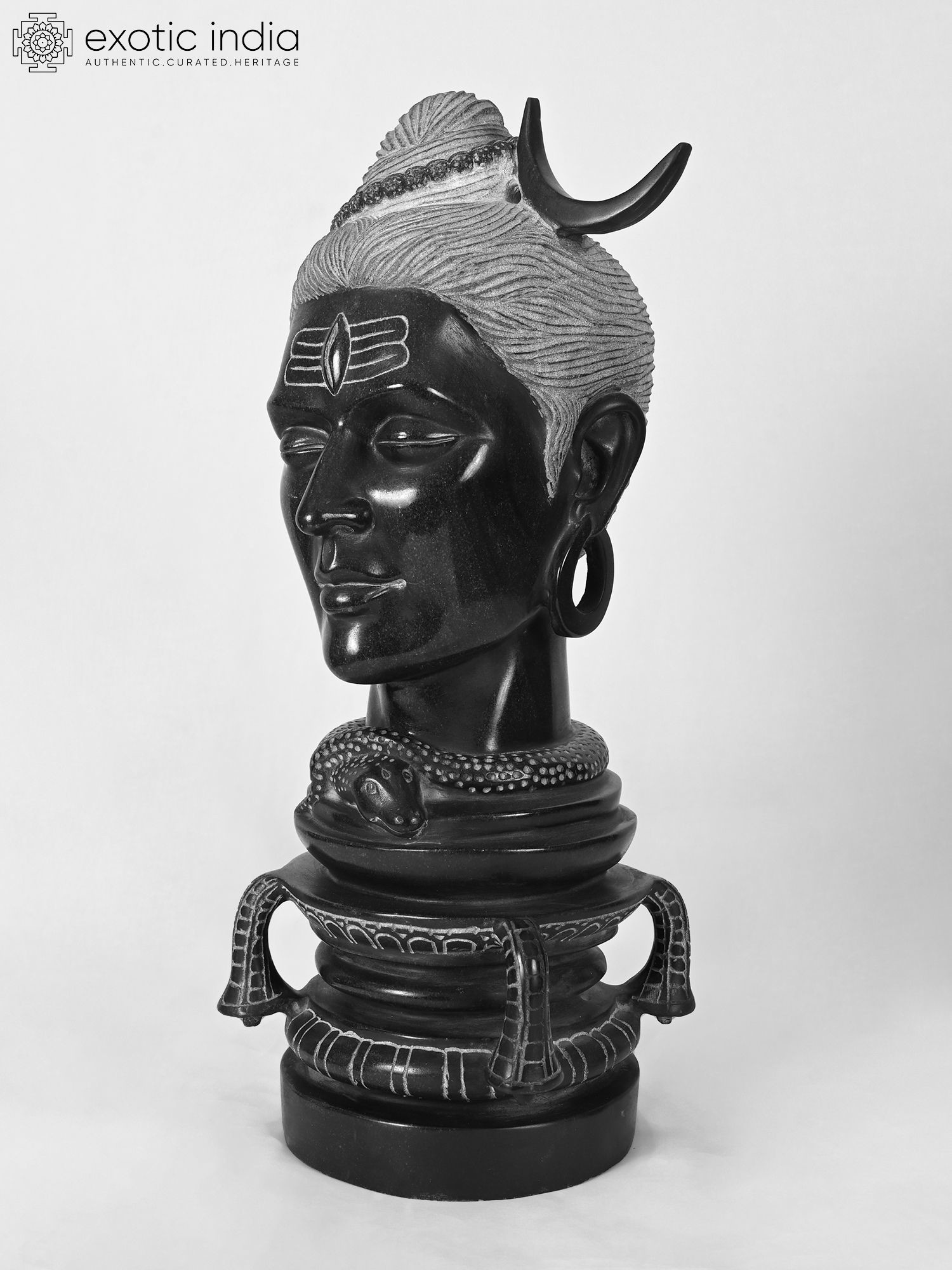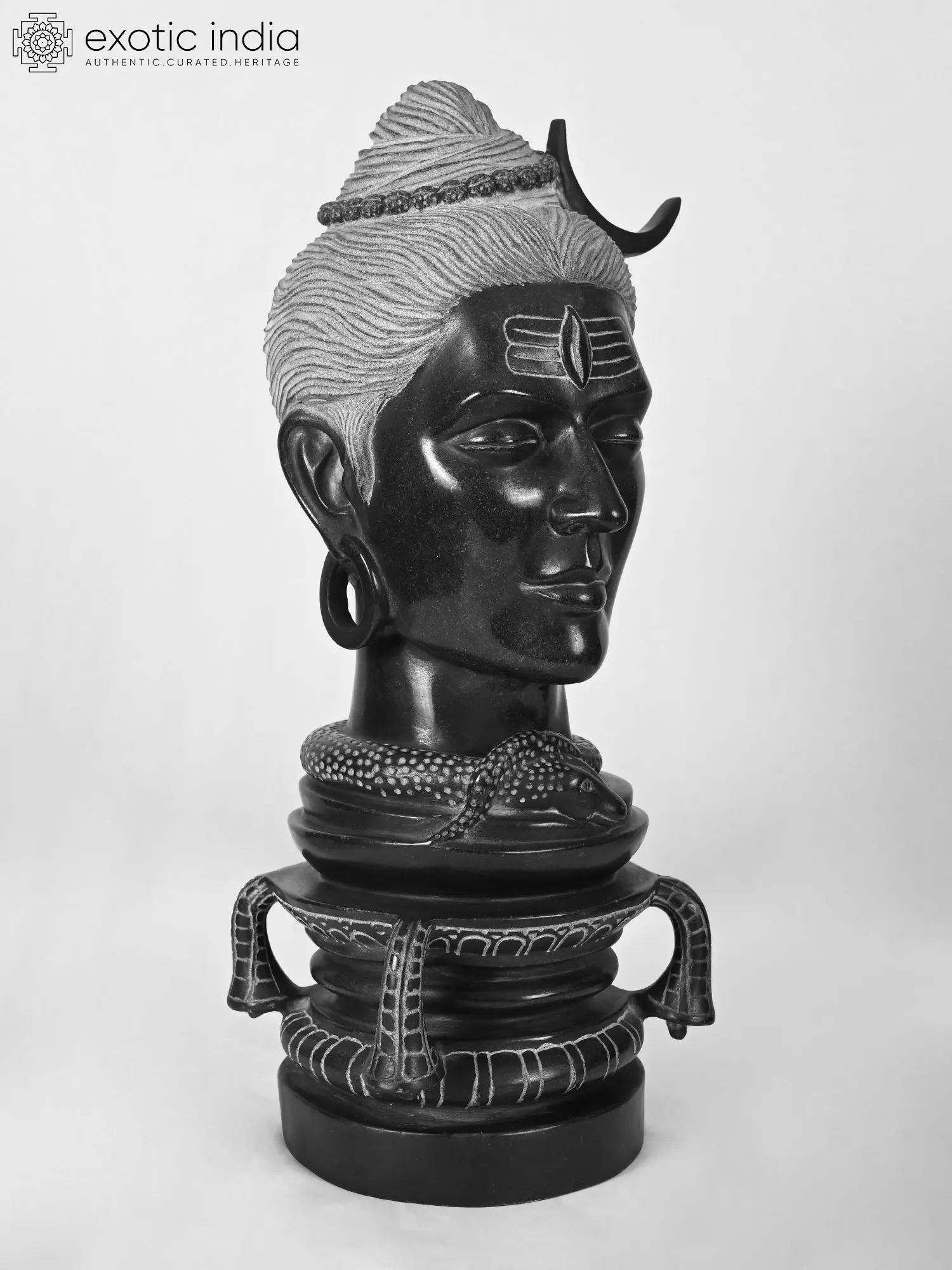 Standing at an impressive 17 inches, this bust is a powerful depiction of Lord Shiva, the destroyer and transformer. The third eye, a symbol of supreme consciousness and insight, is subtly etched onto the forehead, while the crescent moon atop the head signifies his dominion over time. The serpent coiled around the neck represents his mastery over ego and the cyclical nature of existence. Its presence is a reminder of the raw power that rests in balance and control, a signature characteristic of this revered deity.