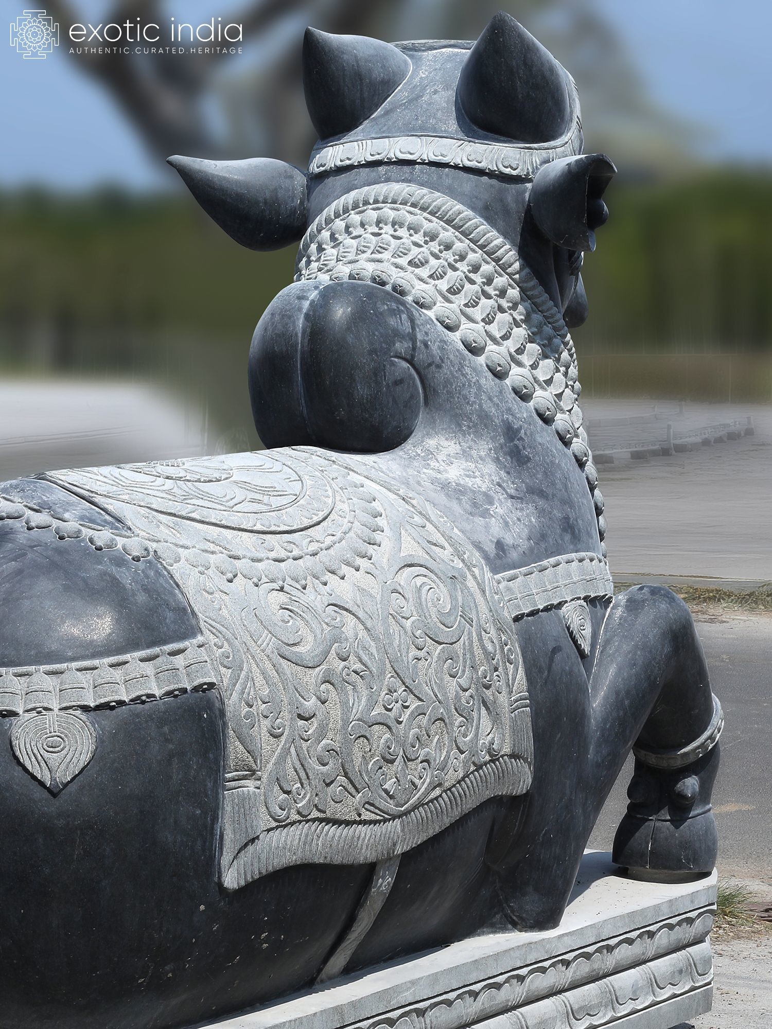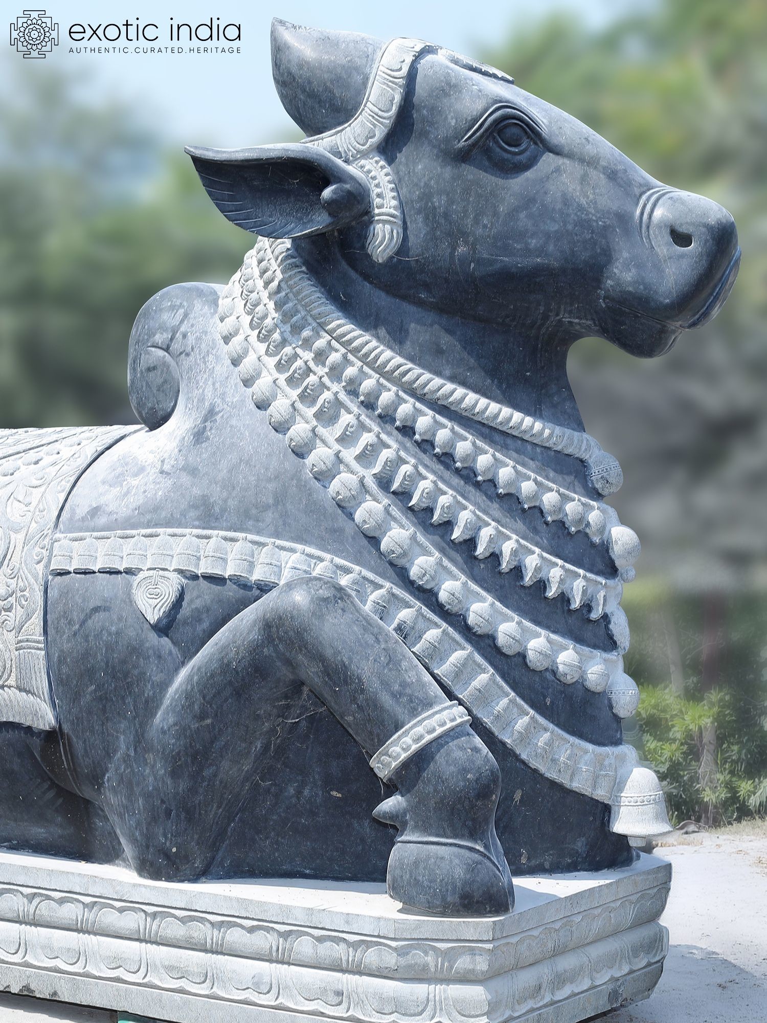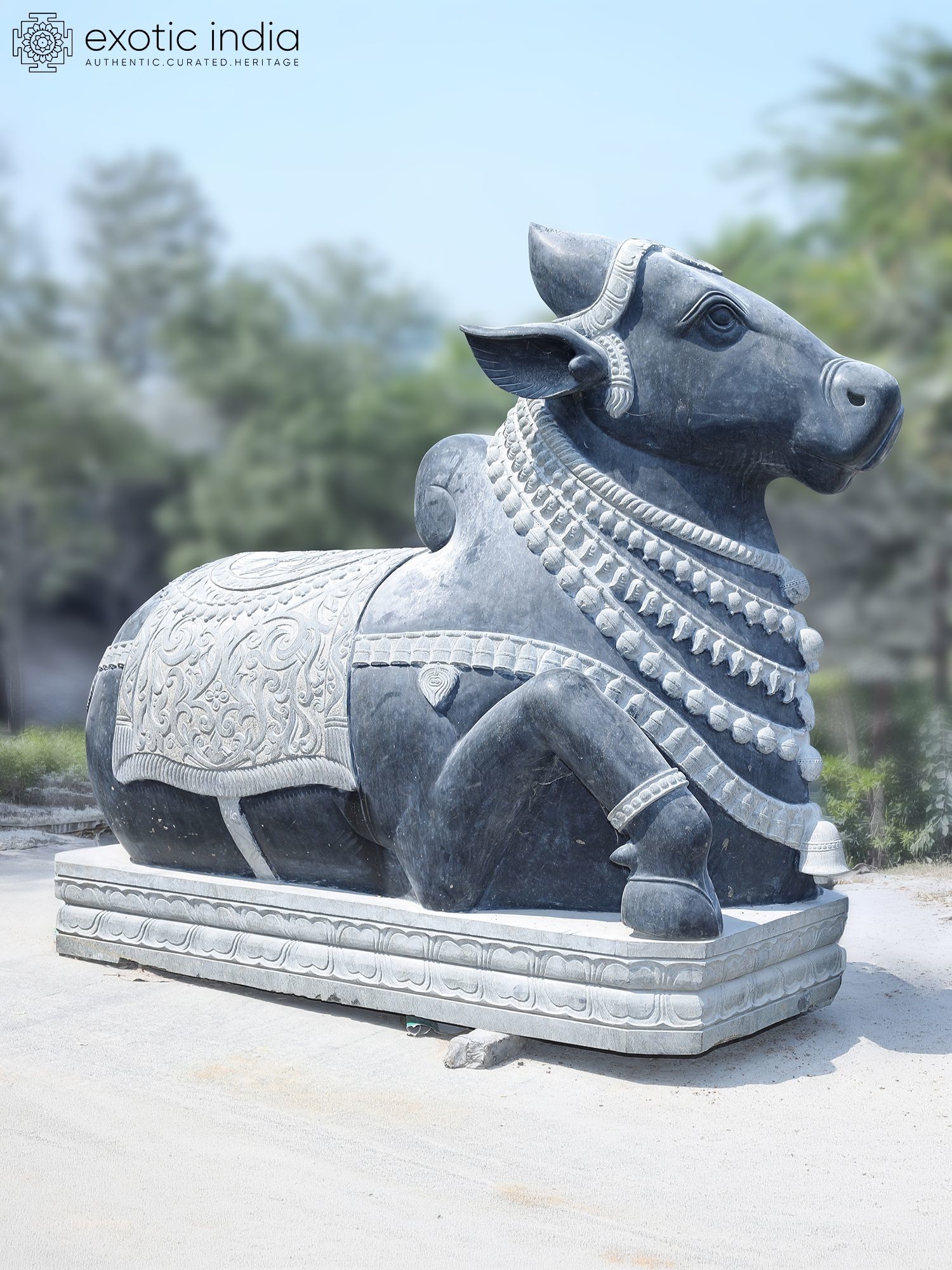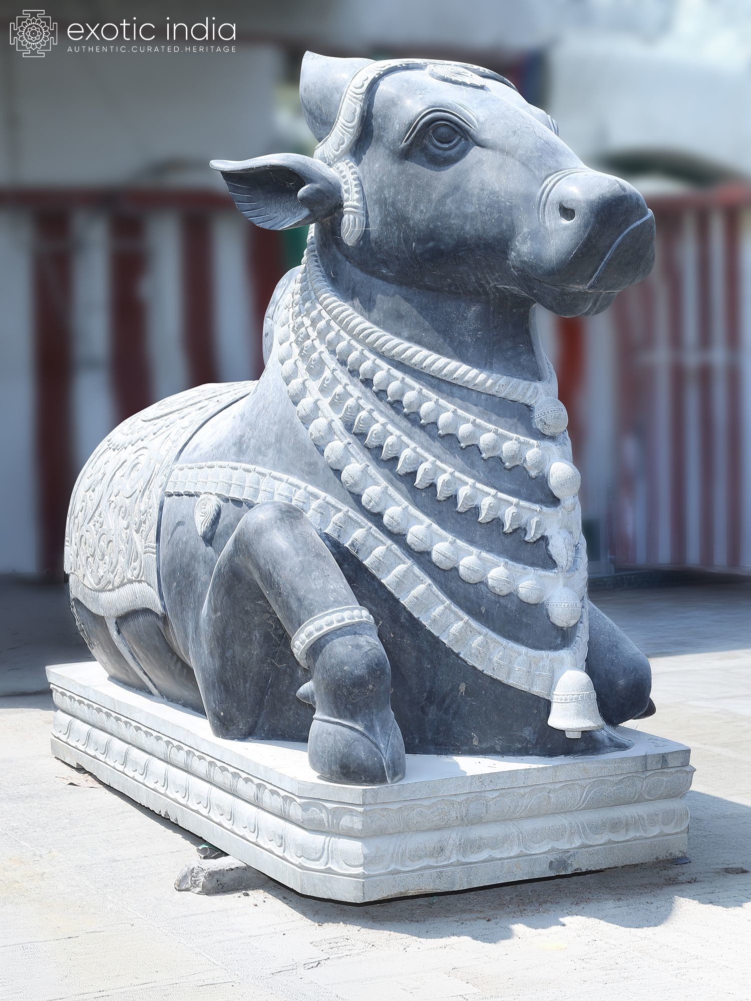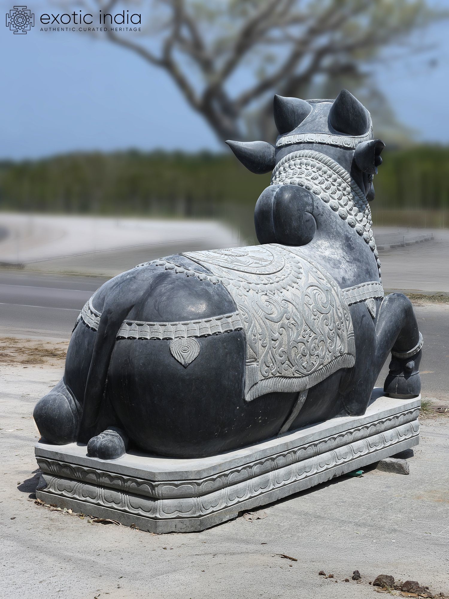 Majestic 84-inch granite statue depicting Nandi, the sacred bull and loyal vahana of Lord Shiva.