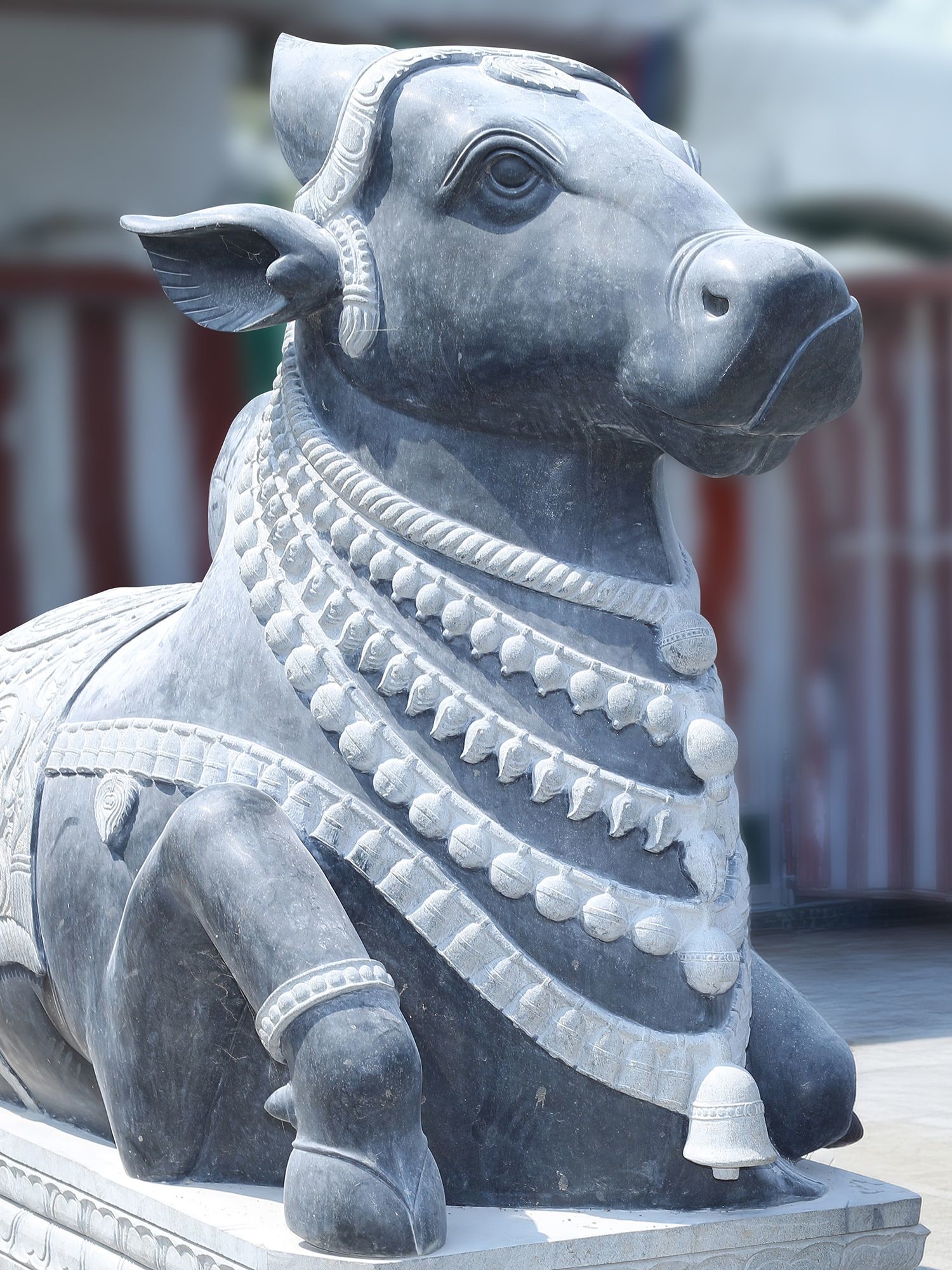 Intricately carved details showcase traditional iconography and the revered form of Nandi.