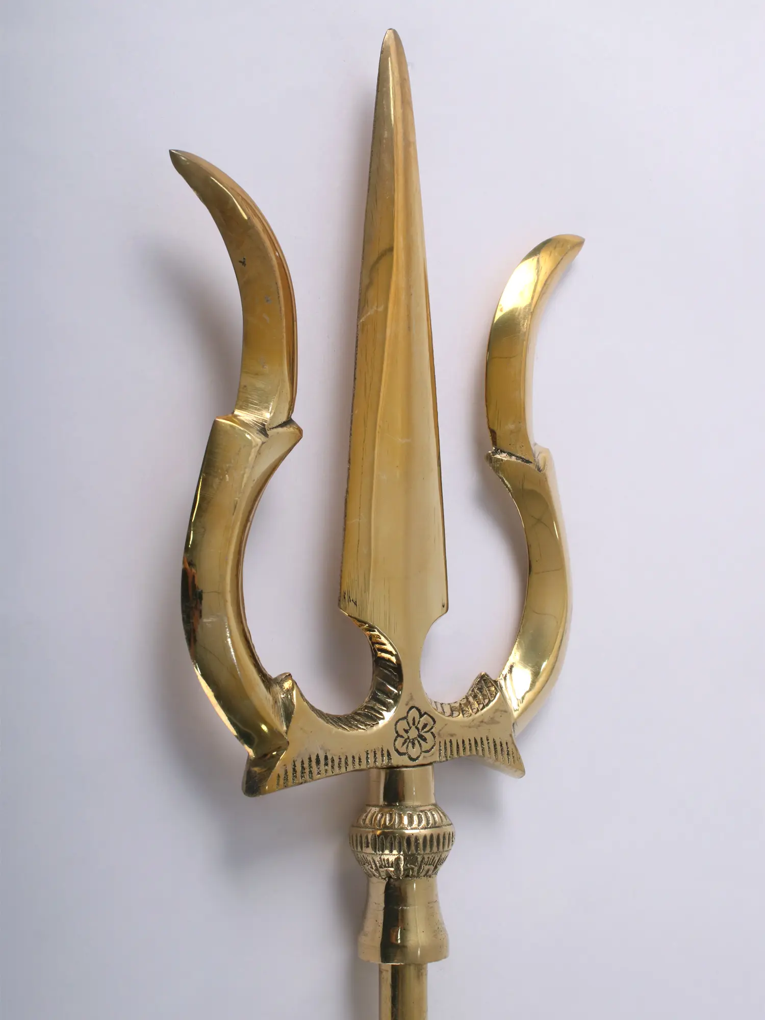 A brass Trishul, which serves an essential spiritual purpose, is a treasured emblem in Hinduism. It depicts Lord Shiva's mighty trident, a symbol of his cosmic might, with three prongs joining to form a single point. The three prongs of Trishul represent the Hindu trinity of Brahma, Vishnu, and Mahesh. It is also linked to other critical spiritual religious symbols, such as the three Kaalas, representing the past, present, and future. Trishul is also linked to the Lokas of swarg, bhu, and patal. Lord Shiva, the remover of false ego and Maaya (attachment), is shown with the Trishul, conquering illusion and greed demons and urging people to follow the spiritual path.