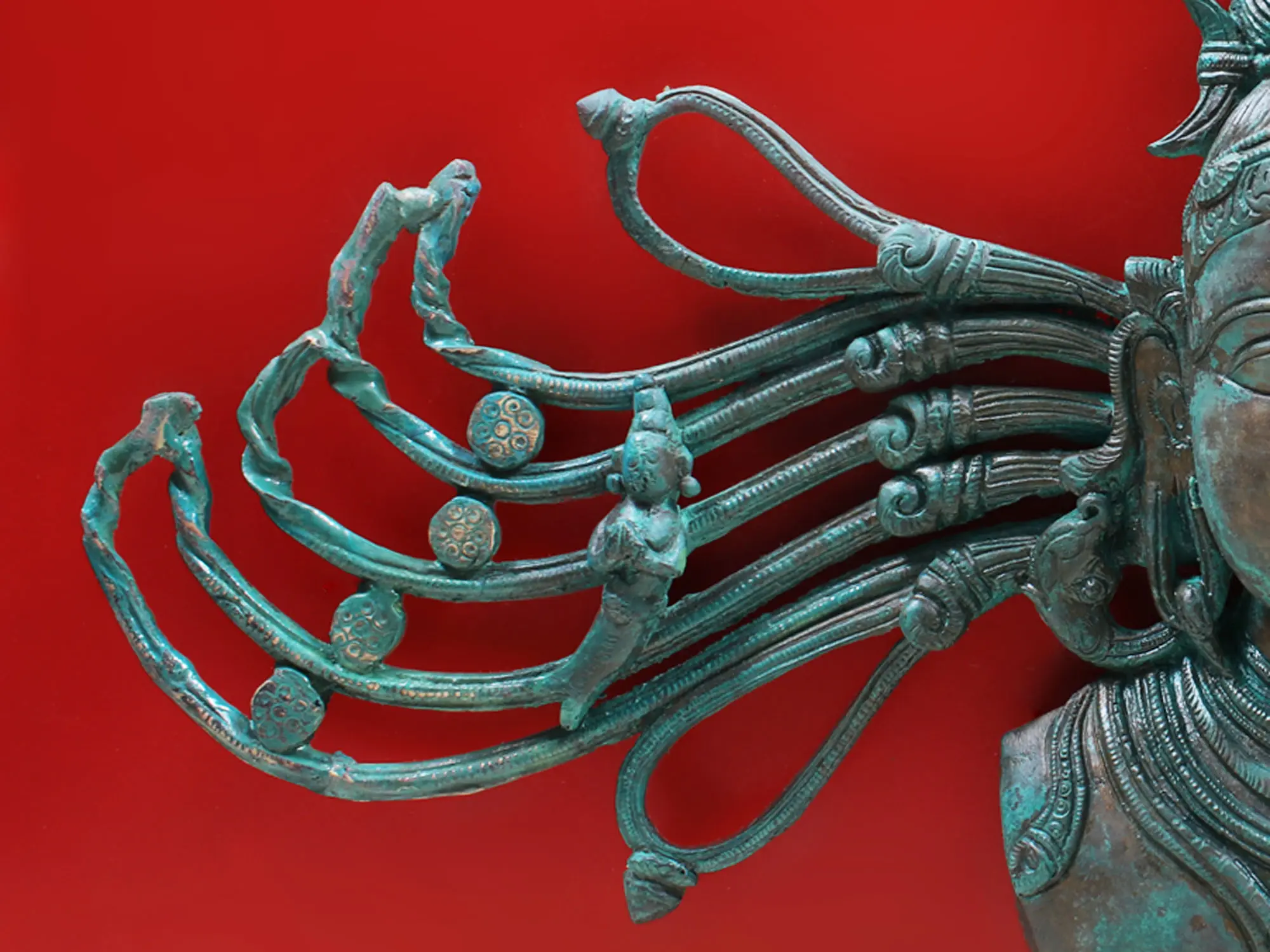 What truly distinguishes this piece is the dramatic depiction of Shiva's flying tresses, which extend outwards like wings of divine energy. In Hindu mythology, Shiva's matted locks, or 'jata,' are said to contain the waters of the sacred Ganges, which he brought down to earth to quench its thirst. Here, these locks are animated, transformed into sweeping arcs and curves that seem to capture the very essence of movement and cosmic dance, the 'Tandava.' Each strand is sculpted with dynamic flow, interspersed with small, circular ornaments and even miniature figures, suggesting the vibrant dynamism of creation and destruction that Shiva embodies. This visual representation evokes the tales of Shiva dancing the cosmos into existence and, when necessary, dissolving it to allow for rebirth. This wall hanging is more than just an art object; it is an invitation to contemplate the divine. The very act of its creation in Swamimalai, a town historically synonymous with the lost-wax casting technique for South Indian bronzes, connects it to a lineage of sacred art. This method, perfected over millennia, allows for the creation of such detailed and lifelike forms, infusing each piece with a soul. Whether displayed in a place of worship, a meditation room, or as a striking statement piece in your living space, this bronze mask of Lord Shiva with his flying tresses promises to be a focal point of spiritual reflection and aesthetic admiration.